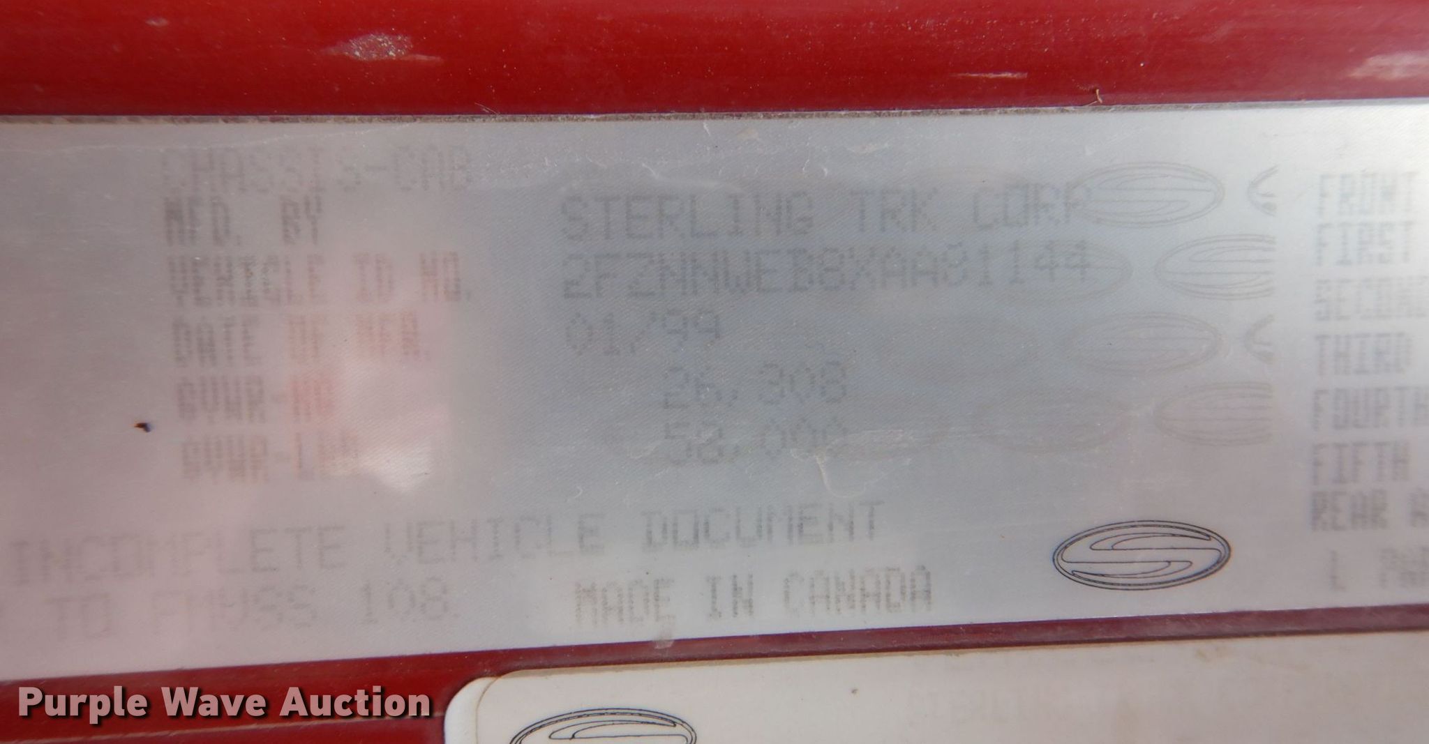 1999 Sterling LT9511 dump truck. Miles: 799,889 on odometer, VIN: 2FZNNWEB8XAA81144. Engine Caterpillar C12, Serial: 2KS01689, Displacement: 12.0L, Cylinders: 6, Fuel type: Diesel. Transmission Eaton Fuller 8LL, Manual, Speed: 10. Chassis Axles: Triple, Pusher axle, Differential lock: Full, Suspension: Spring over walking beam, Brakes: Air, PTO, GVWR: 58,000 lbs FAWR: 18,000 lbs, IAWR: 20,000 lbs, RAWR: 20,000 lbs. Interior AC, Heat, Heated mirrors, Cruise control. Features Dump bed American, 18' L x 95" W, Side height: 51", Side board height: 9", Bed type: Steel, Ram: Single , End gate: Air operated. Tires Front: 425/65R22.5, Rear: 11R22.5, Lift axle: 215/75R17.5. Notes Dash warning indicator: Stop engine. View repairs. Iowa title. Ringgold Rock & Hauling. 506 E. Adams. Mount Ayr, IA 50854