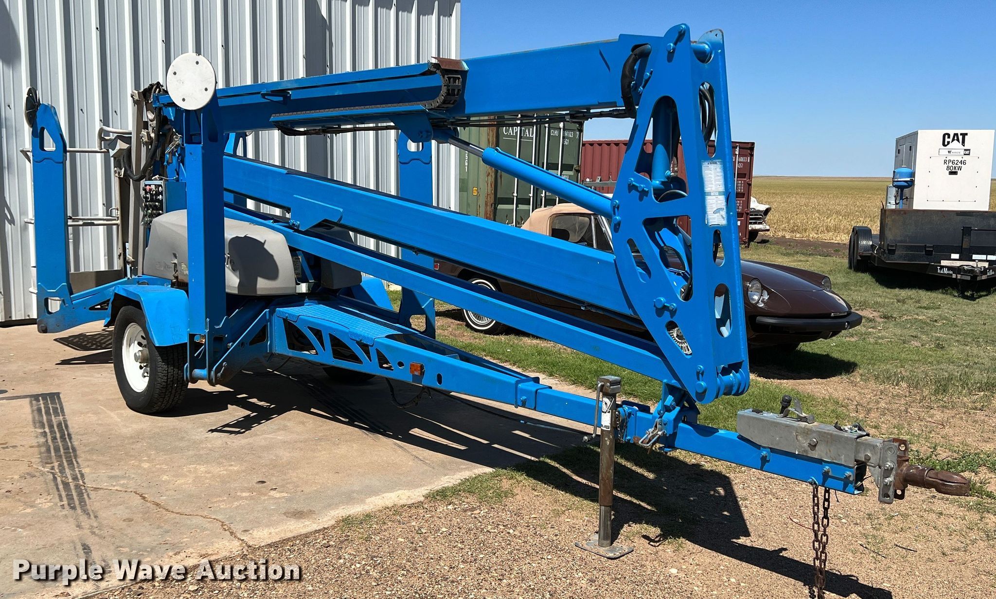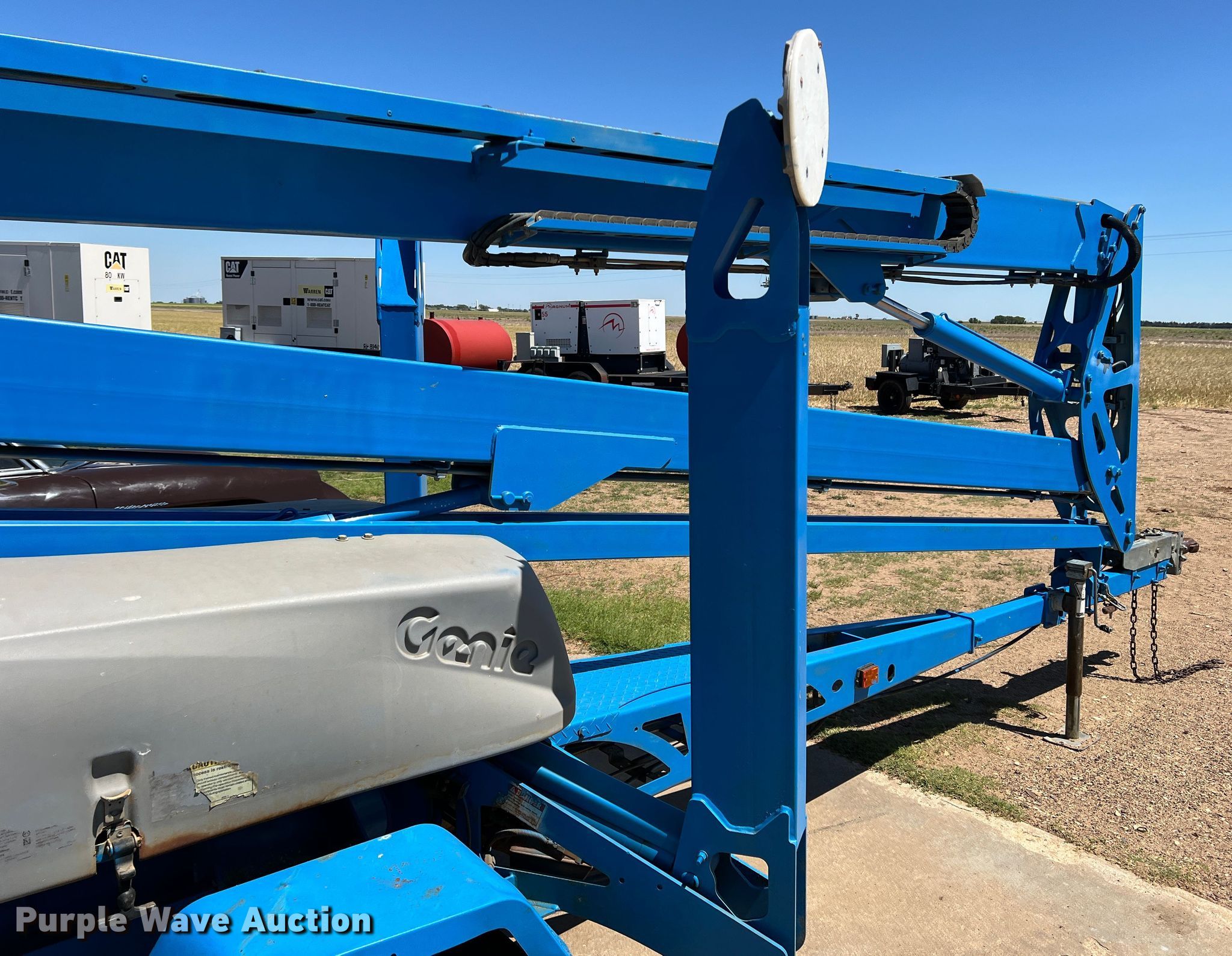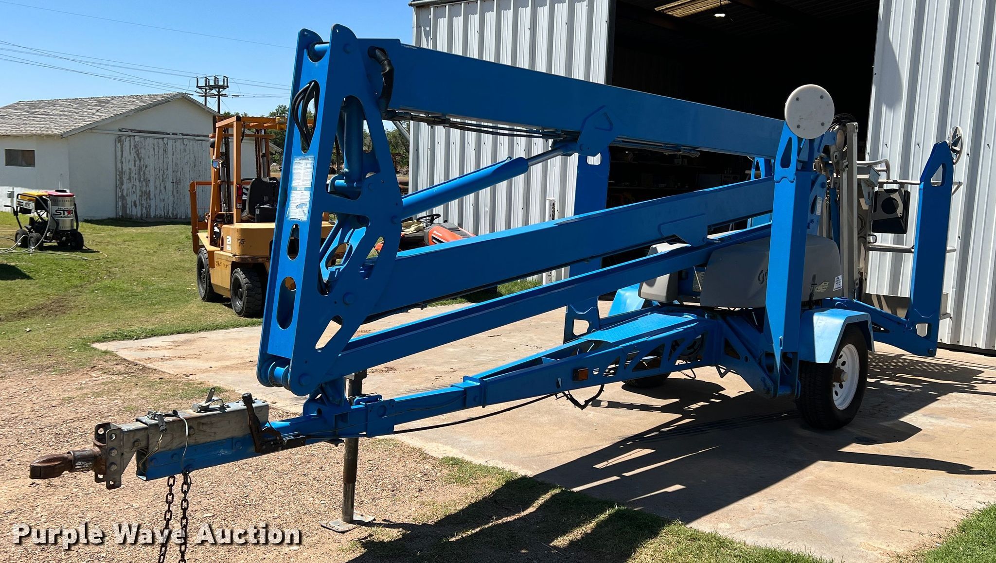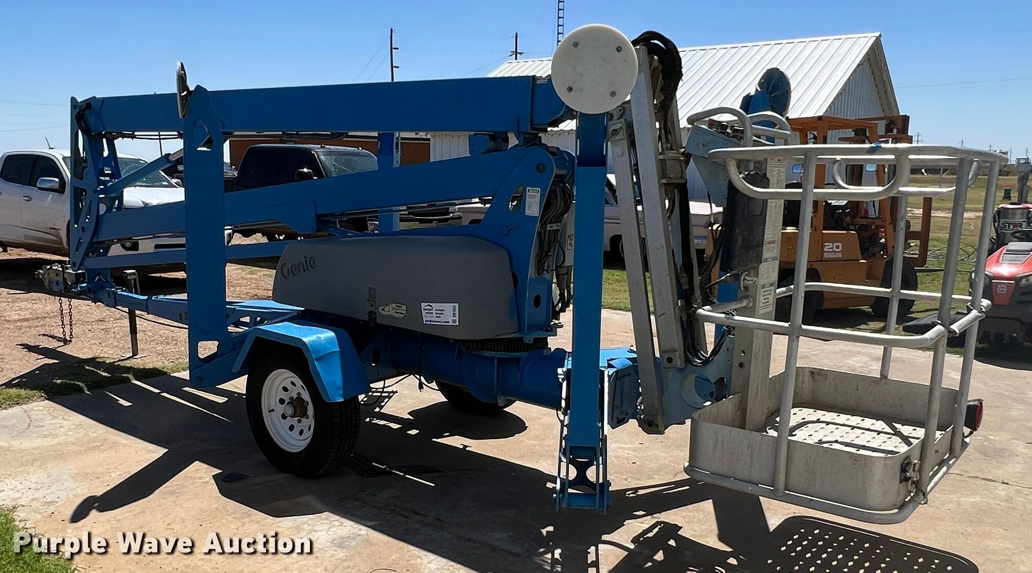 2006 Genie TZ50 boom lift. Hours: 170 on meter, VIN: 5D8AA23116R000430, Serial: TZ5006-430. Electric Motor Advanced AU2500. Features Articulating boom, Tow behind, Maximum lift capacity: 500 lbs, Maximum reach length: 50', Maximum lift height: 50', Hydraulic outriggers, Hydraulic extendable jib, Platform: 48" L x 29" W, AC power outlet, Controls: Platform, Ground, Platform rotation: Hydraulic. Tires Tire size: 225/75R15. Turpin, OK 73950
