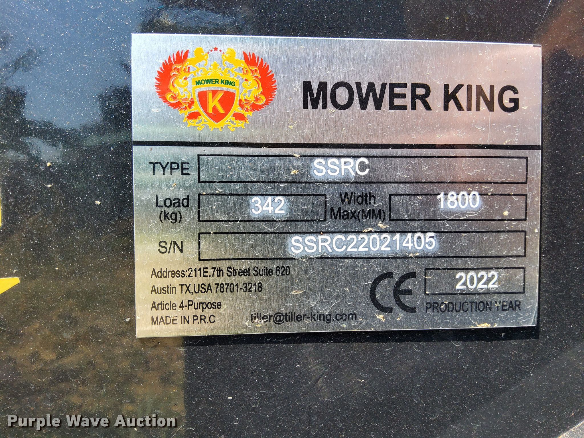 Purple Wave is selling a used Skid Steer Attach. in Texas. This item is a 2022 Mower King skid steer rotary mower with the following: Serial: SSRC22021405, Width: 72", Unused