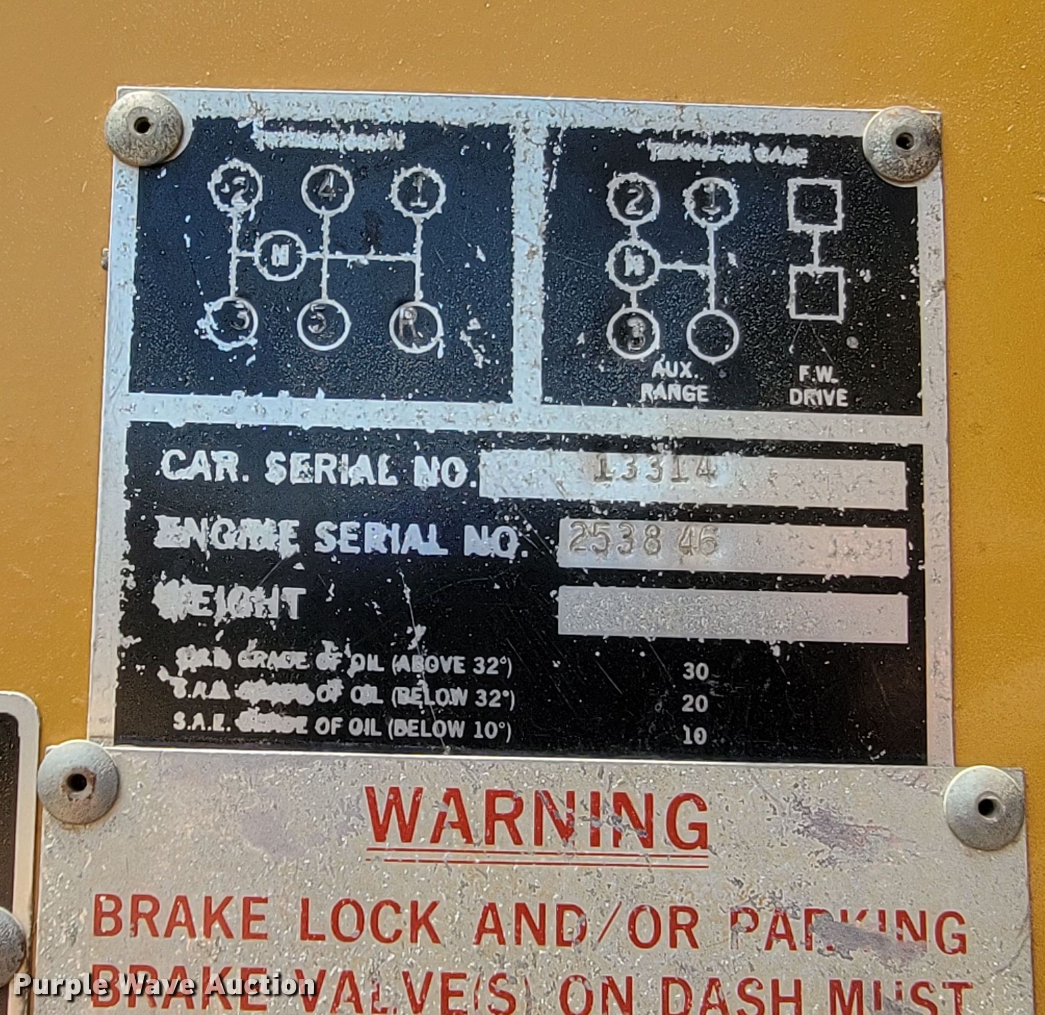 1970 Grove TM275LP crane. Hours: 1,177 on meter, Miles: Unknown, Hours: Unknown, Serial: 16018. Engine Cummins, Cylinders: 6, Fuel type: Diesel. Upper engine Make: Perkins, Cylinders: 6, Engine hours: 3,233, Fuel type: Diesel. Transmission Manual, Speed: 5, Auxiliary transmission speed: 3. Chassis Axles: Tandem, Suspension: Spring, Brakes: Air. Operators station Enclosed cab, Heat, Crane controls: Stick. Features Boom Telescopic, Boom length: 92', Sections: 4, Maximum lift capacity: 60,000 lbs, Maximum lift height: 115', Jib: 20', Stabilizers: 4, Boom controls In-cab, Winches: 1, Removable counter weight, Crane block Sheaves: 3, Crane ball & hook, Manuals, Lift chart. Tires Front: 315/80R22.5, Rear: 11.00-20. Notes Glass cracked, Dead battery, Hydraulic leaks, Intermittent front left outrigger hydraulic issues. South Dakota title. Title distribution may be delayed up to 14 days from verification of funds. Norfeld Colony. 20426 482nd Avenue. White, SD 57276