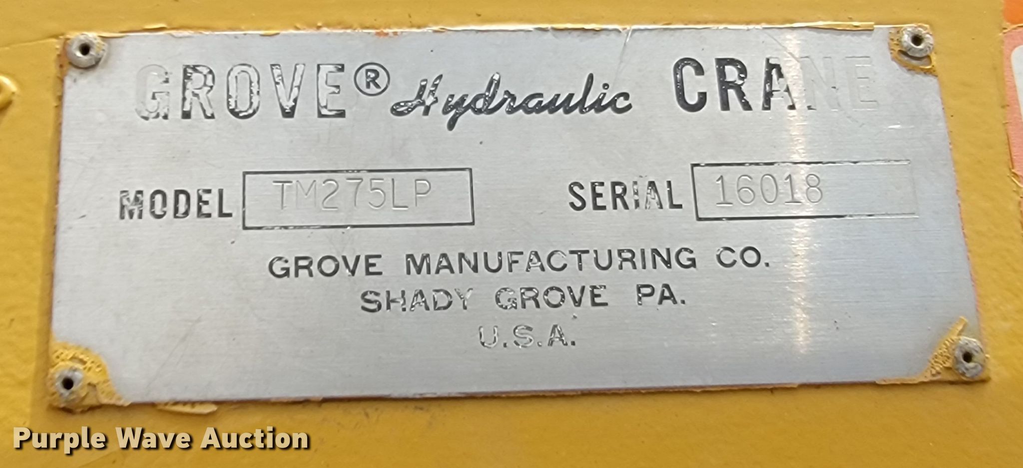 Purple Wave is selling a used Truck Crane in South Dakota. This item is a 1970 Grove TM275LP crane with the following: Hours: 1,177 on meter, Miles: Unknown, Hours: Unknown, Serial: 16018