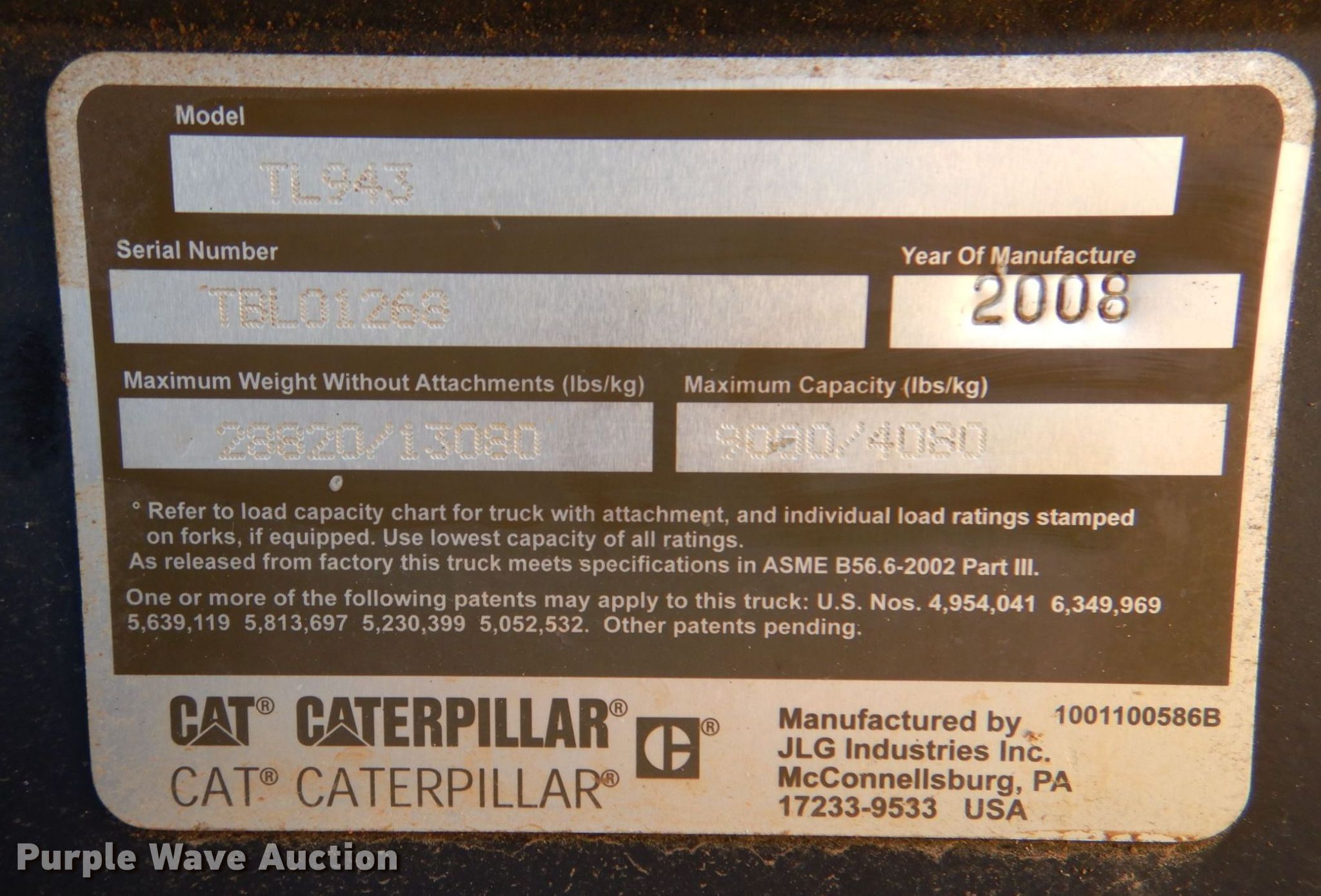 2008 Caterpillar TL943 telehandler. Hours: 5,786 on meter, Serial: TBL01268. Engine Caterpillar, Cylinders: 4, Fuel type: Diesel. Transmission Powershift, 4F - 4R, Four wheel drive. Operators station Canopy, Steering: Crab, Four wheel. Features Maximum lift capacity: 9,000 lbs, Maximum lift height: 43', Boom stages: 3, Side shift, Fork length: 72". Tires Front: 13.00-24. BNB Industries. Wynnewood, OK 73098