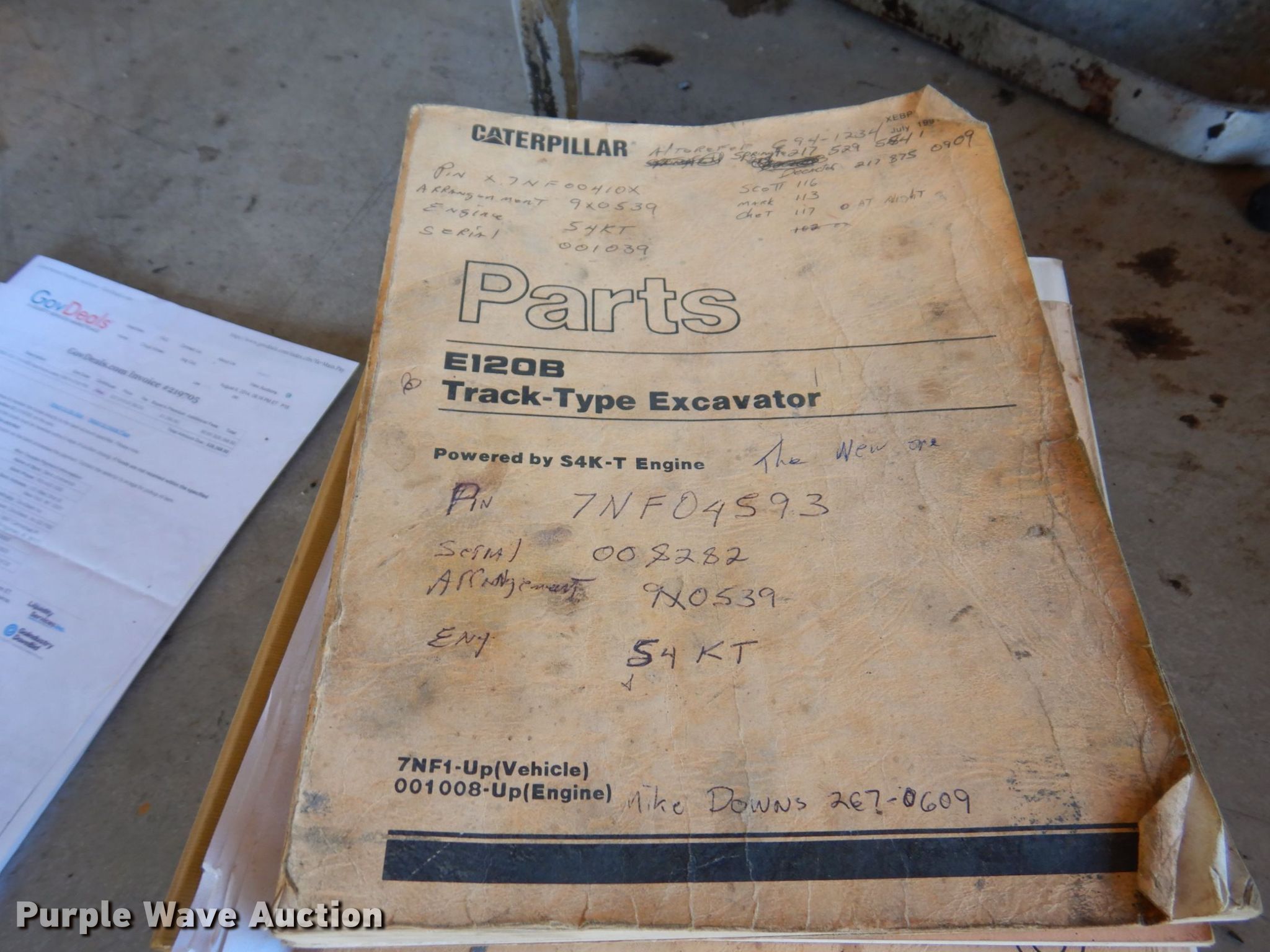 1989 Caterpillar E120B excavator. Hours: 6,880 on meter, Miles or hours may vary, unit still in use, Serial: 008282. Engine Model: S4KT, Cylinders: 4, Fuel type: Diesel. Transmission Hydrostatic, Two speed travel. Operators station Enclosed cab, Heat, Pattern changer. Features Boom Standard, Stick Stick length: 9' 10", Thumb: Manual, Bucket Width: 47", Cutting edge: Bolt on, Teeth: 6, Bucket Width: 25". Tracks Width: 27.5", Steel, Grouser pads: Triple. Notes Additional parts, Front glass cracked, Dash warning indicator: Battery. Chuck Kinsel Trucking & Excavating. 1675 E Walnut St. Canton, IL 61520