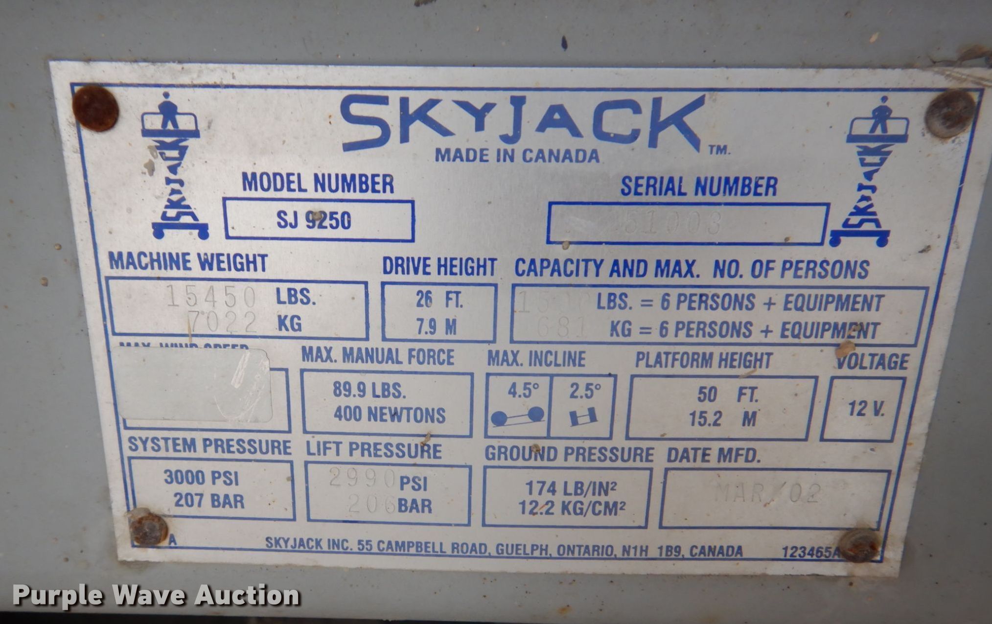 Purple Wave is selling a used Scissor or Vertical Lift in Missouri. This item is a 2002 Skyjack SJ9250 scissor lift with the following: Hours: 2,908 on meter, Serial: 51003