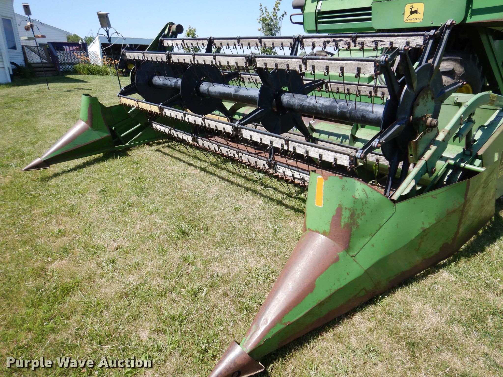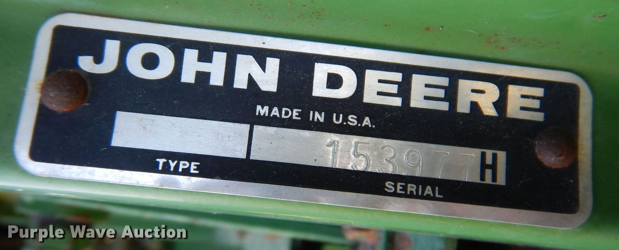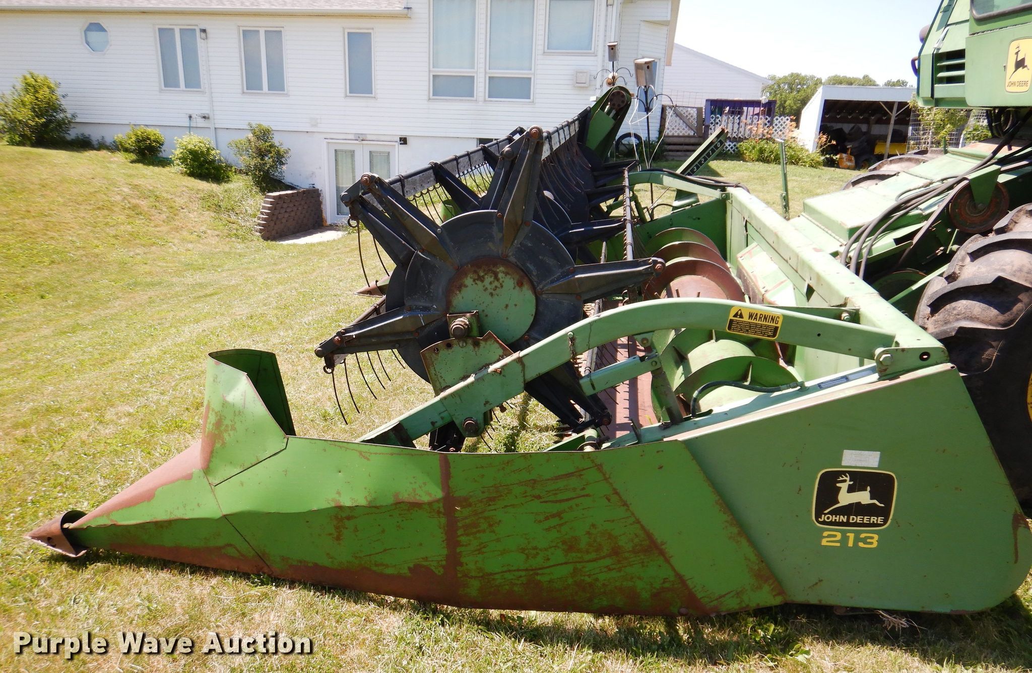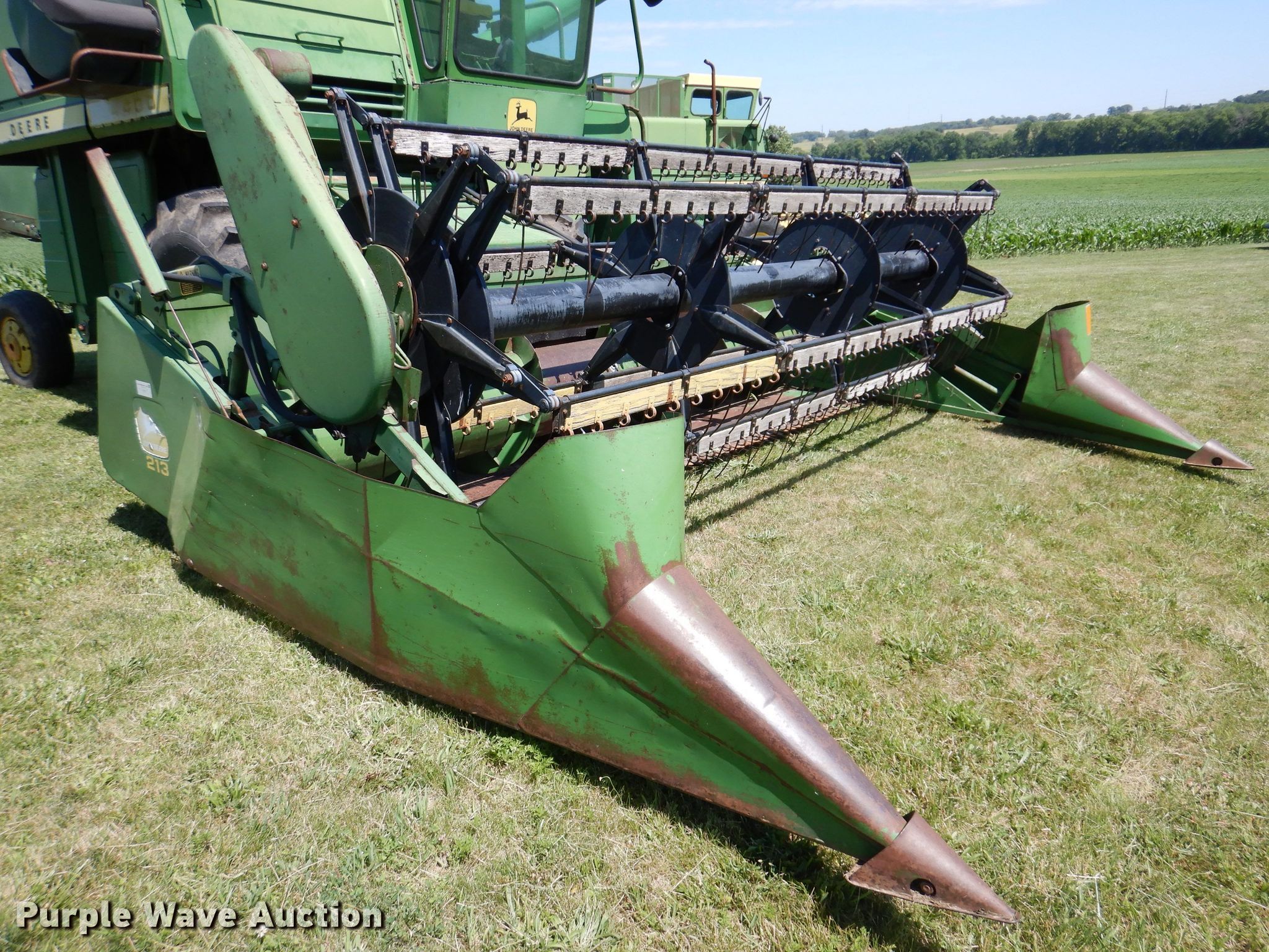 1975 John Deere 4400 combine. Engine hours: 3,829 on meter, Serial: 153977H. Engine John Deere, Serial: 355058T, Cylinders: 6, Fuel type: Diesel. Transmission Manual, 4F - 1R. Interior Heat. Features Chaff spreader, Unloading auger length: 11', Rigid head John Deere 213, Serial: H00200X586749, Reel: Bat, Finger Hydraulic reel height control, Drivelines: Dual. Tires Front: 18.4-26TZ19, Rear: 11L-16. 1690 Wind Wood Trail. Prole, IA 50229
