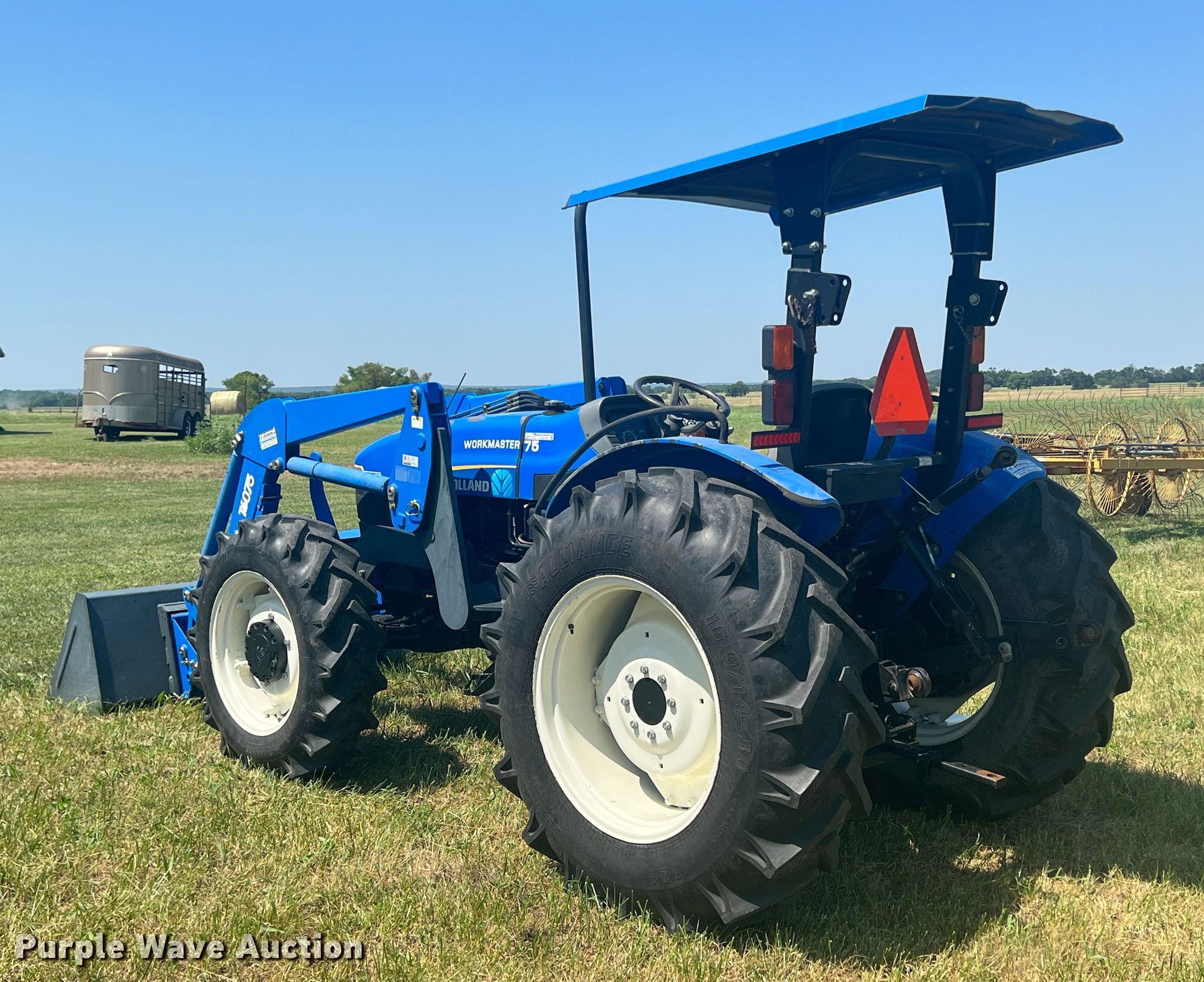 2015 New Holland Workmaster 75 MFWD tractor. Hours: 522 on meter, Serial: NH1287080. Engine Cylinders: 4, Fuel type: Diesel, HP: 75. Transmission Synchro, 8F - 2R. Features PTO: 540, Three point Top link, Hydraulic remote sets Rear: 2, Loader Ansung T6075-QB, Quick attach, Controls: Joystick, Bucket Width: 72".. Tires Front: 11.2/10-24, Rear: 16.9/14-30. Independence, KS 67301