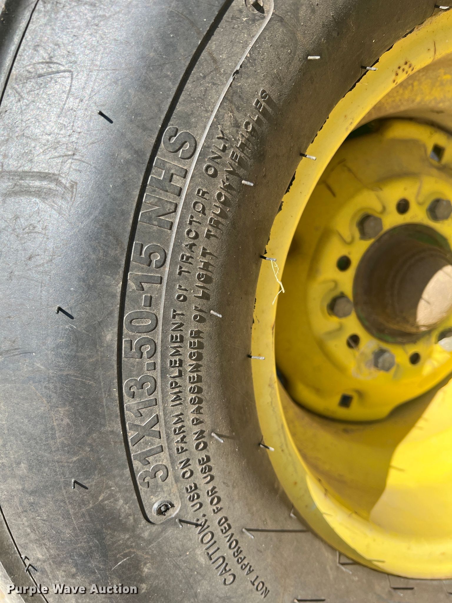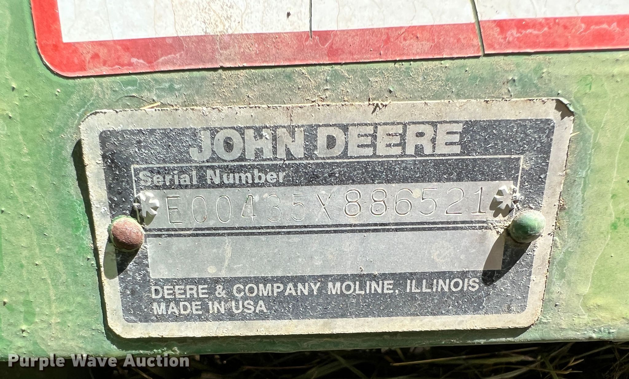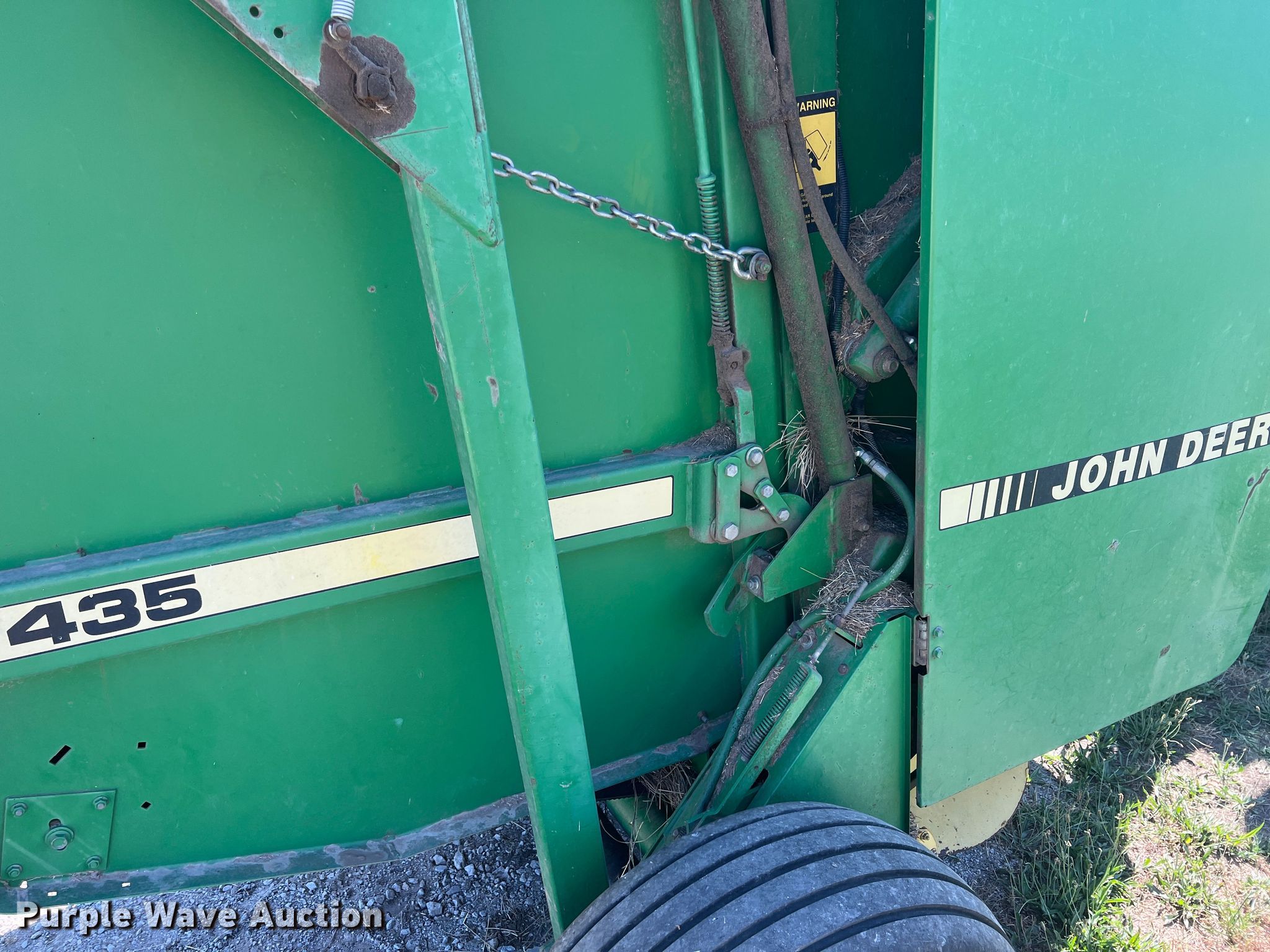 1991 John Deere 435 round baler. Serial: E00435X886521. Features PTO: 540, Monitor John Deere Bale-Trak, Pickup width: 4', Hydraulic pickup lift, Bale size: 4'x6', Twine tie, Bale kicker. Tires Size: 31x13.50-15. Davis Dirt Works. 14310 South Hwy 88. Claremore, OK 74017