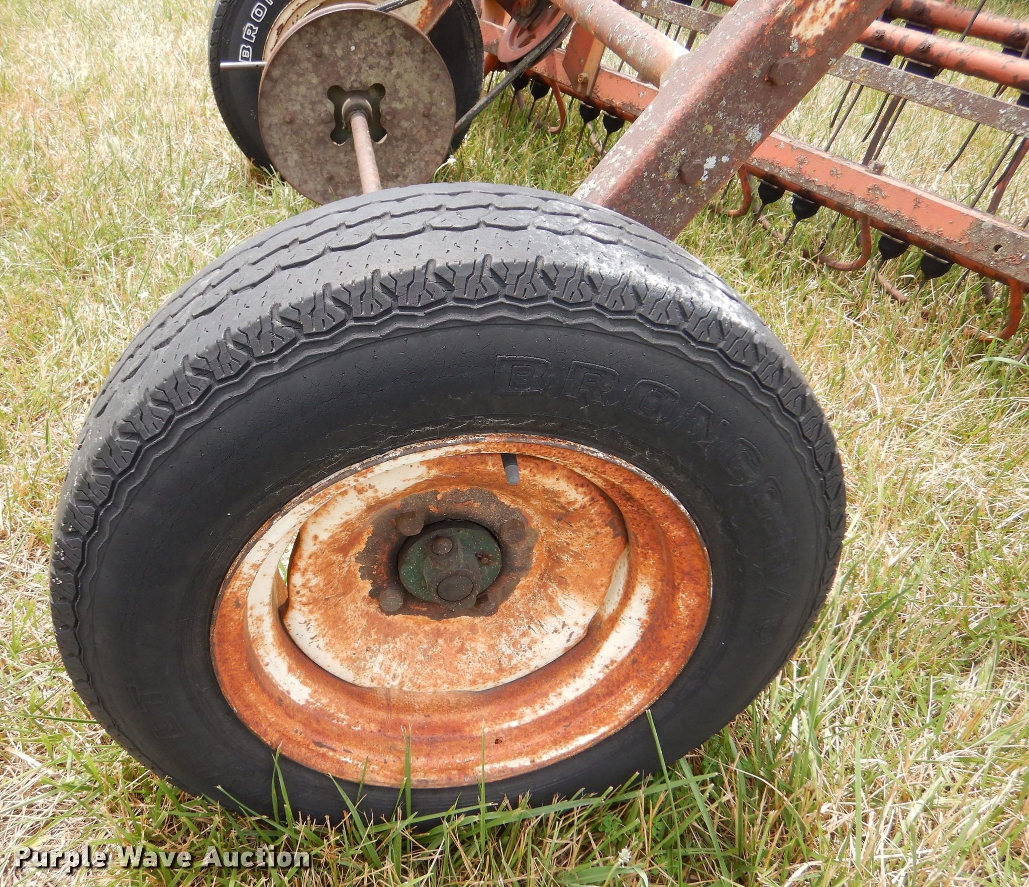 AVCO New Idea hay rake. Serial: R-158150. Features Width: 10'. Tires Size: 195/75R14. 308 Southeast 1st Lane. Lamar, MO 64759