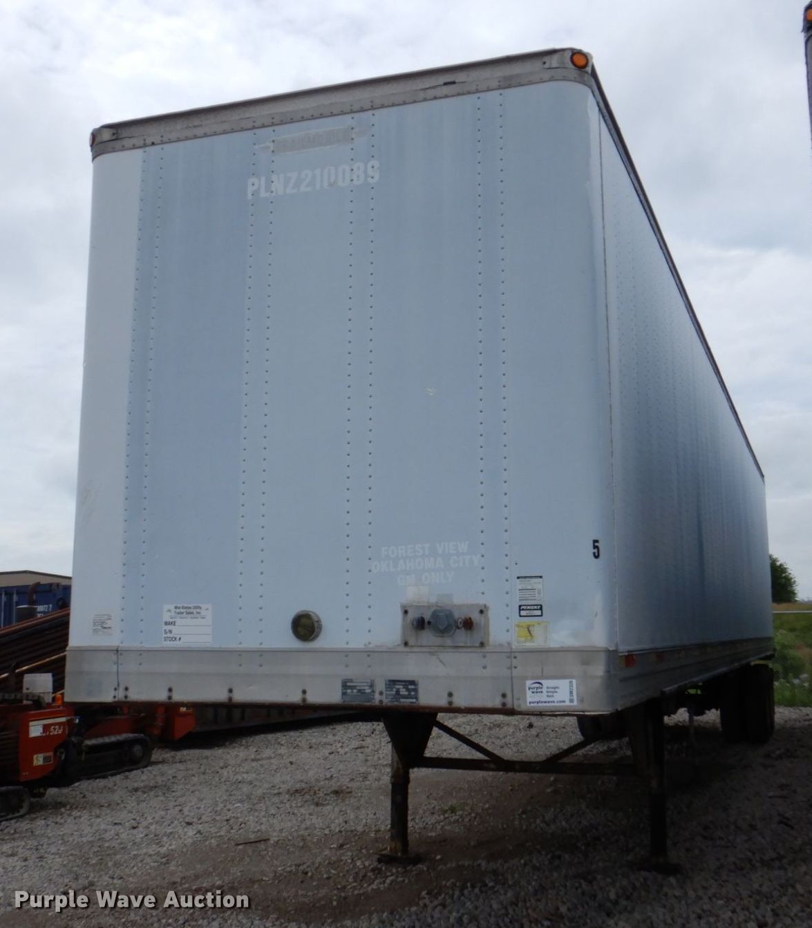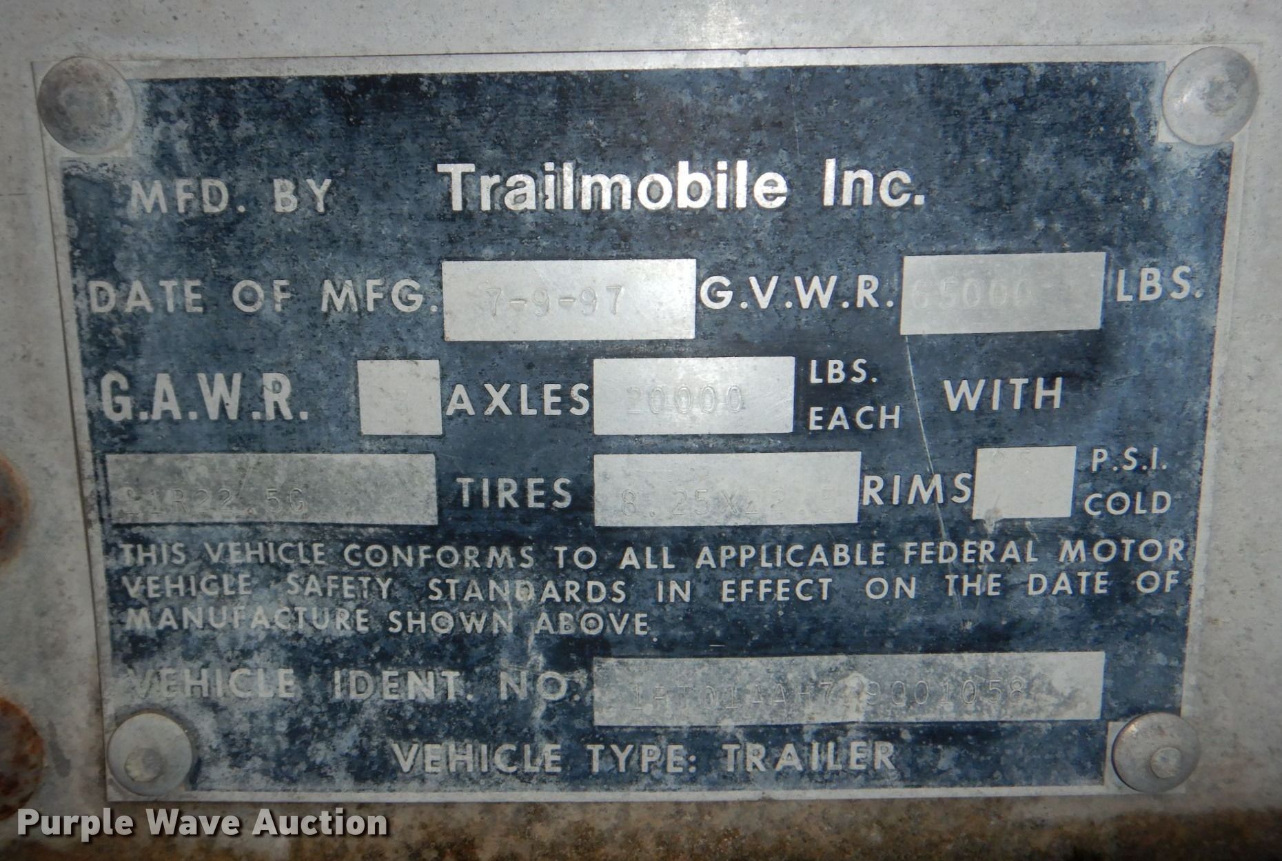 1998 Trailmobile Inc. 01AA-1UAL dry van trailer. VIN: 1PT01AAH7W9001058. Dimensions Overall: 48' L x 102" W. Features Deck type: Wood. Chassis Landing gear: Dual, Two speed, Suspension: Spring, Brakes: Air, Axles: Tandem, GVWR: 65,000 lbs, GAWR: 20,000 lbs. Tires Steel wheels, Size: 11R22.5. Nebraska title. Neuvirth Construction. 3400 Old Mormon Bridge Rd. Crescent, IA 51526