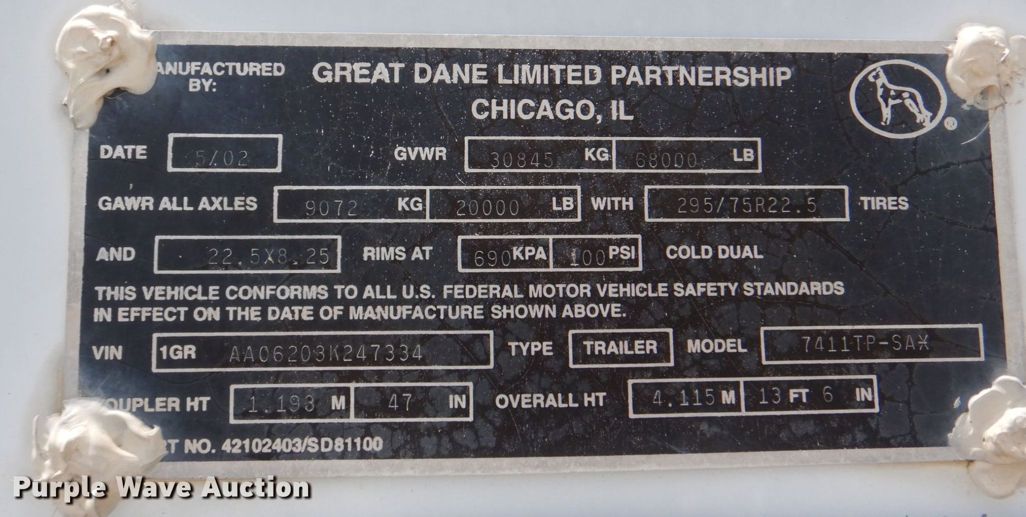 2003 Great Dane 7411TP-SA dry van trailer. VIN: 1GRAA06203K247334. Dimensions Overall: 53' L x 102" W. Features Deck type: Wood. Chassis Landing gear: Dual, Two speed, Suspension: Air, Brakes: Air, Axles: Tandem, GVWR: 68,000 lbs, GAWR: 20,000 lbs. Tires Steel wheels, Size: 295/75R22.5. Nebraska title. Neuvirth Construction. 3400 Old Mormon Bridge Rd. Crescent, IA 51526