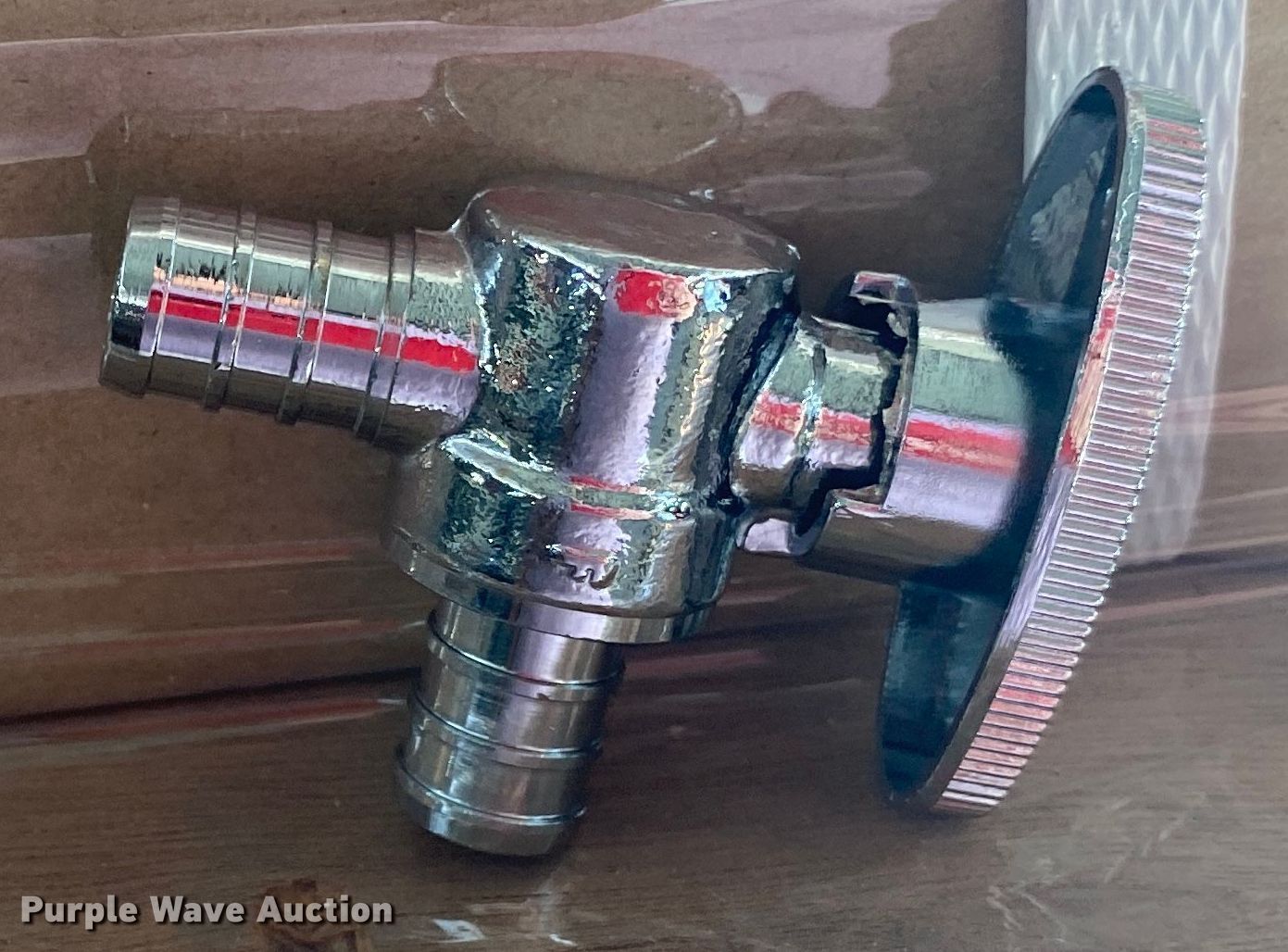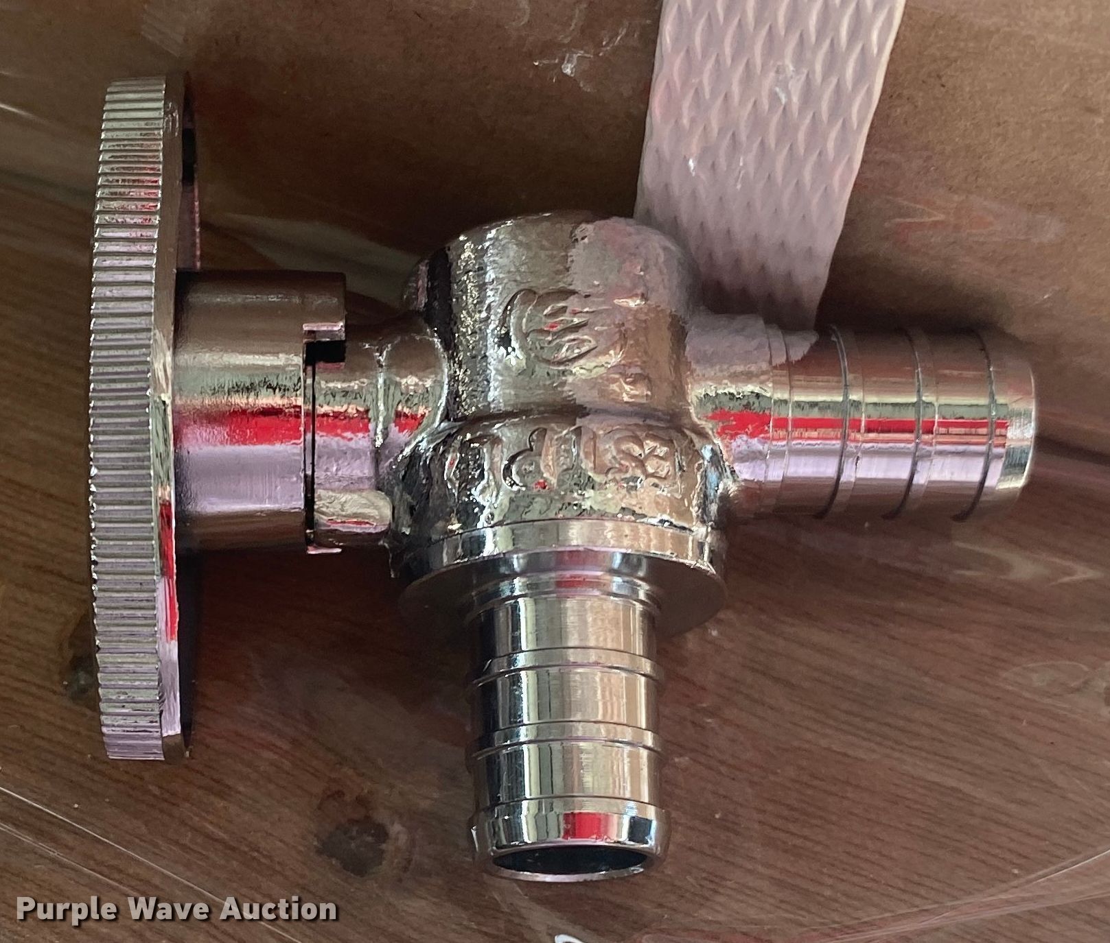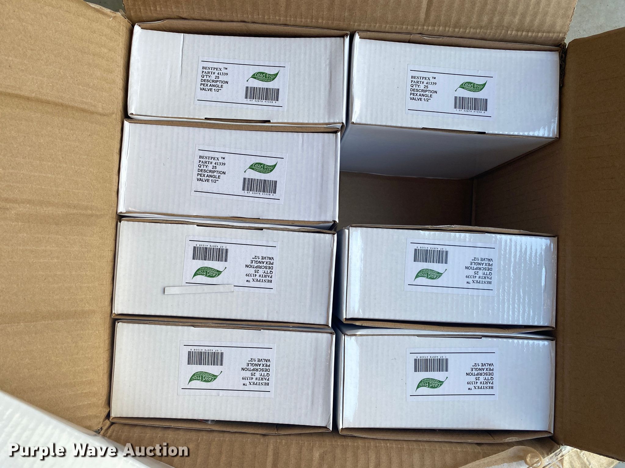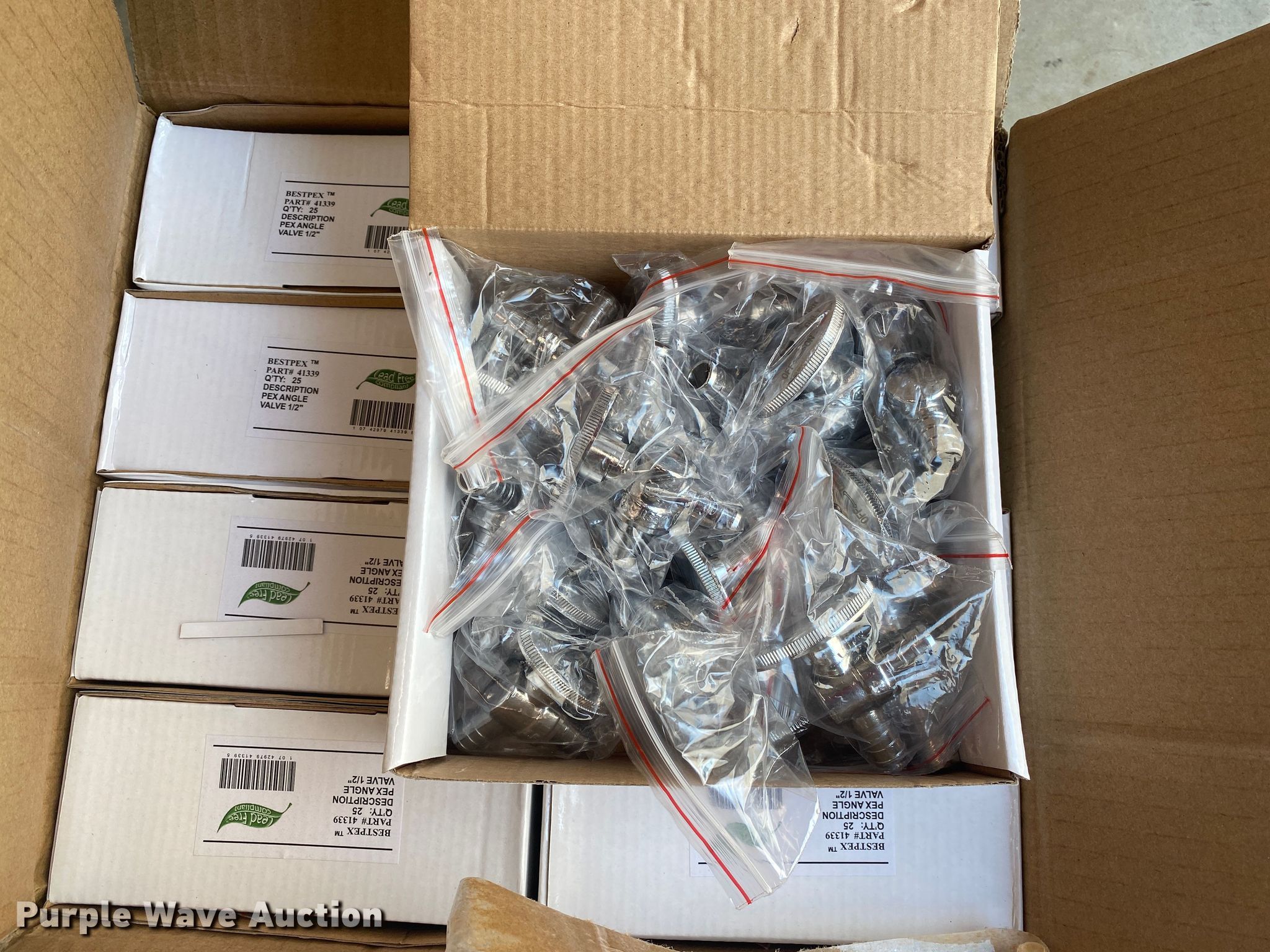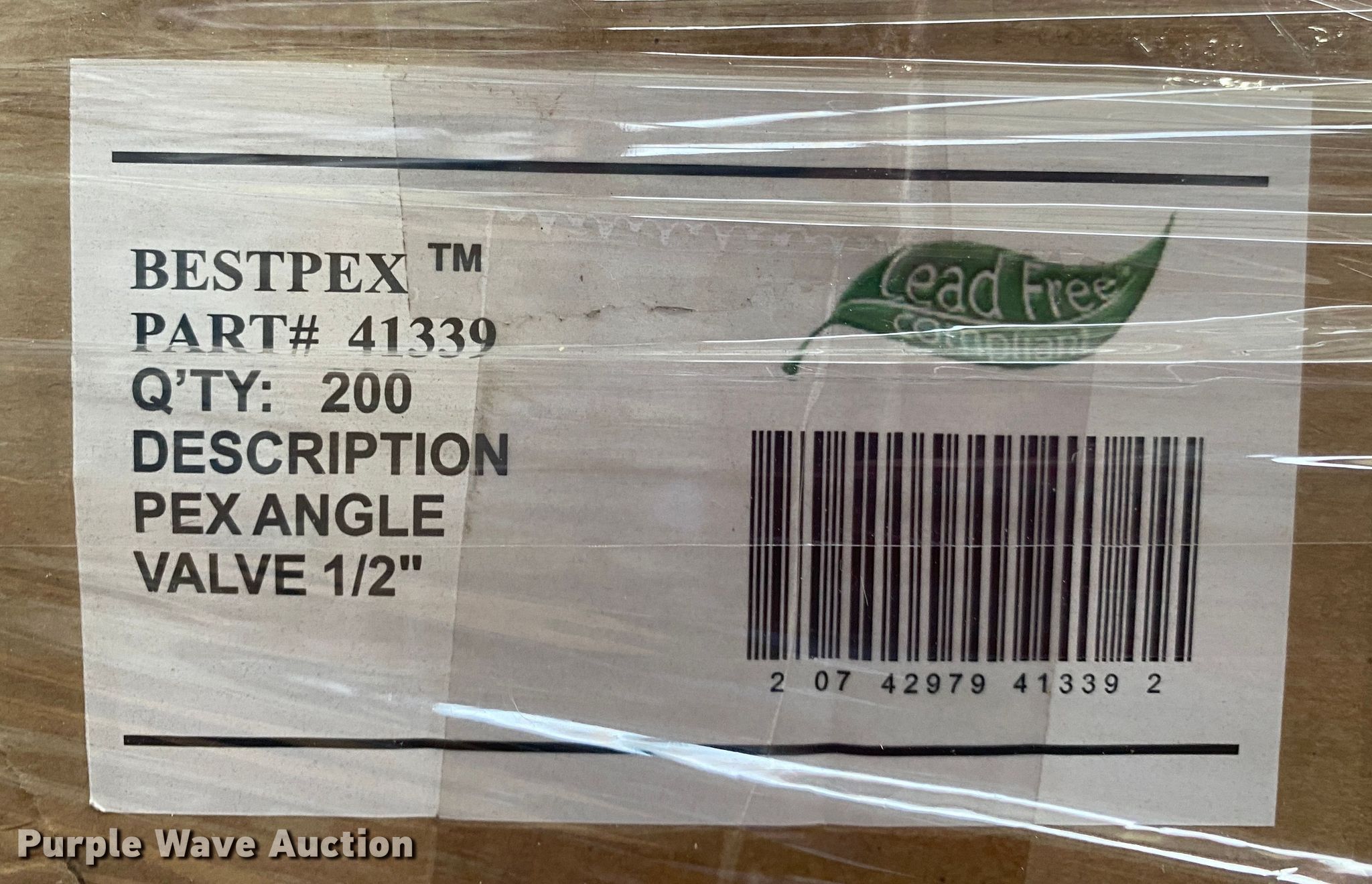 Purple Wave is selling a used Building Materials in Oklahoma. This item is a (45) cases of plumbing parts with the following: Bestpex, Part no: 41339, Pex angle valve, 1/2", 200 pieces per case