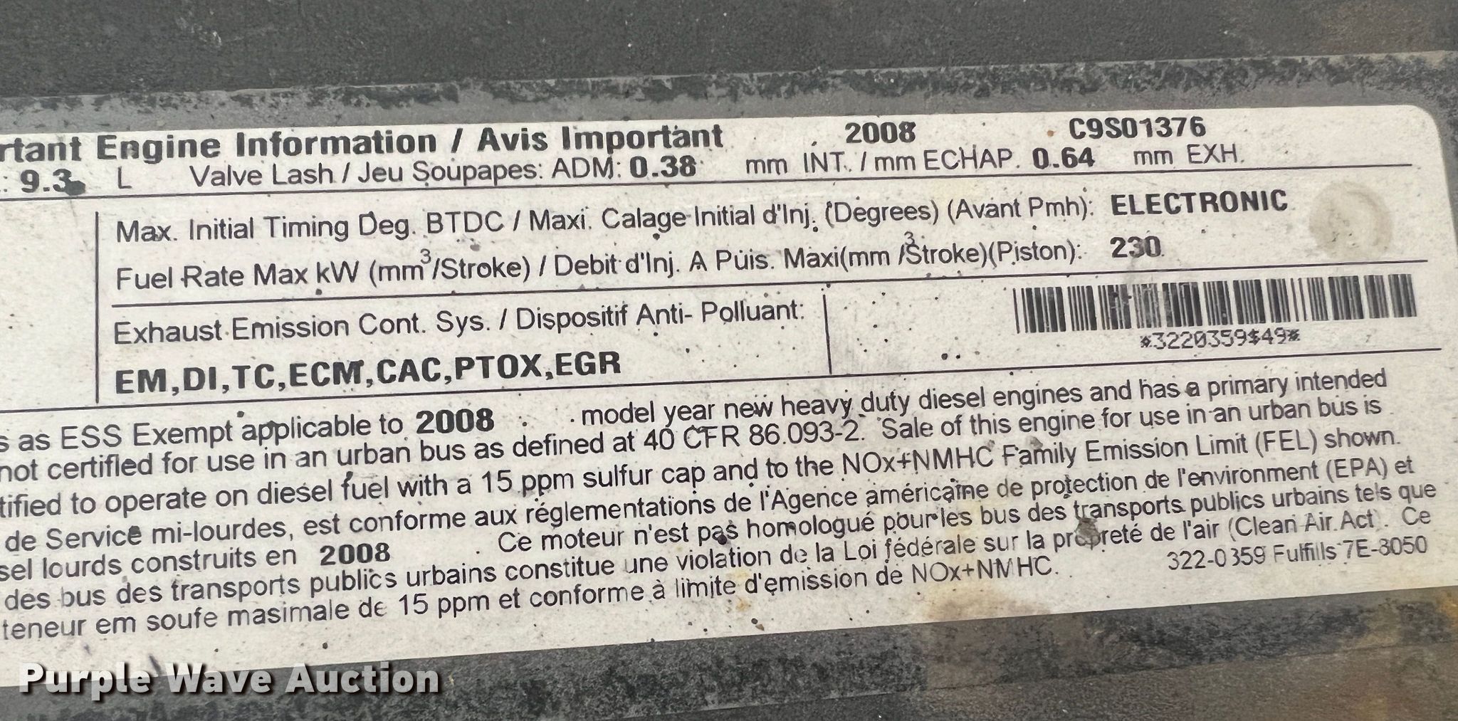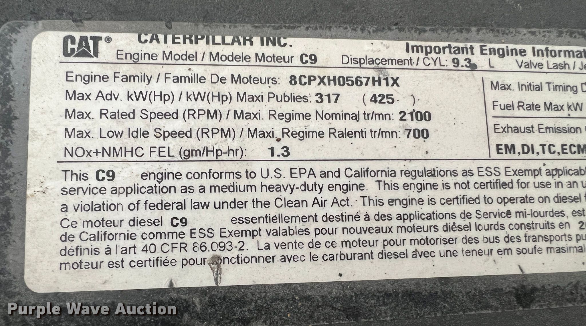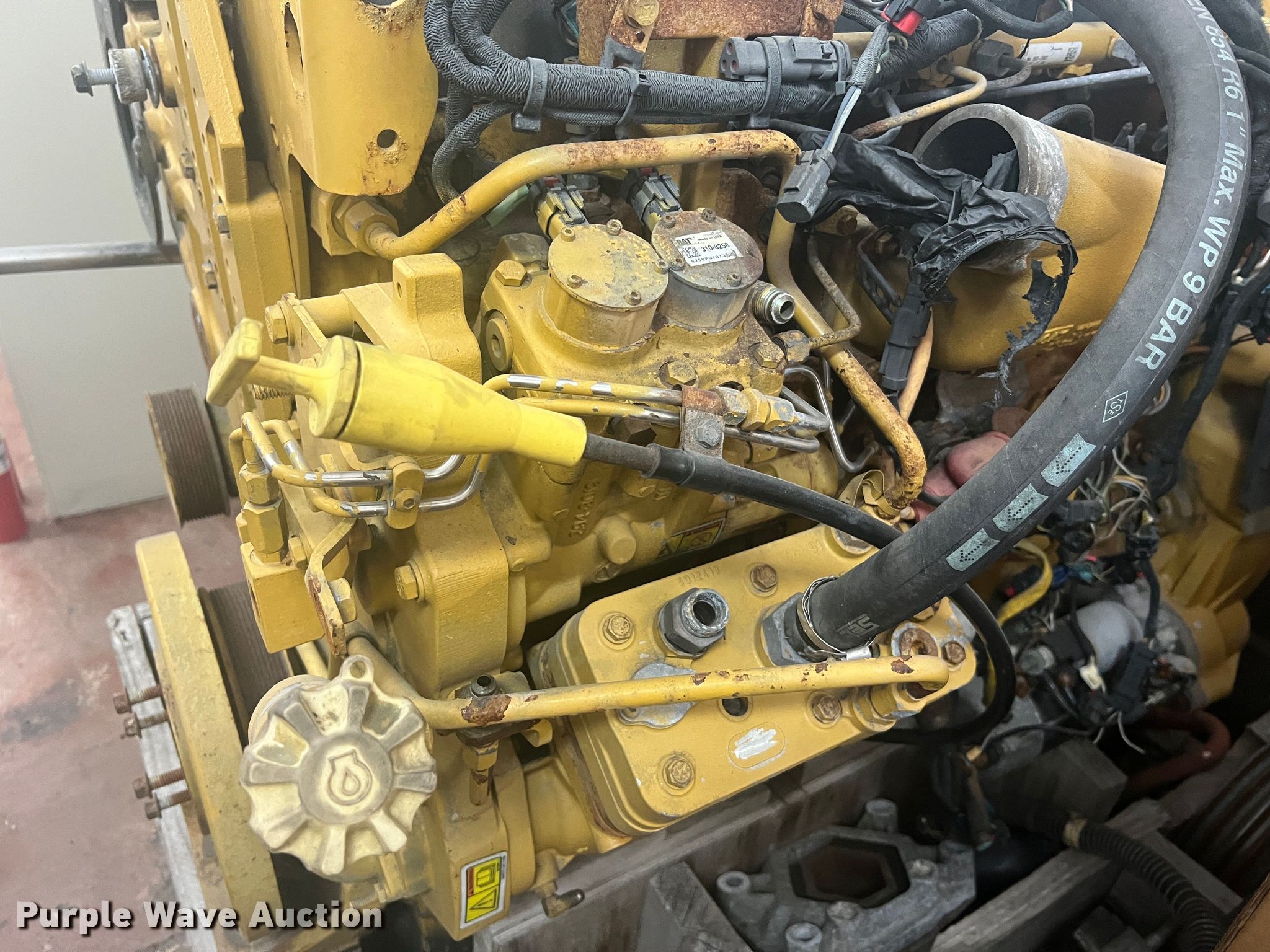 Purple Wave is selling a used Engine in Missouri. This item is a Caterpillar C9 engine with the following: Serial: 8CPXH0567H1X, Displacement: 9.3L, Cylinders: 6, Fuel type: Diesel, HP: 425, Unknown operating condition