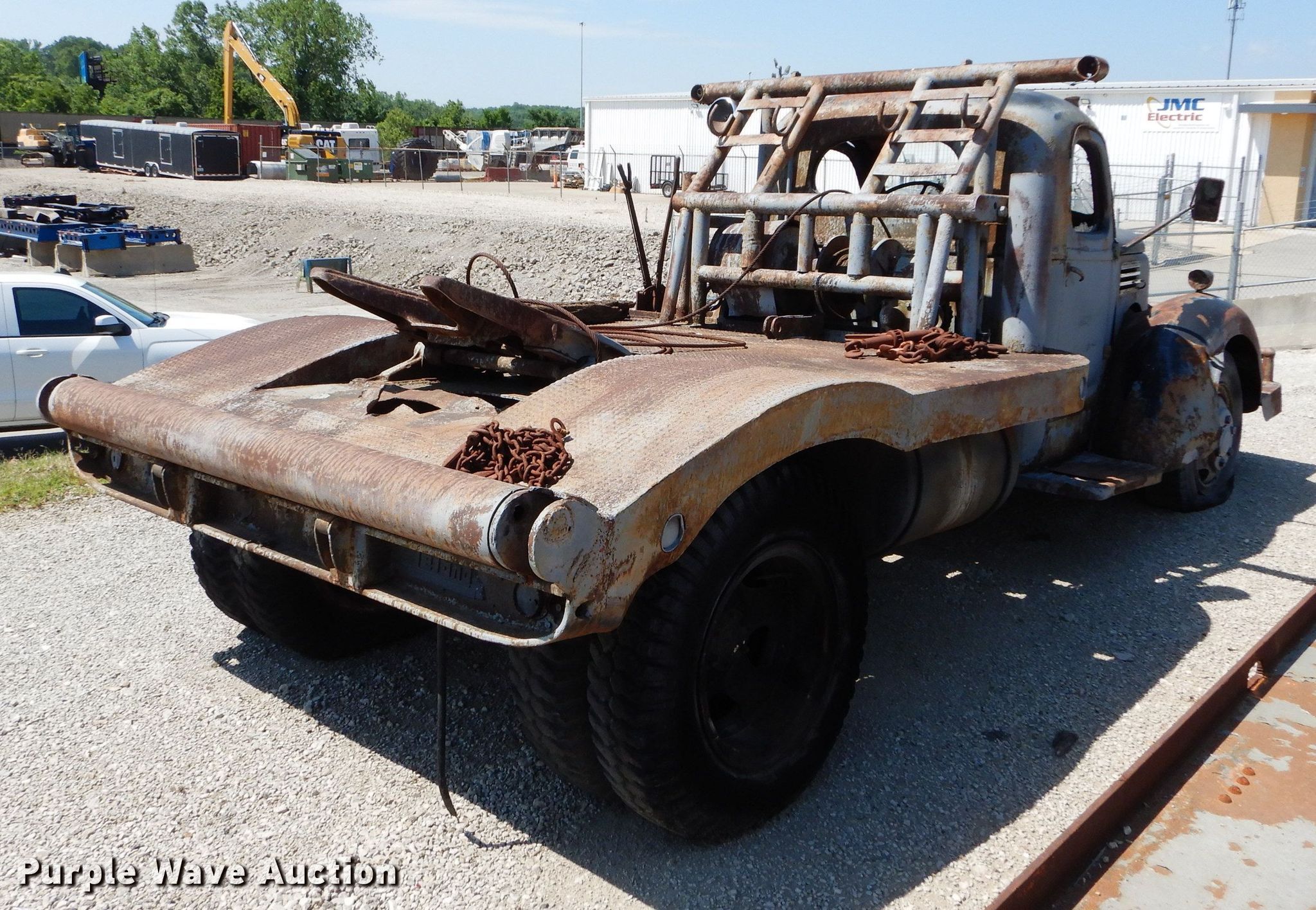 1946 International KS6-250 winch truck. VIN: KS6-16161. Engine International, Cylinders: 6, Fuel type: Gas. Transmission Manual. Chassis Axles: Single, Suspension: Spring, GVWR: 4,000 lbs. Features Flatbed, Winch, Braden M5 180 winch, Fifth wheel plate. Tires Size: 8.25-20. Notes Glass broken , Non-operational unit. Transfer of ownership documentation will be an Kansas antique bill of sale TR-312. This form is the only ownership documentation that will be provided and is sufficient for an Kansas buyer to apply for an Kansas title. Bidders are responsible for verifying if this is sufficient to obtain title in their jurisdiction prior to bidding. Ernie Rieke Equipment Co.. 3311 Merriam Ln. Kansas City, KS 66106