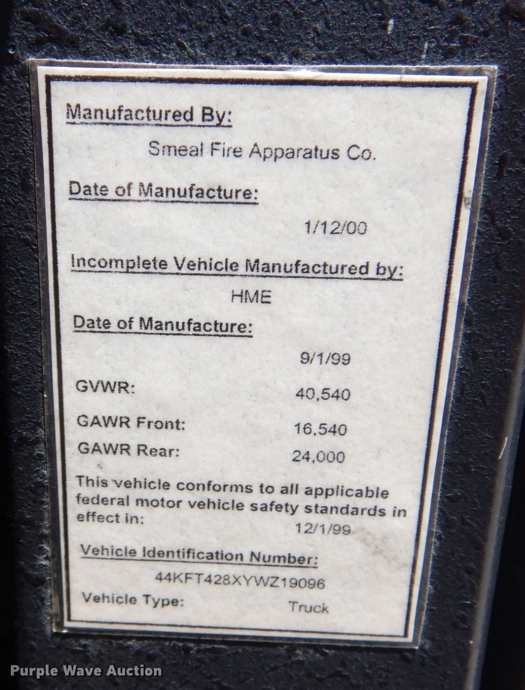 2000 HME 1871 pumper fire truck. Miles: 29,598 on odometer, Hours: 6,127 on meter, VIN: 44KFT428XYWZ19096. Engine Detroit Diesel Series 60, Cylinders: 6, Fuel type: Diesel. Transmission Automatic. Chassis Axles: Single, Suspension: Spring, Brakes: Air, GVWR: 40,540 lbs. Interior AC, Heat, Heated mirrors. Features Fire truck body Elevated deck gun, Pump 1,500 gpm, Generator Hydraulic.. Tires Front: 315/80R22.5, Rear: 11R22.5. Notes Unknown operating condition generator. Missouri title. Seller is a Missouri licensed motor vehicle dealer. Title will be assigned and distributed by the dealer. Please contact the seller for distribution questions. Sentinel Emergency Solutions. St. Louis, MO 63146