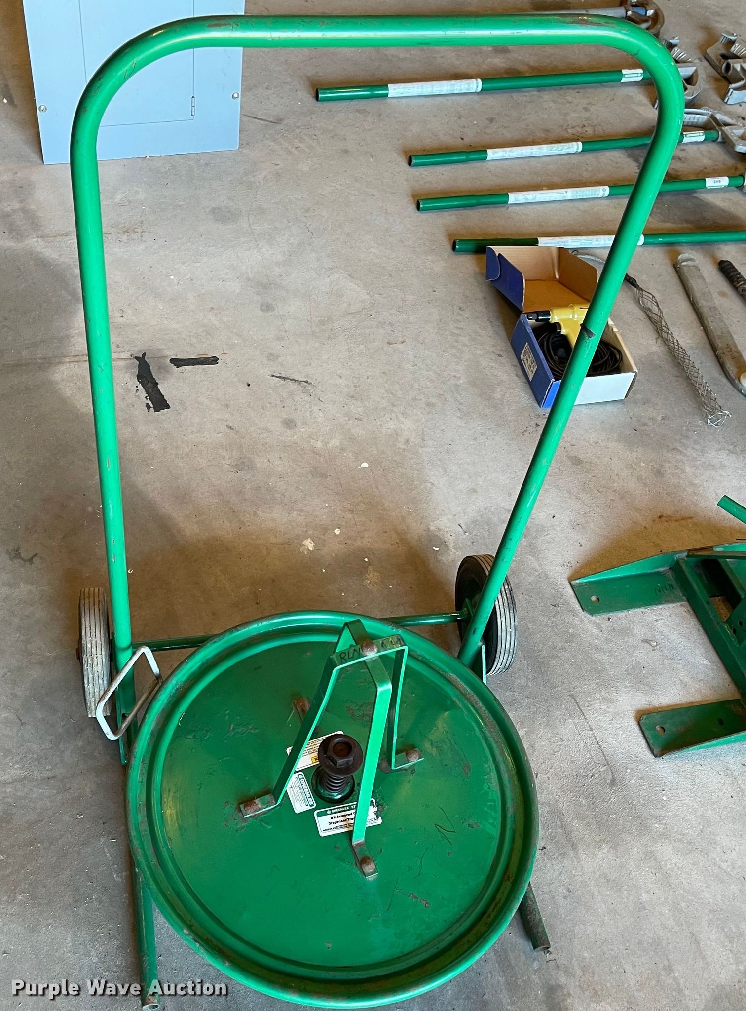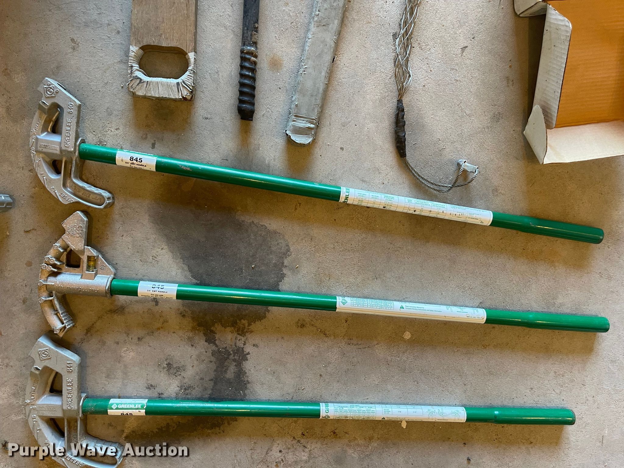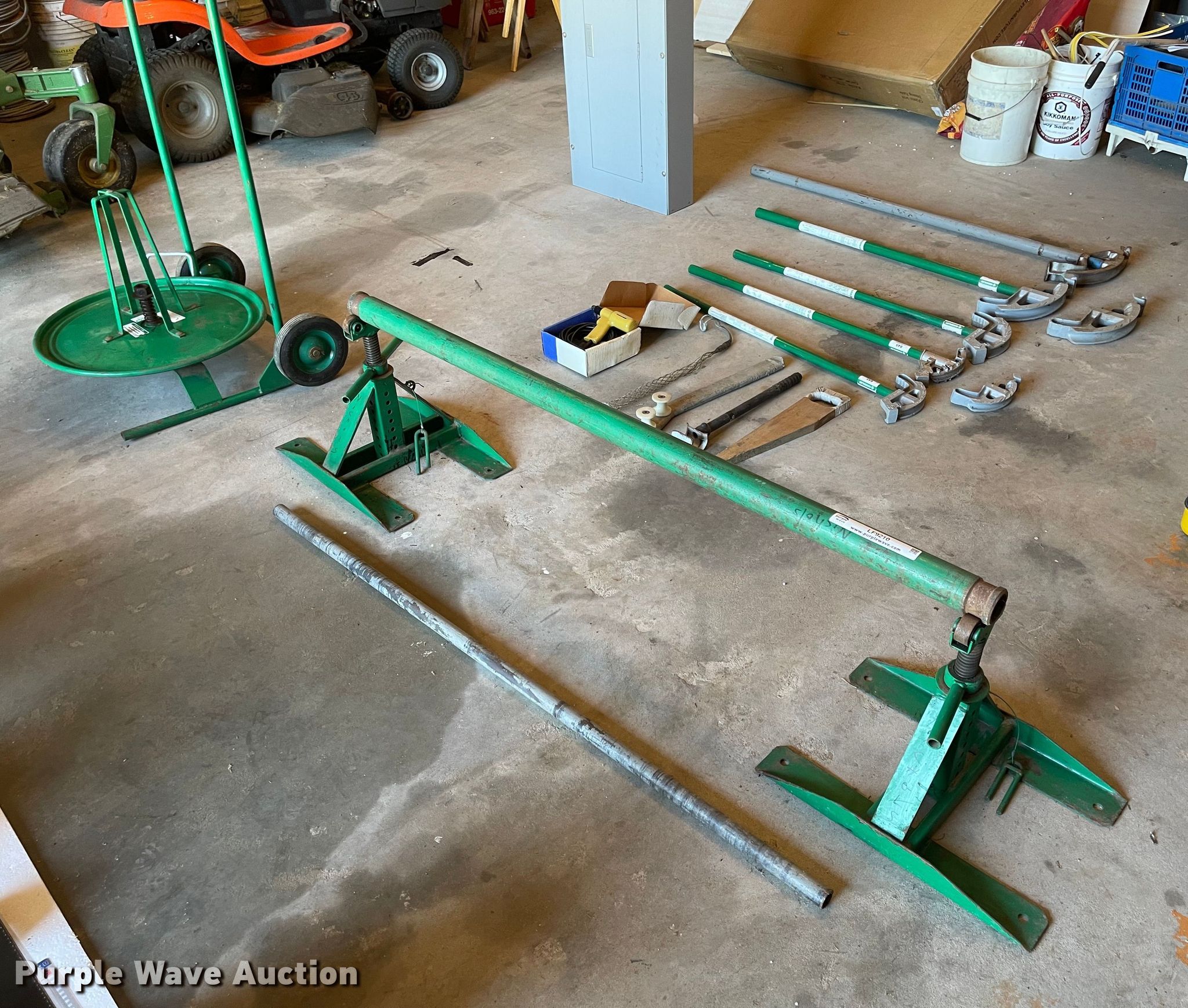 Purple Wave is selling a used Tools in Missouri. This item is a Tools with the following: Greenlee cable dispenser, Greenlee cable reel, Jack stands, Greenlee conduit benders, (2) 1/2", 3/4", 1", 1 1/4", 1/2" head, No handle, 1" head, No handle,, Cable bending tools, Albers Mfg Type PRL3 panelboard, 225 rated amps, 120/240V, Single phase, Three wire