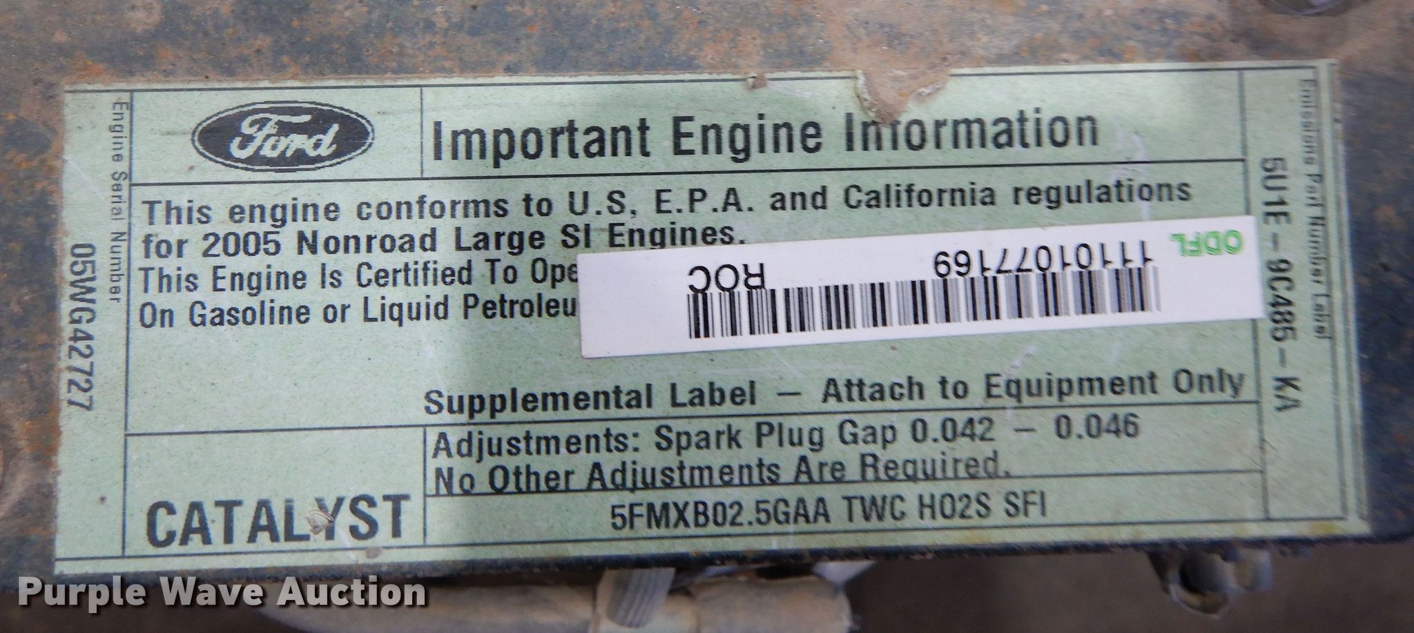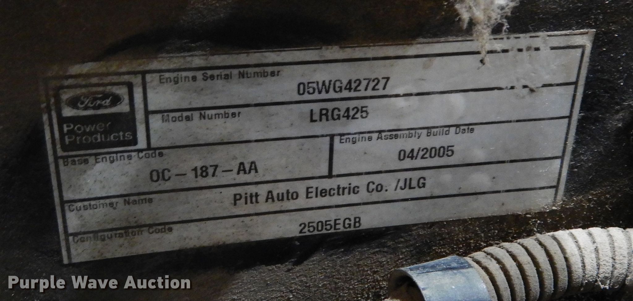 2005 Ford LRG425 engine. Serial: 05WG42727, Cylinders: 4, Fuel type: Dual fuel. Notes Removed from JLG series telehandler. 5280 Towing - Open Inspection August 9th. 895 5th Avenue. Brighton, CO 80603