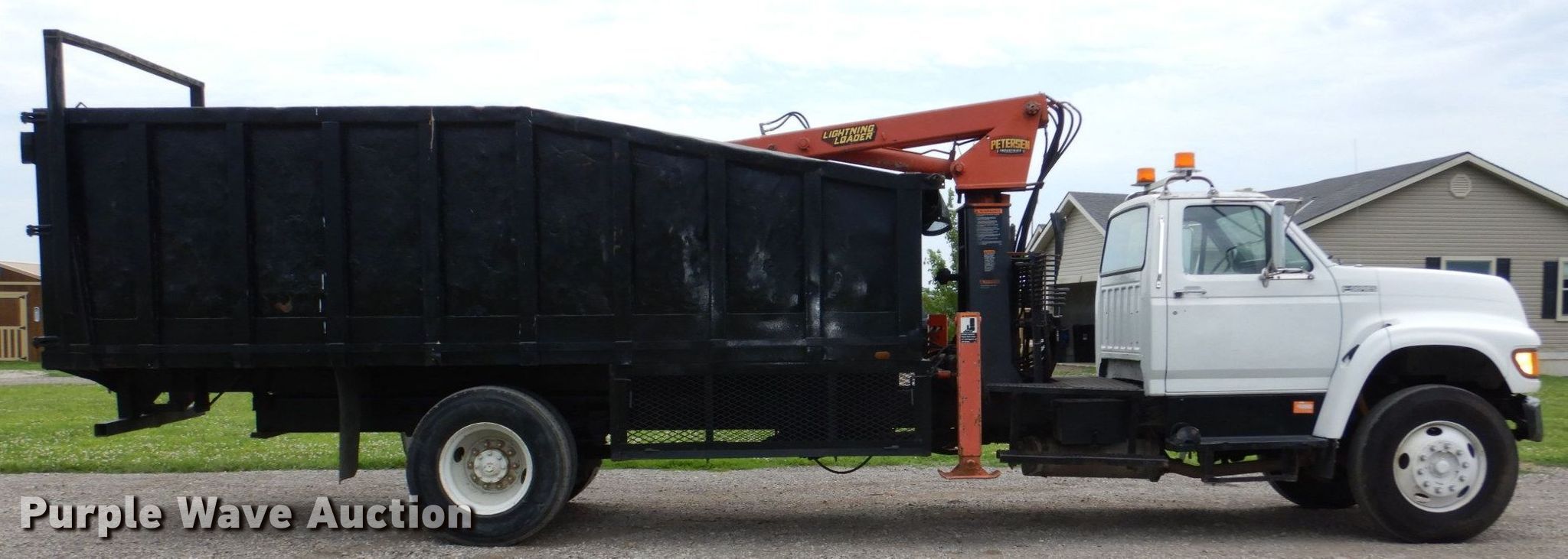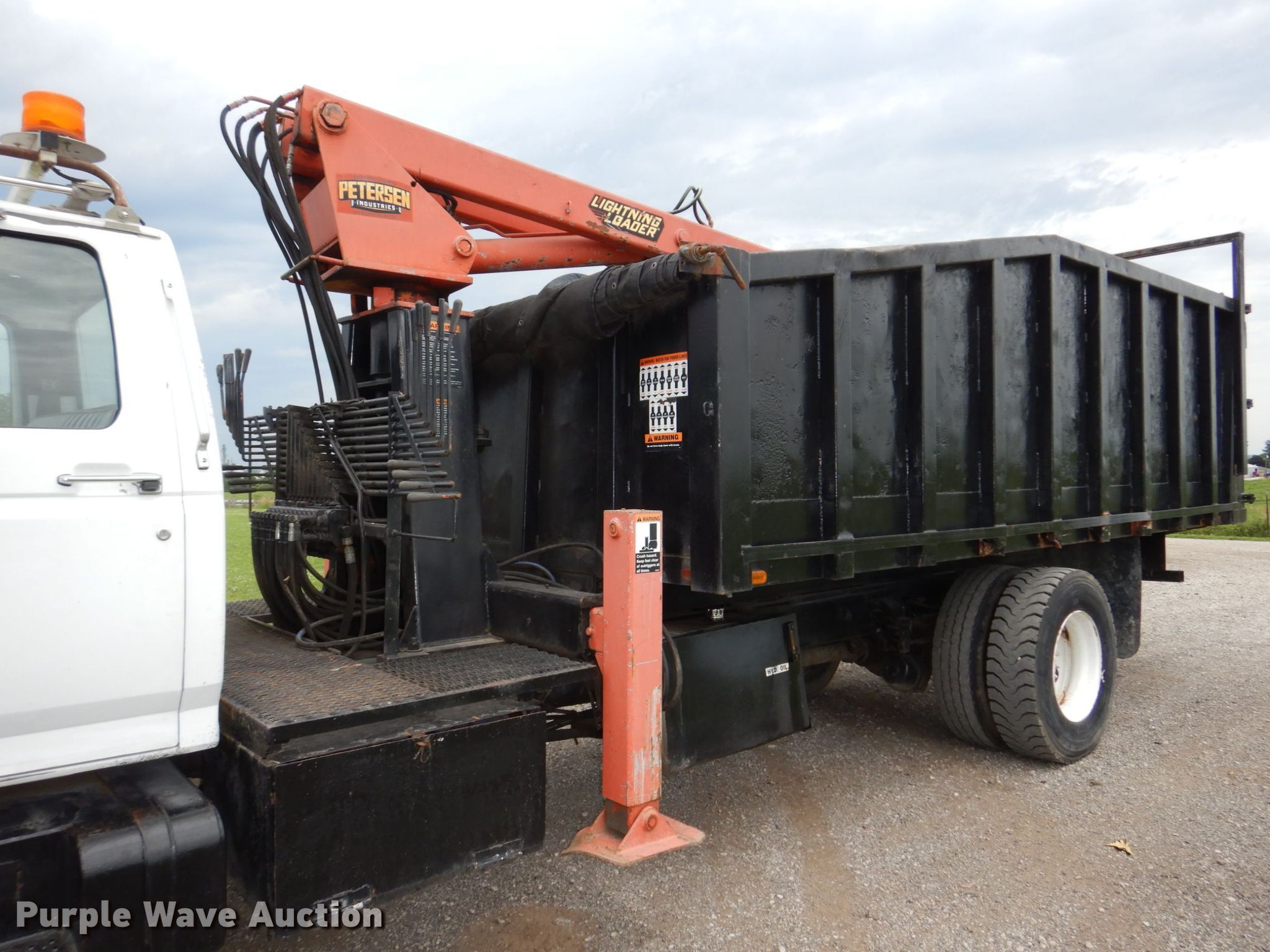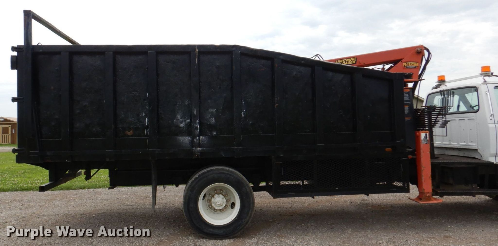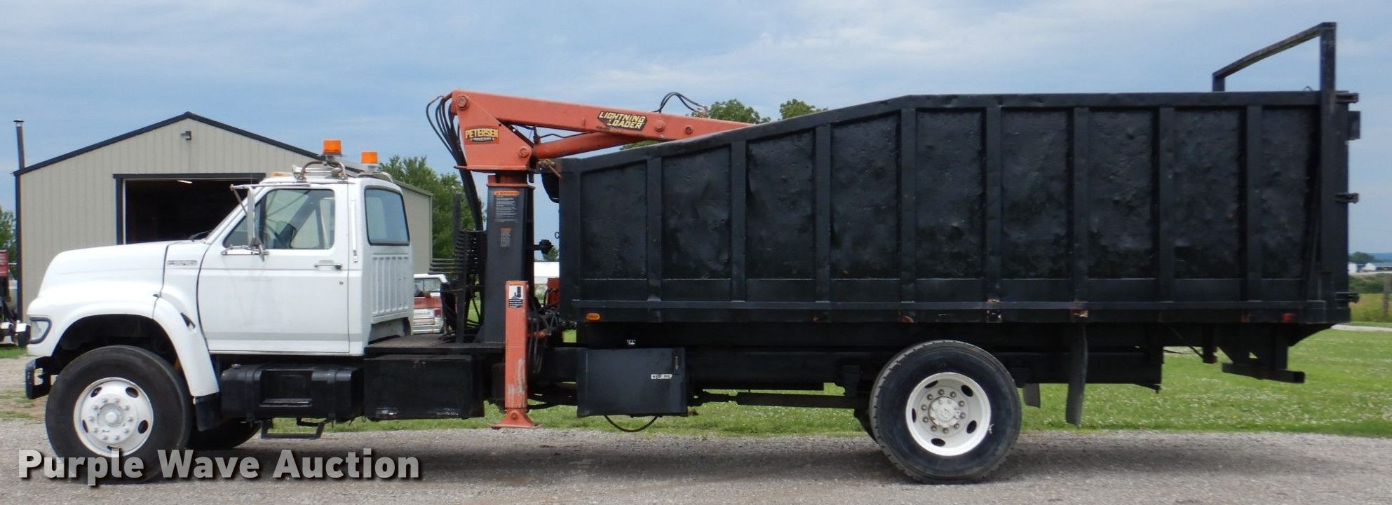 1999 Ford F800 crane truck. Miles: 146,859 on odometer, VIN: 3FEXF8014XMA03647. Engine Cummins ISB, Displacement: 5.9L, Cylinders: 6, Fuel type: Diesel, HP: 215. Transmission Manual, Speed: 6. Chassis Axles: Single, Suspension: Spring, Brakes: Air, PTO, Wheelbase: 241". Interior AC, Heat. Features Dump bed 18' L x 98" W, Side height: 62", Bed type: Steel, Roll tarp, Ram: Single , End gate: Manual, Crane Peterson Lightning , Boom length: 20'. Tires Size: 11R22.5. Notes Dash warning indicator: Check engine. Missouri title. Saw Tree Service. 4530 Kelsey Road Southeast. Saint Joseph, MO 64507