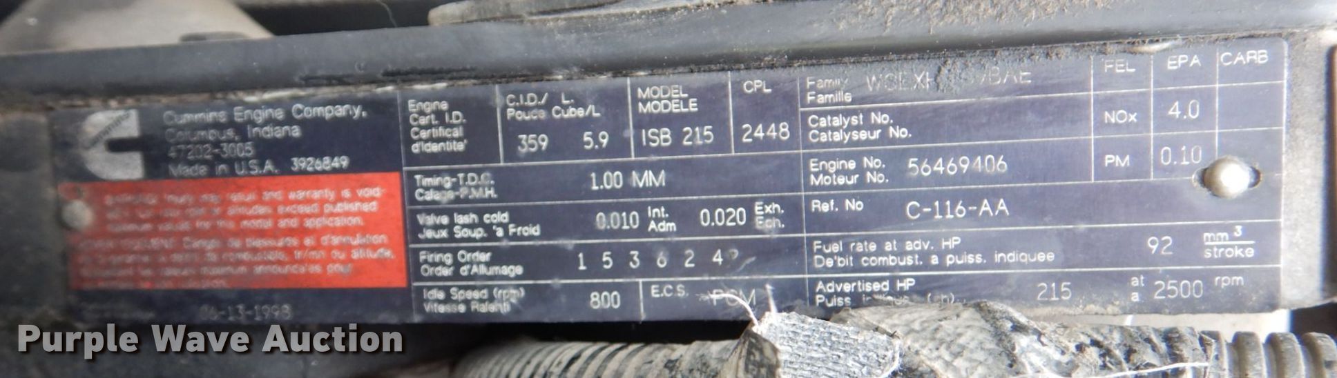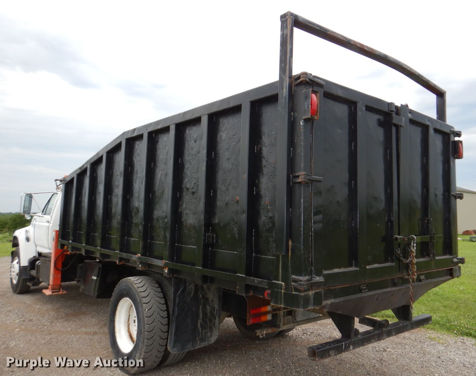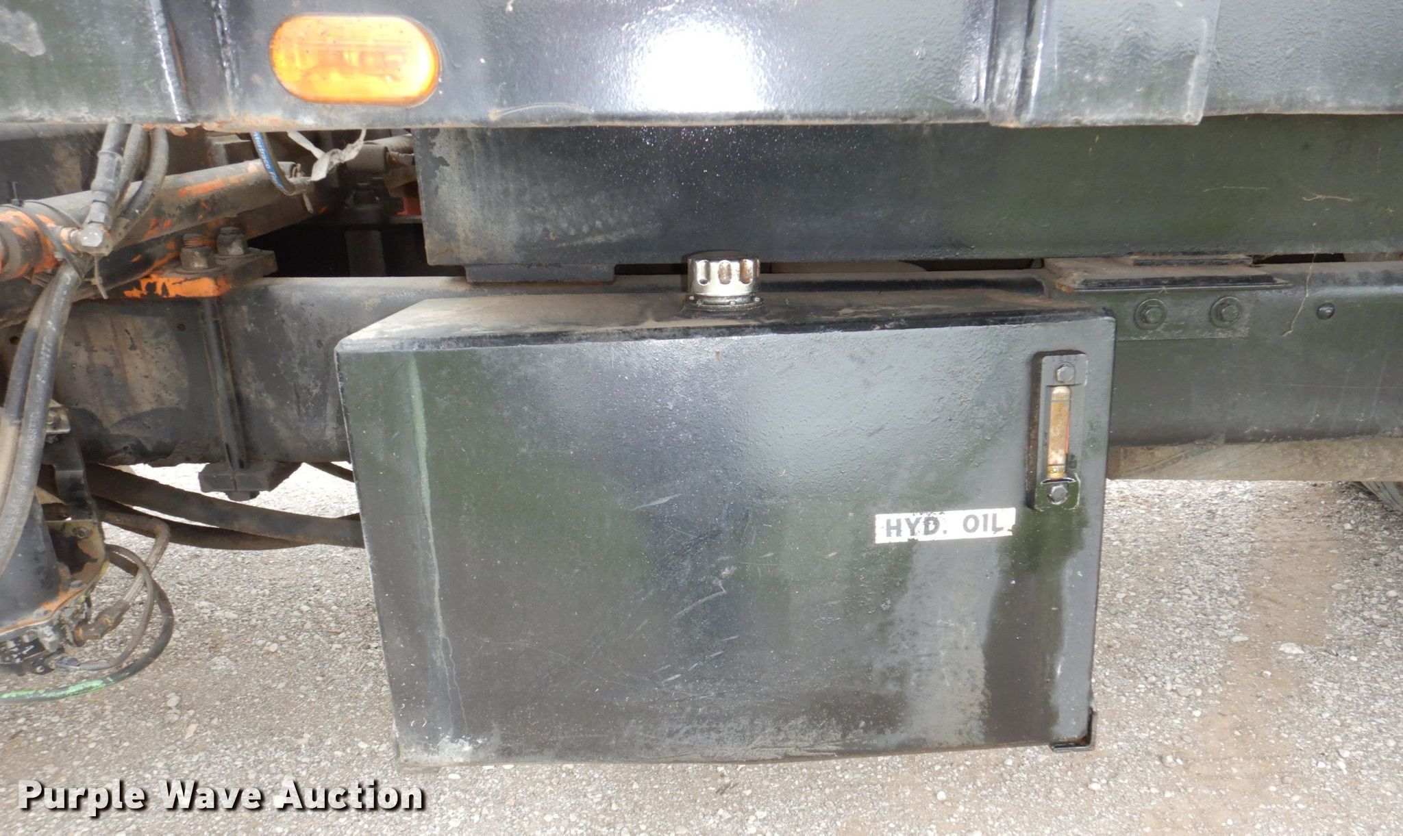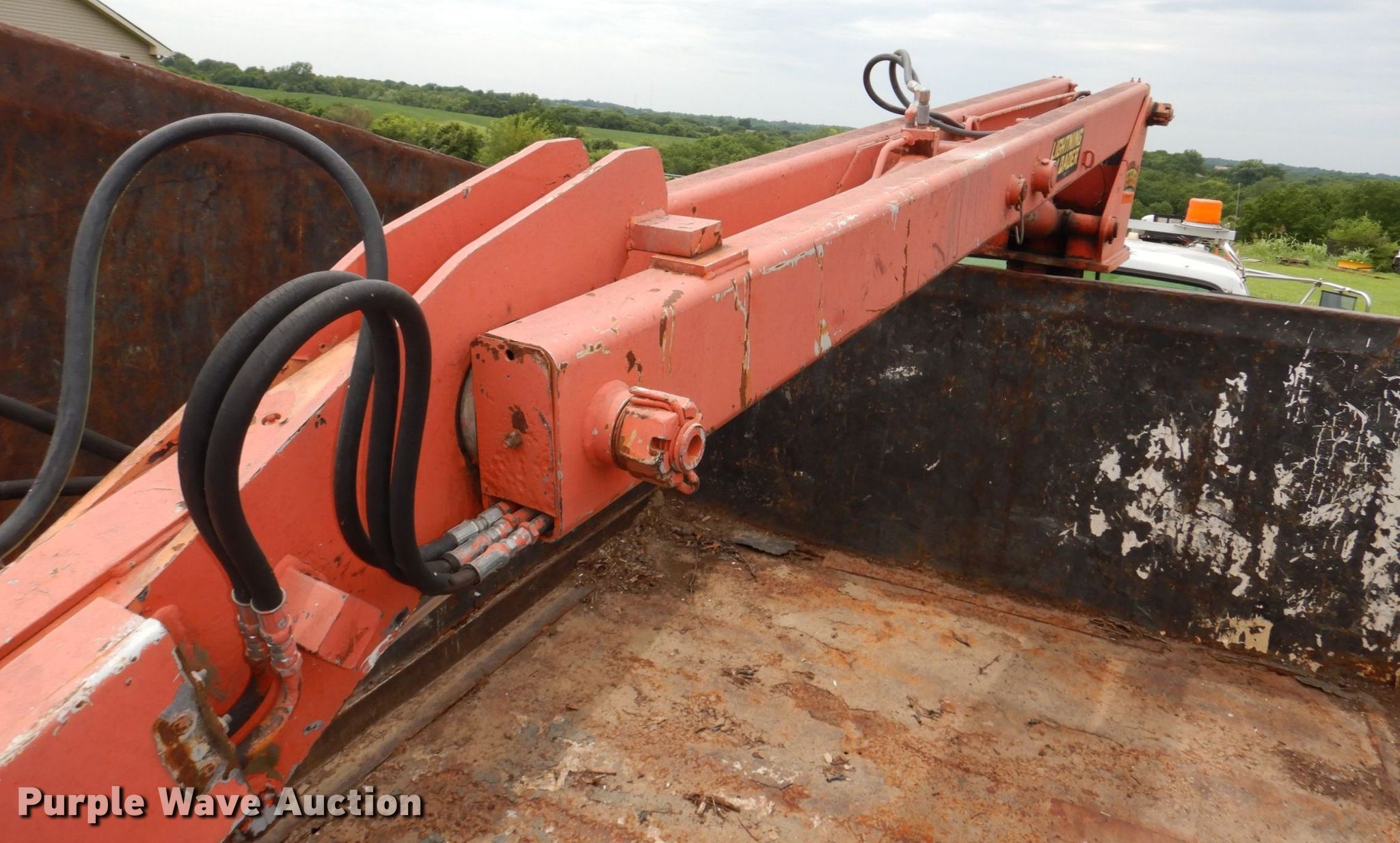 1999 Ford F800 crane truck. Miles: 146,859 on odometer, VIN: 3FEXF8014XMA03647. Engine Cummins ISB, Displacement: 5.9L, Cylinders: 6, Fuel type: Diesel, HP: 215. Transmission Manual, Speed: 6. Chassis Axles: Single, Suspension: Spring, Brakes: Air, PTO, Wheelbase: 241". Interior AC, Heat. Features Dump bed 18' L x 98" W, Side height: 62", Bed type: Steel, Roll tarp, Ram: Single , End gate: Manual, Crane Peterson Lightning , Boom length: 20'. Tires Size: 11R22.5. Notes Dash warning indicator: Check engine. Missouri title. Saw Tree Service. 4530 Kelsey Road Southeast. Saint Joseph, MO 64507
