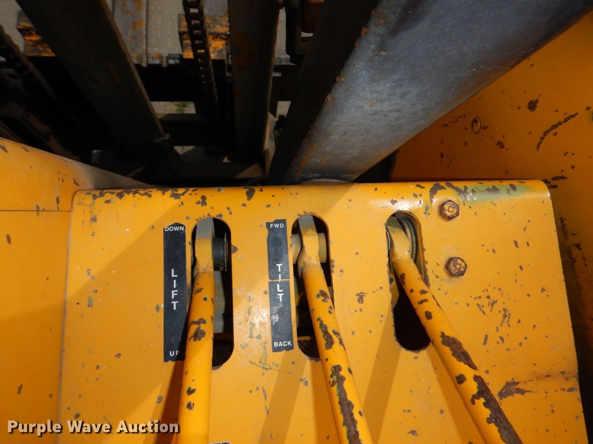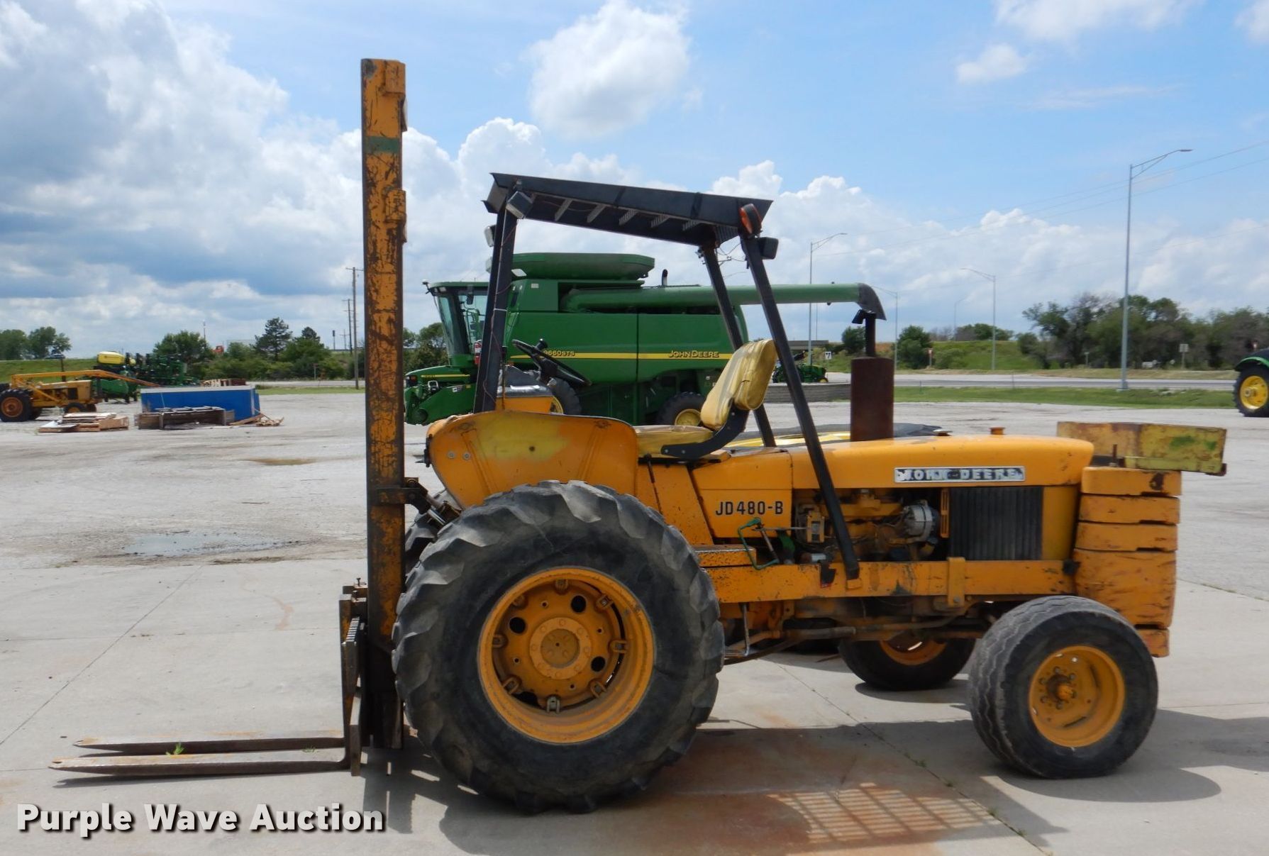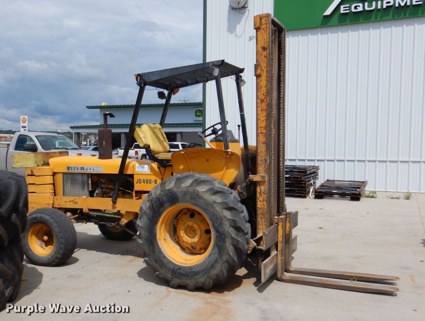 Purple Wave is selling a used Strt. Mast Rough Terr. Forklift in Iowa. This item is a John Deere 480-B forklift with the following: Hours: 4,348 on meter, Serial: 36384