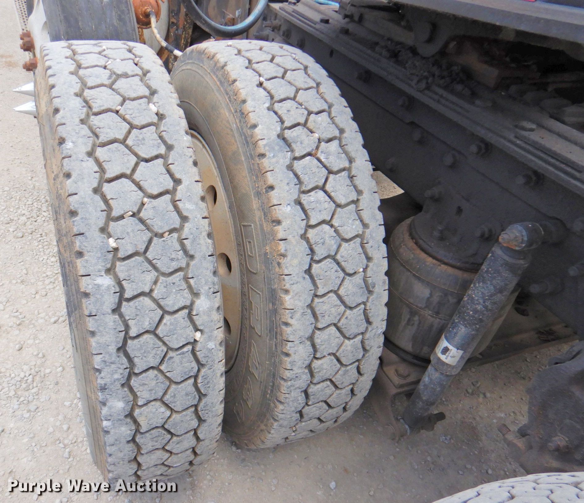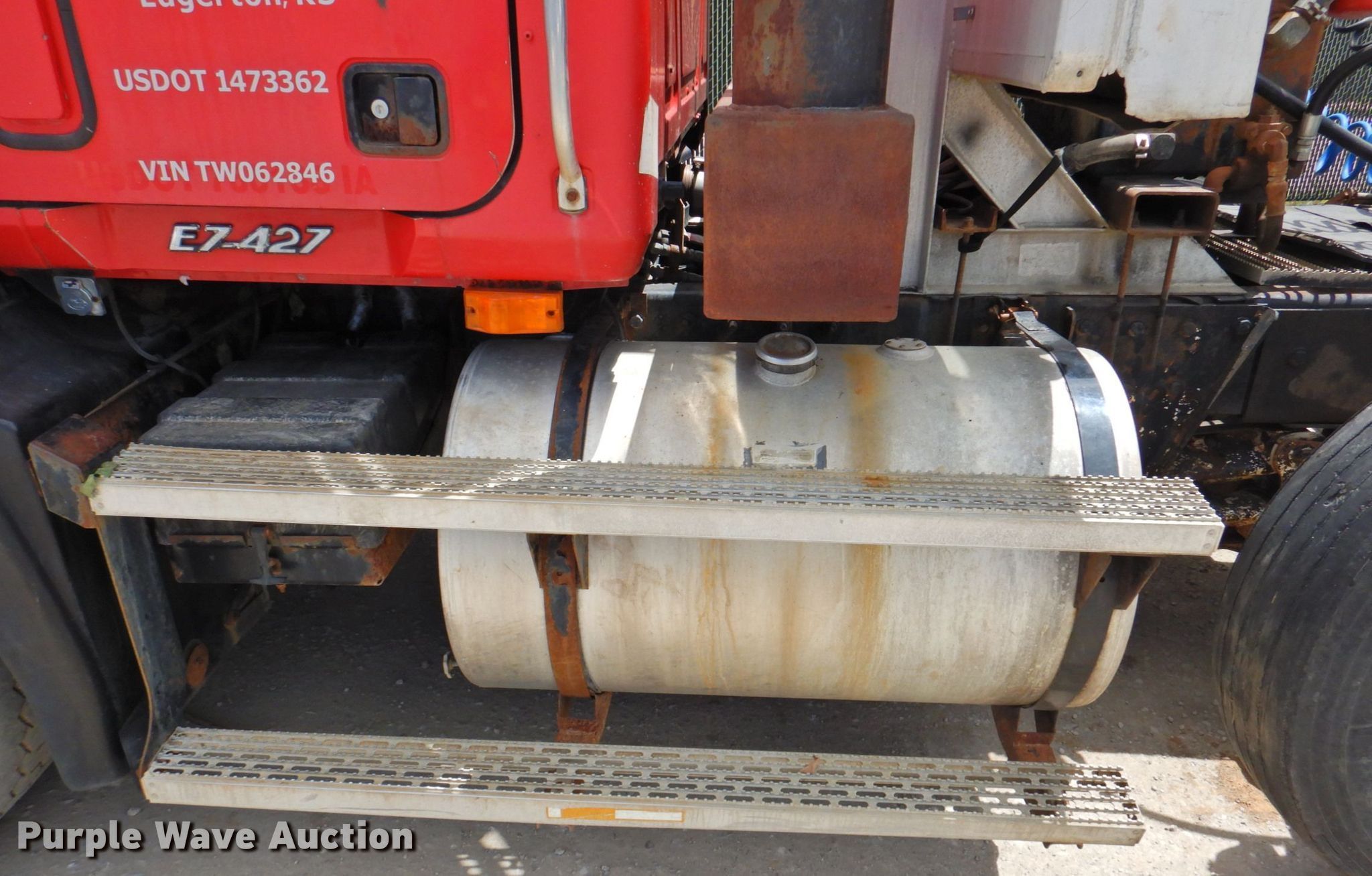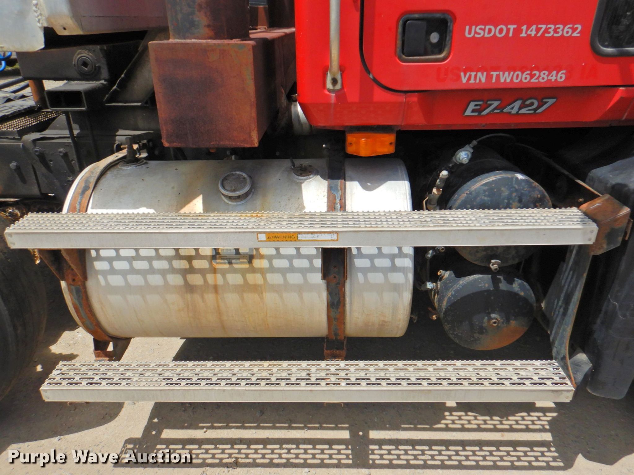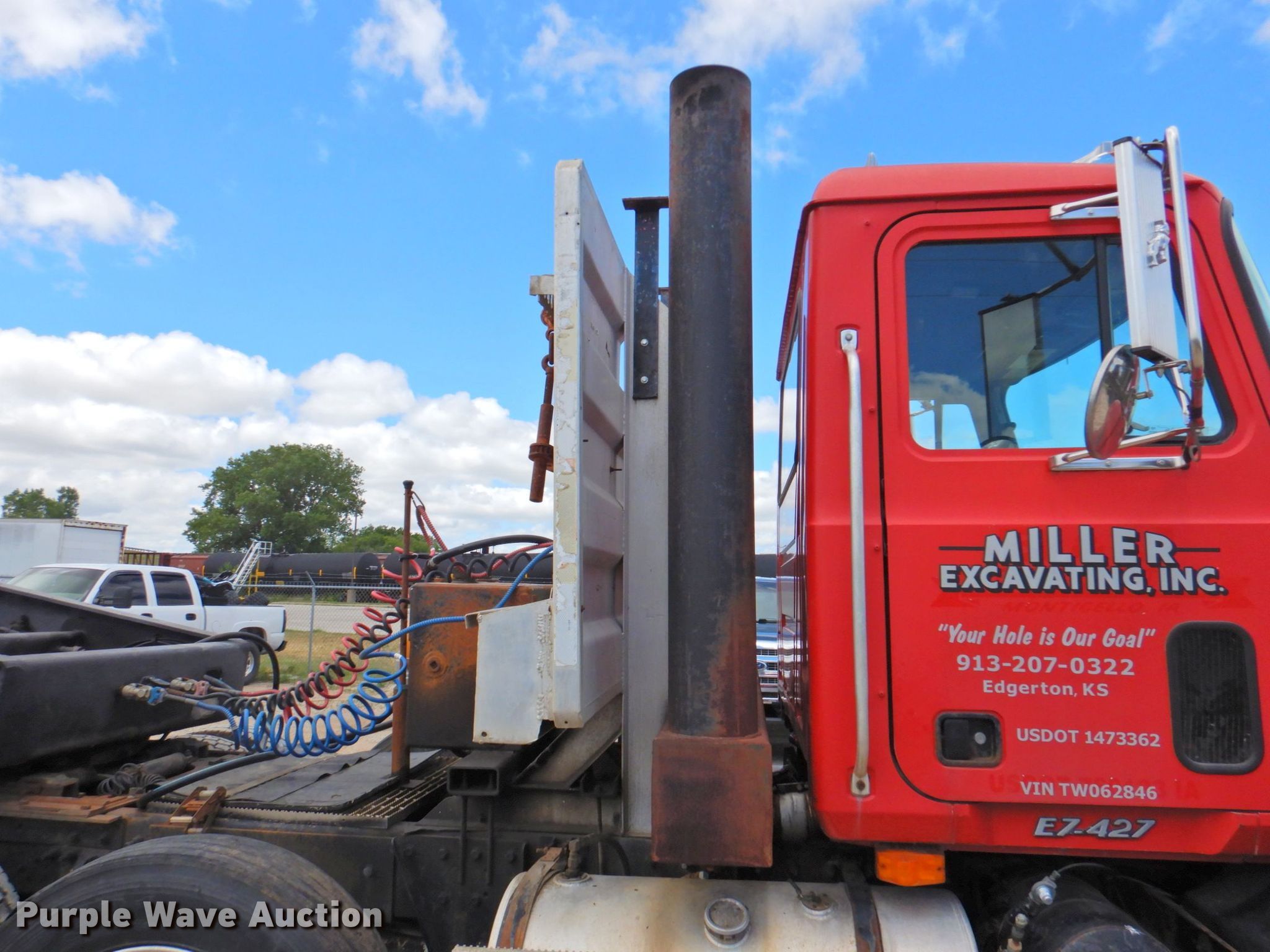 1996 Mack CH613 semi truck. Miles: 12,228 on odometer, Hours: 28,858 on meter, VIN: 1M1AA18Y8TW062846. Engine Mack E7-427, Displacement: 12.0L, Cylinders: 6, Fuel type: Diesel, HP: 427, Engine brake. Transmission Mack T2100, Manual, Speed: 10. Chassis Axles: Tandem, Pusher axle, Differential lock: Inter-axle, Suspension: Air Dump valves, Brakes: Air, PTO, Wet kit. Interior AC, Heat, Heated mirrors, Cruise control, Air ride cab. Features Deck plate: Aluminum, Fifth wheel type: Sliding, Fuel tank: Dual. Tires Front: 385/65R22.5, Rear: 275/80R24.5, Lift axle: 285/75R24.5. Notes Windshield chipped or cracked. Kansas title. Miller Excavating, Inc.. 211 West Dennis Avenue. Olathe, KS 66061