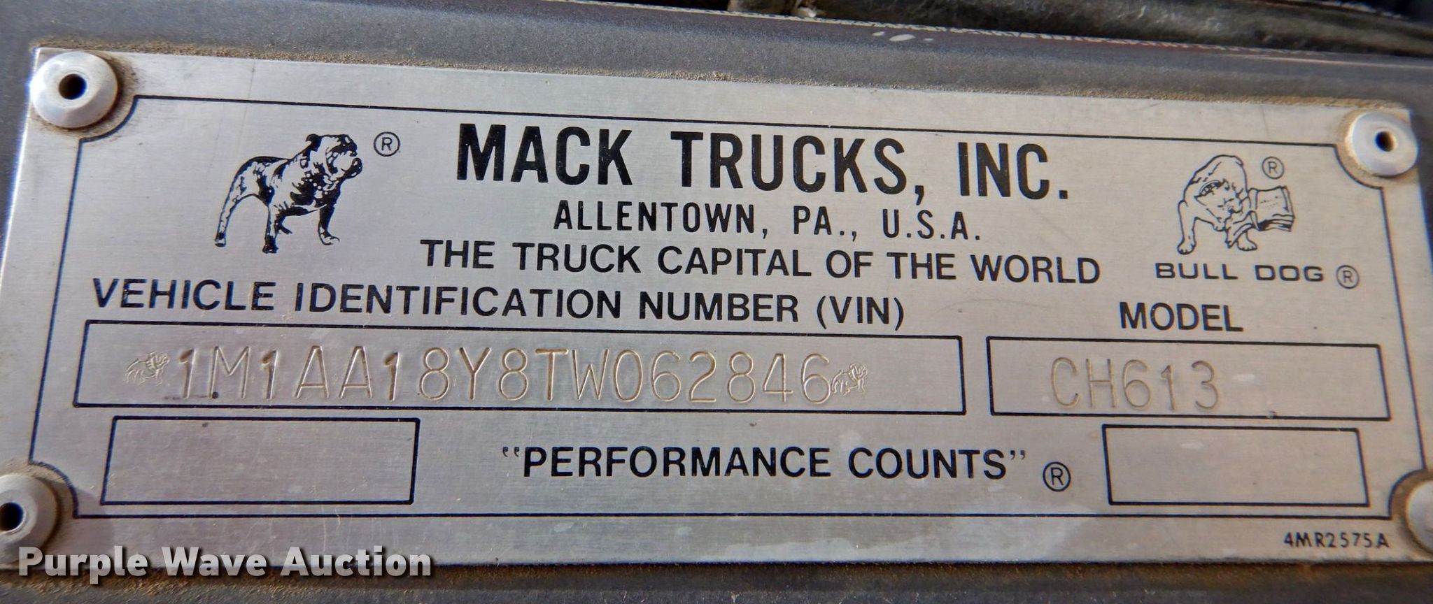Purple Wave is selling a used Truck Tractor in Kansas. This item is a 1996 Mack CH613 semi truck with the following: Miles: 12,228 on odometer, Hours: 28,858 on meter, VIN: 1M1AA18Y8TW062846