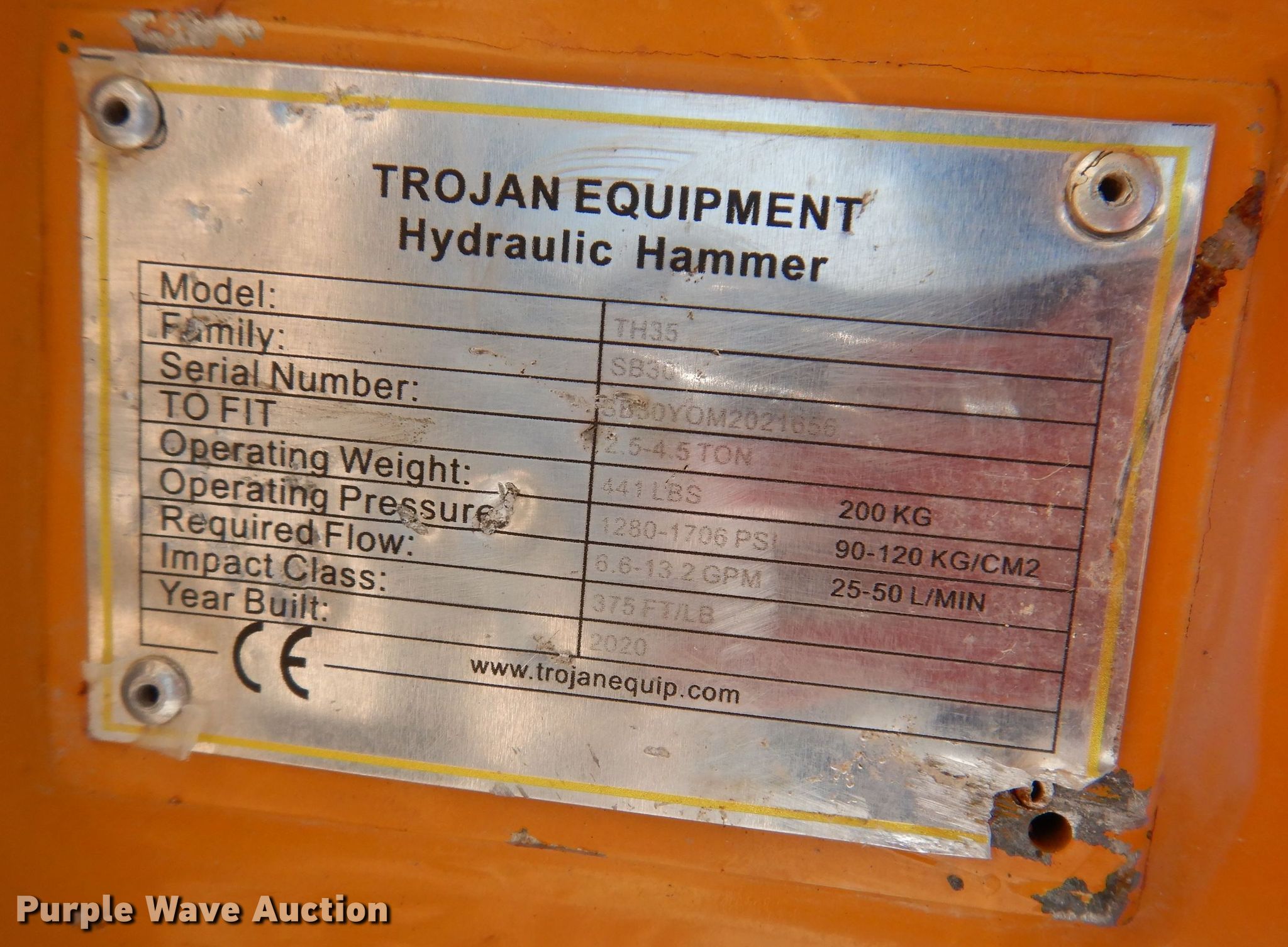 Purple Wave is selling a used Breaker or Hammer in Iowa. This item is a 2020 Trojan TH35 breaker with the following: Serial: 6B30YOM2021666, 4.5 ton, 13.25 " x 2", 35CL 40mm pin, Unused
