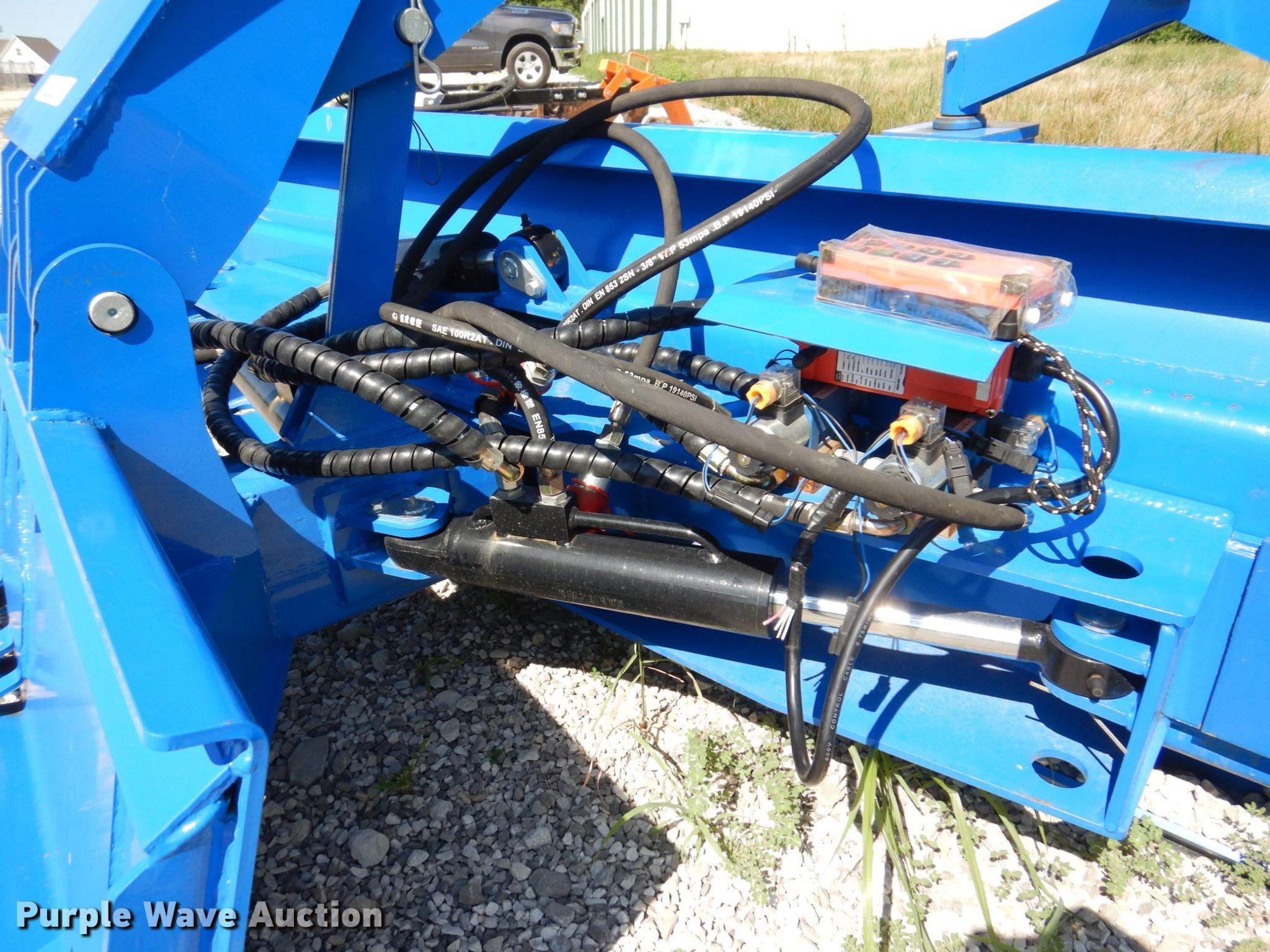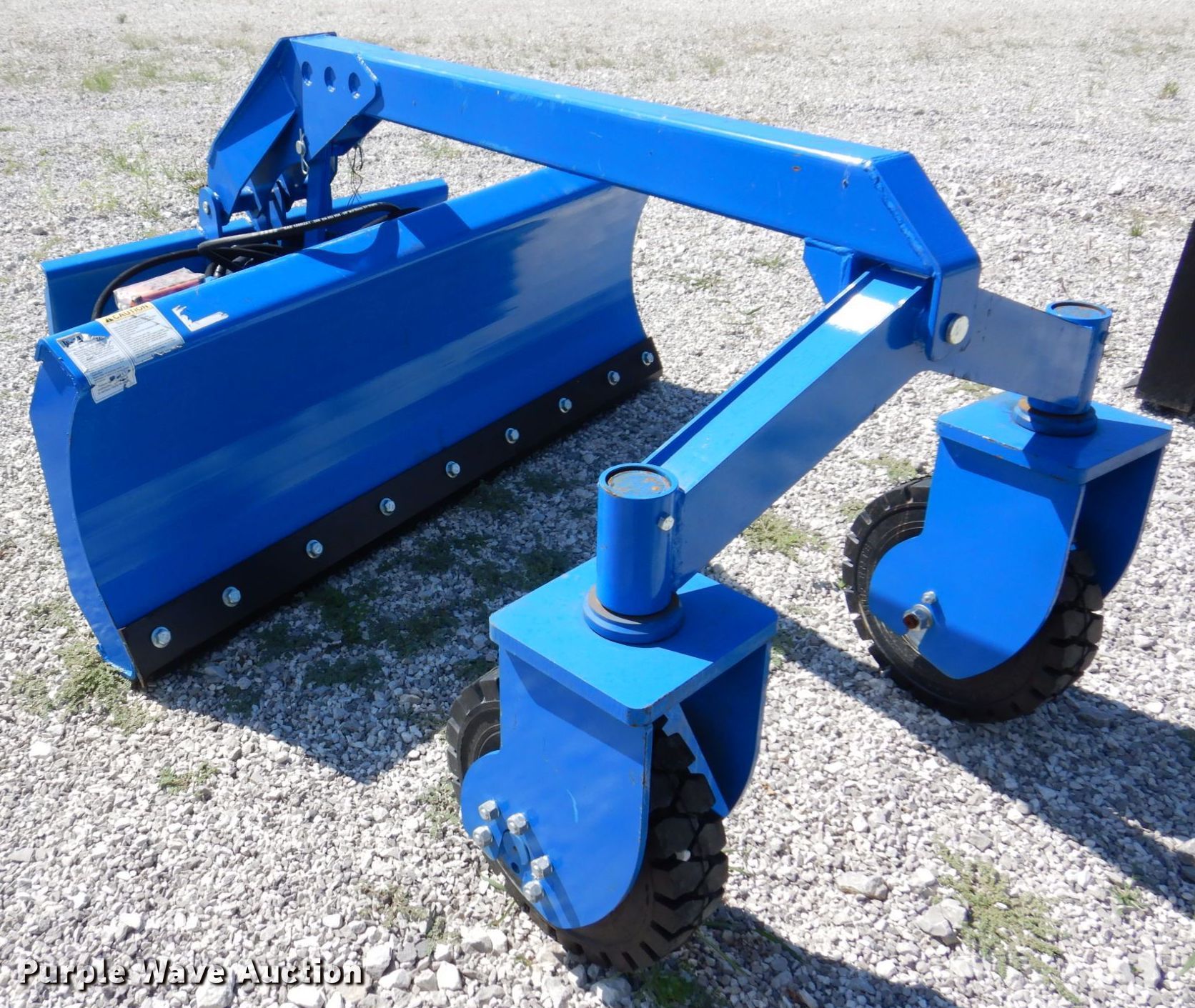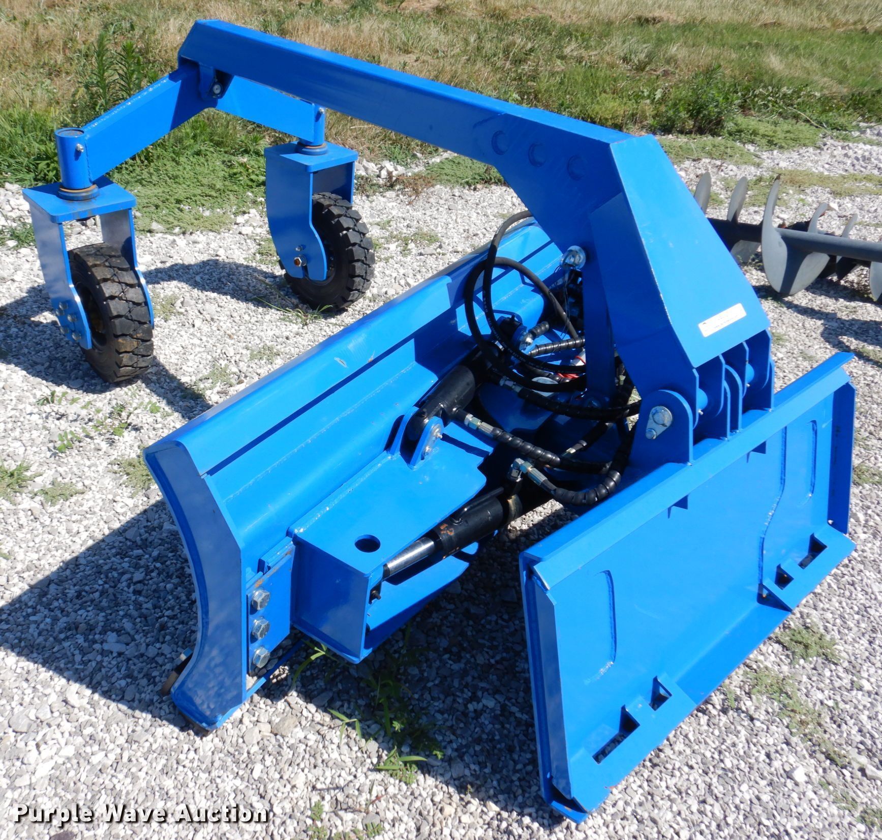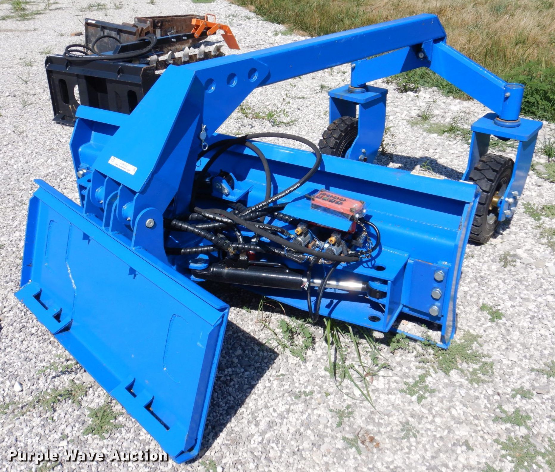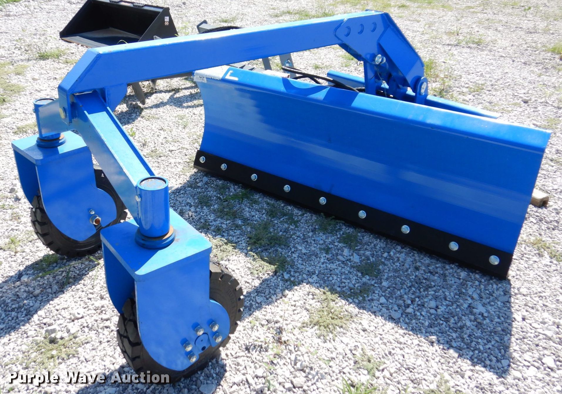 Purple Wave is selling a used Skid Steer Attach. in Missouri. This item is a 2021 TopCat SSSG72 skid steer dozer blade with the following: Serial: SSSG7222020701, Type: 6-way, Straight, Width: 72", Cutting edge: Bolt on, Remote grade control, 5.00-8 solid tires
