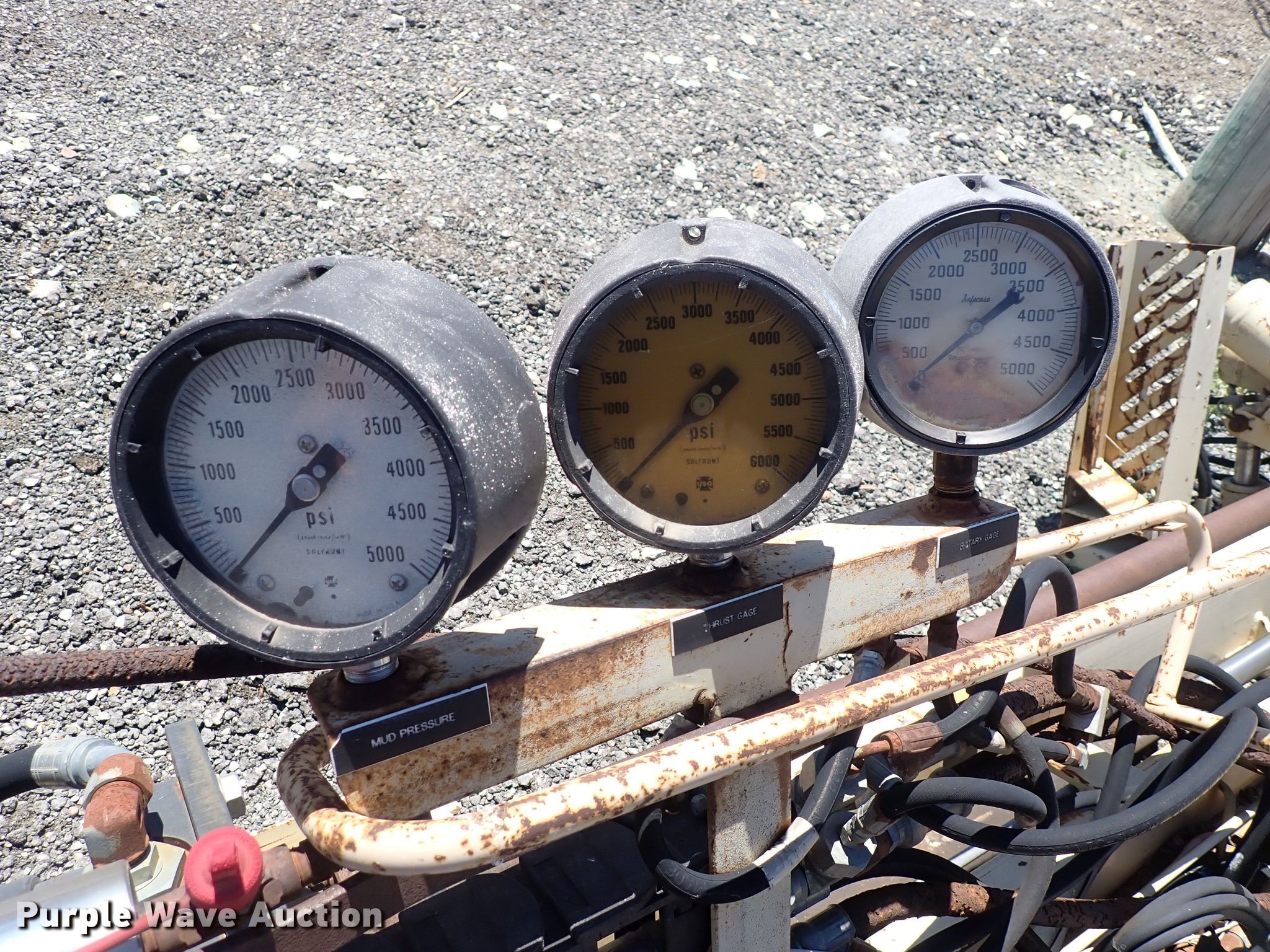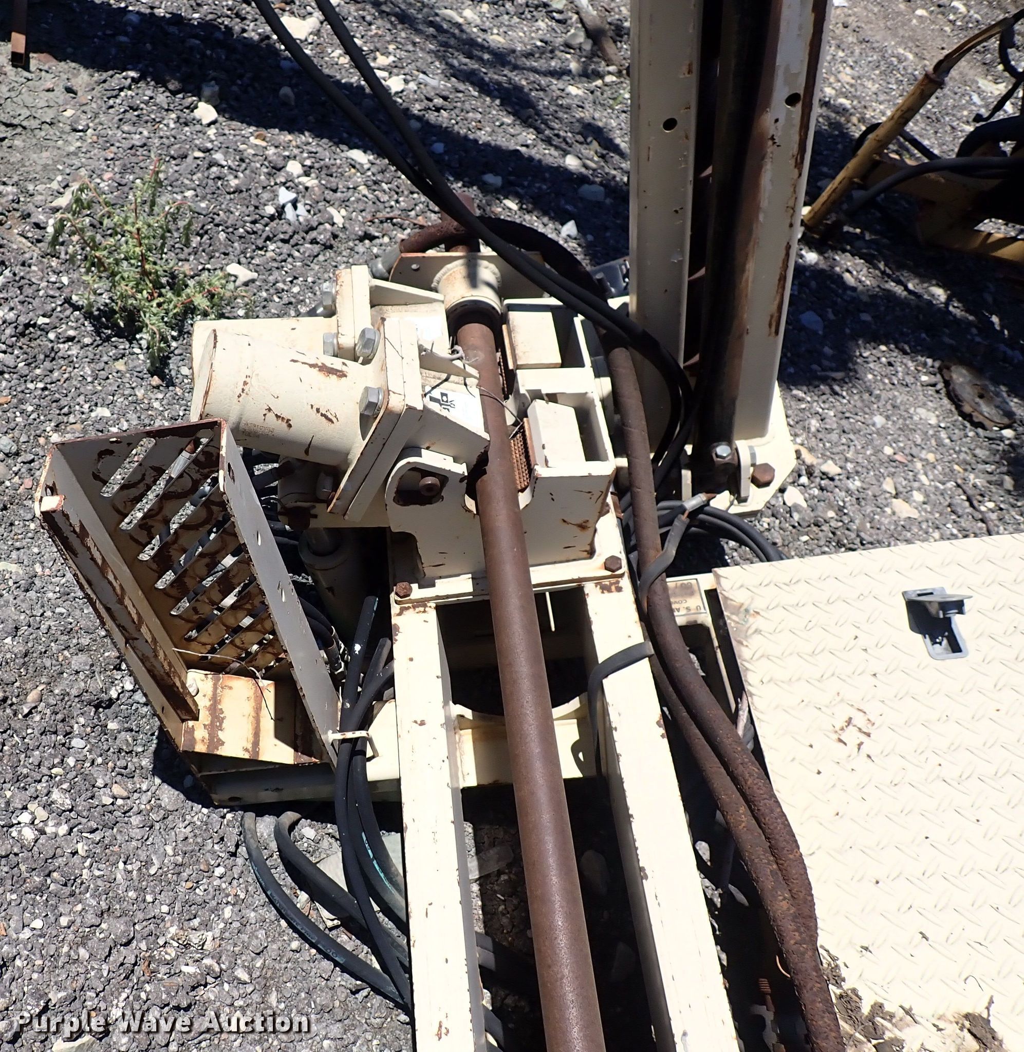Shop built skid steer directional boring unit. Joystick controls, 6' rod length, Hydraulic stake down, Mud, thrust, and rotary gauges. Source: HDD, LLC. Hutchinson, KS 67502