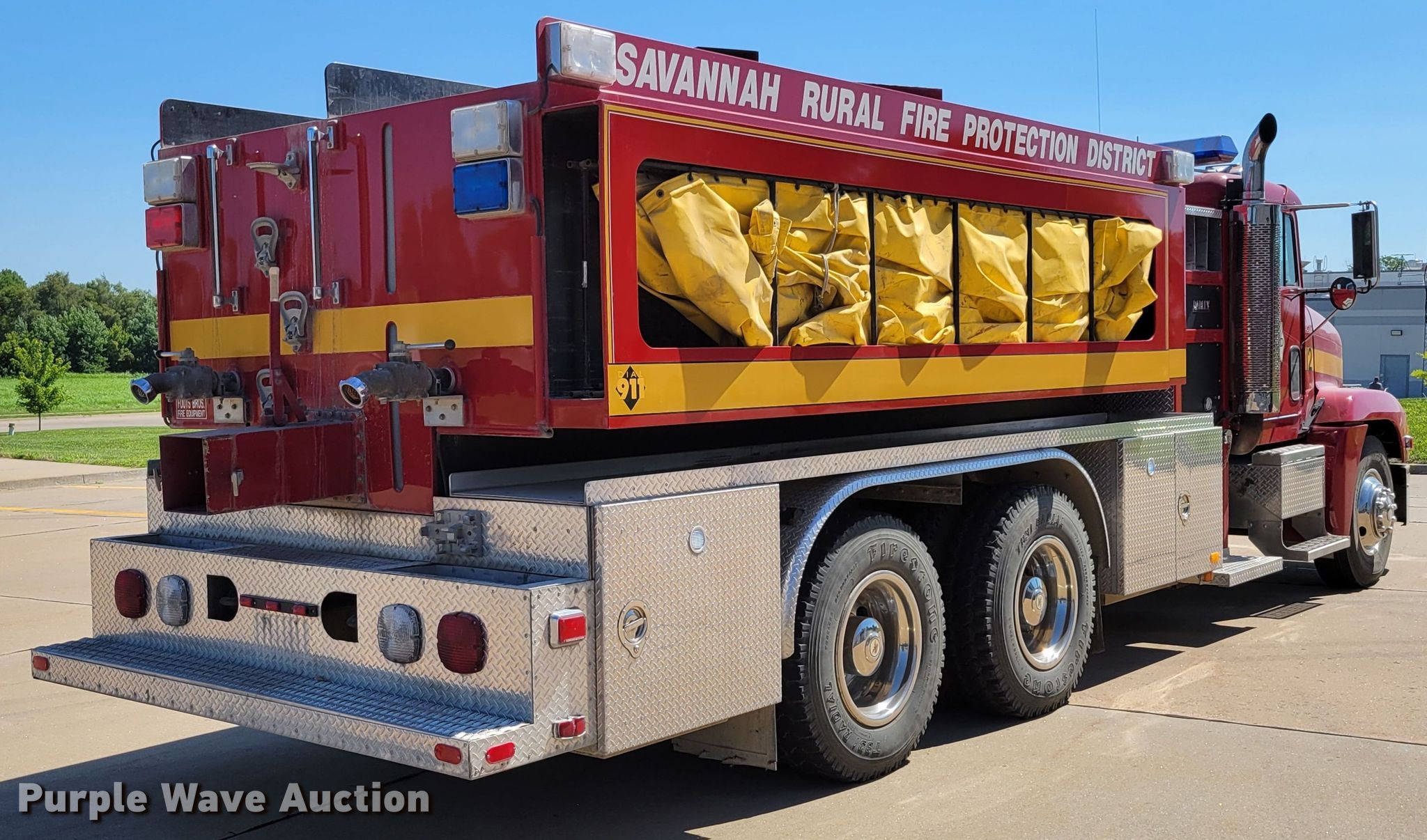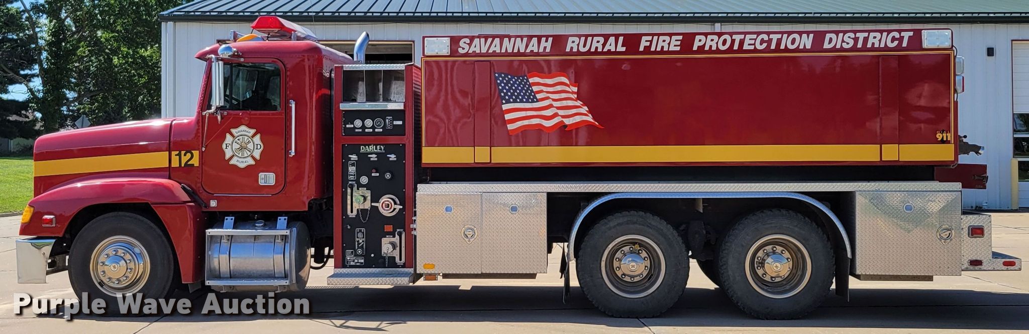 1994 Freightliner tanker fire truck. Miles: 555,029 on odometer, VIN: 1FUYDSYB2RH429852. Engine Caterpillar 3406, Serial: 4CK17772, Displacement: 14.6L, Cylinders: 6, Fuel type: Diesel. Transmission Automatic. Chassis Axles: Tandem, Differential lock: Inter-axle, Suspension: Spring, Brakes: Air, PTO, Wheelbase: 224". Interior AC, Heat, Cruise control. Features Bed / tank Capacity: 3,000 gallons, 16' 4" L x 82" W, Water tank Side discharge, Top fill, Rear drain: 10", Rear outlet: (2) 3" inlets, Champion HM pump, Foldable water tank 13' x 13'2". Tires Front: 12R22.5, Rear: 11R22.5. Missouri title. Savannah Rural Fire Protection Dist. 107 S Hwy 71. Savannah, MO 64485