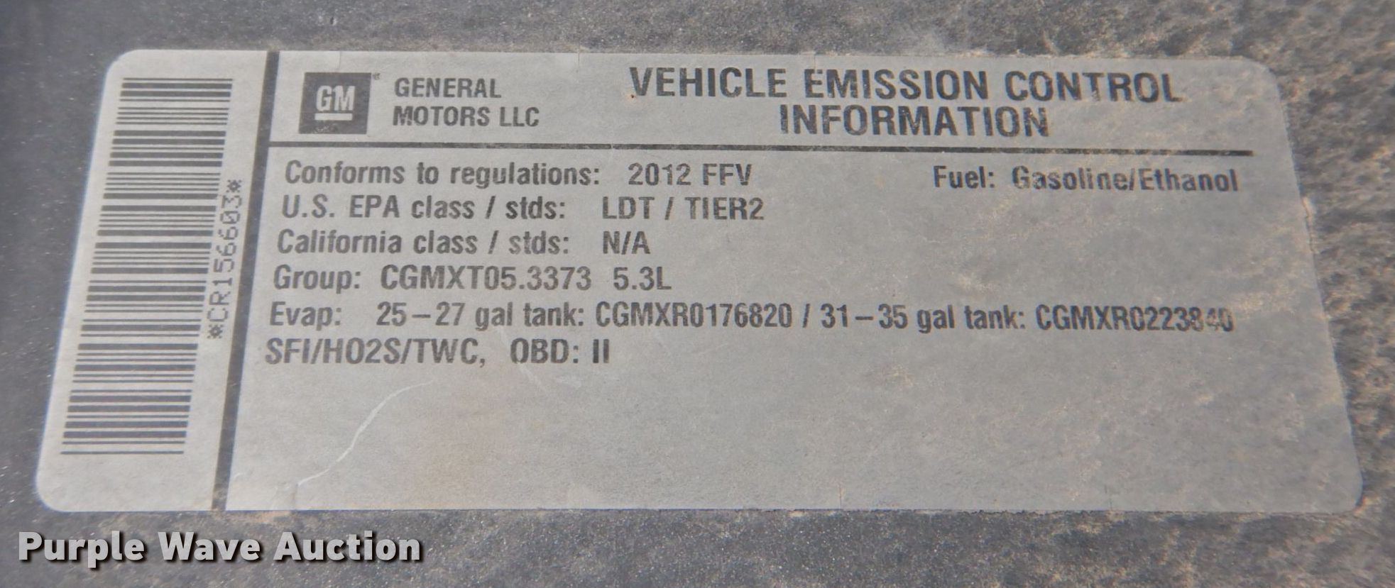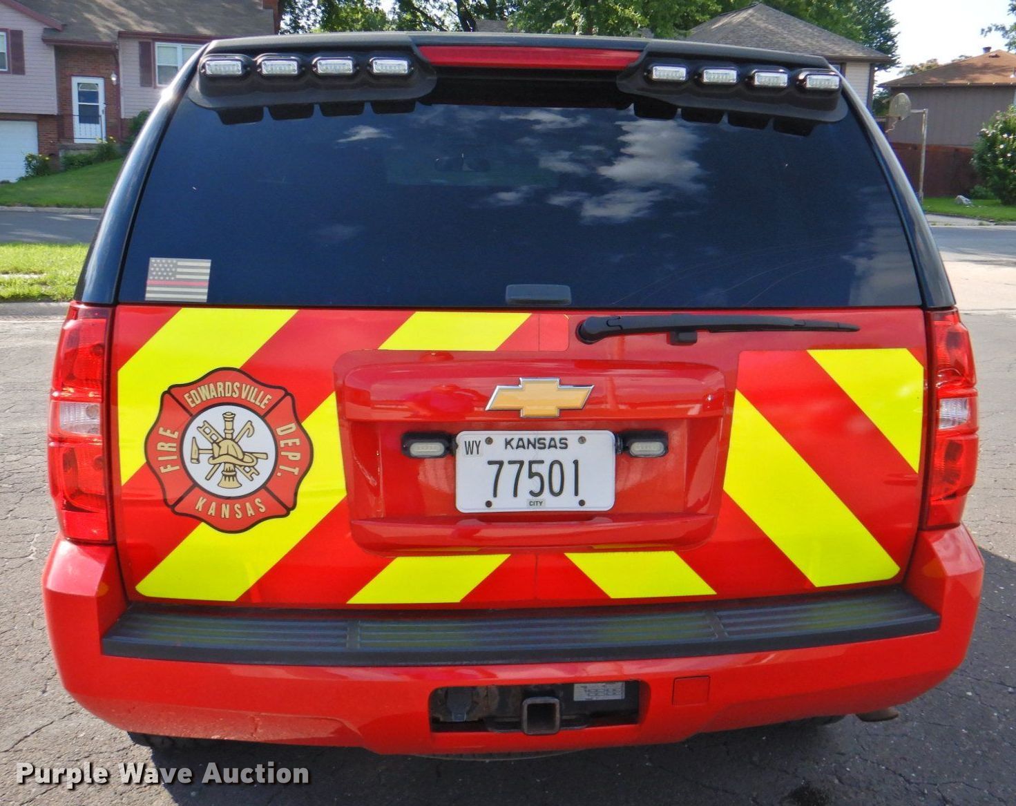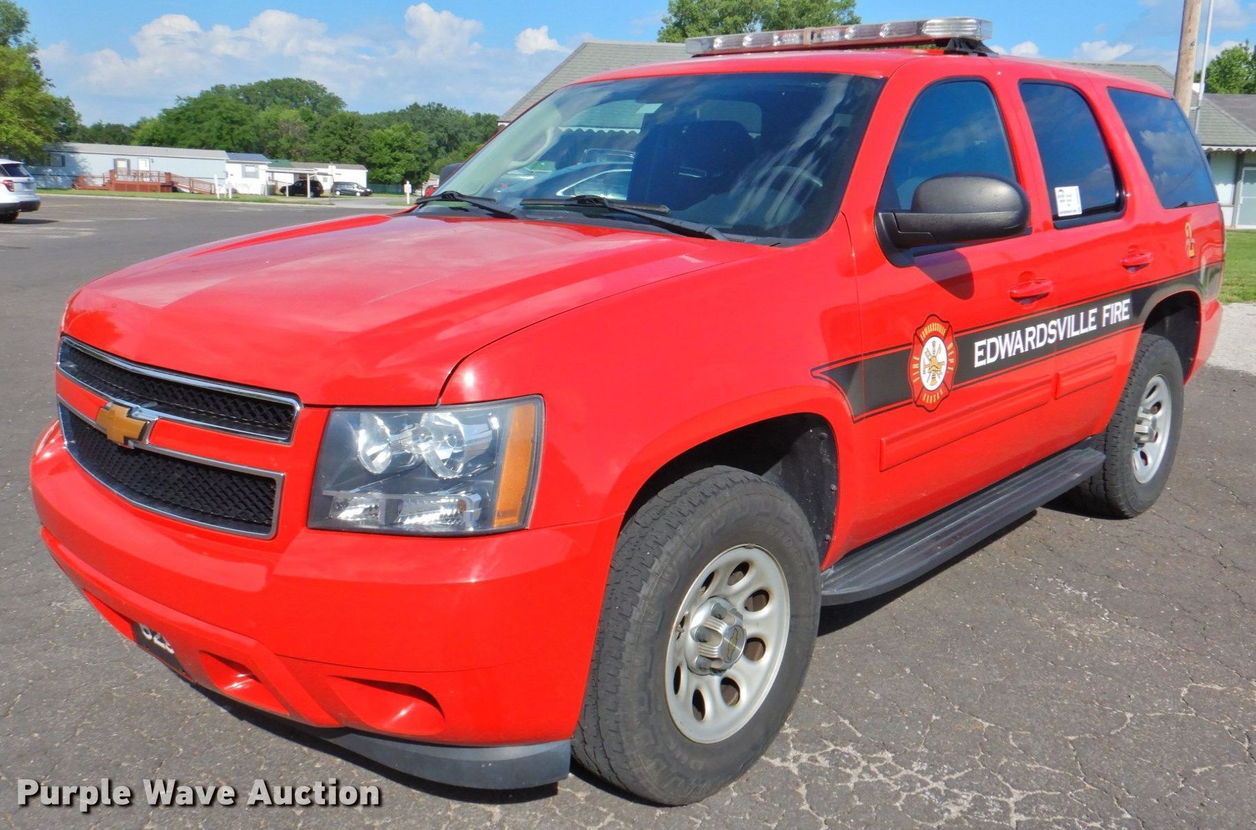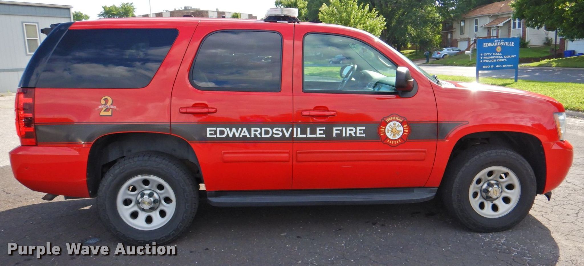 2012 Chevrolet Tahoe SUV. Miles: 115,912 on odometer, VIN: 1GNSK2E09CR156603. Engine Displacement: 5.3L V8 OHV, Cylinders: 8, Fuel type: Gas. Transmission Automatic, Four wheel drive. Interior AC, Heat, Seat: Power driver, Power windows, Power locks, Cruise control. Tires Size: 265/70R17. Notes Contents will be removed prior to auction, Hail damage. Kansas title. Edwardsville Fire Dept.. 690 South 4th Street. Edwardsville, KS 66111