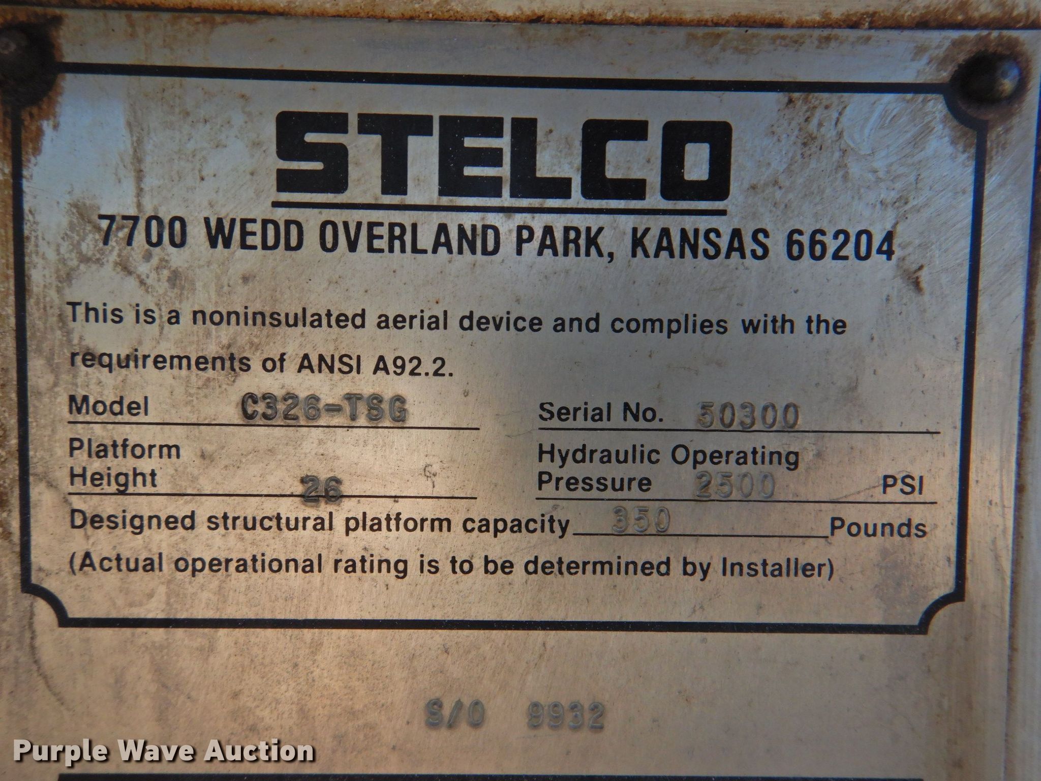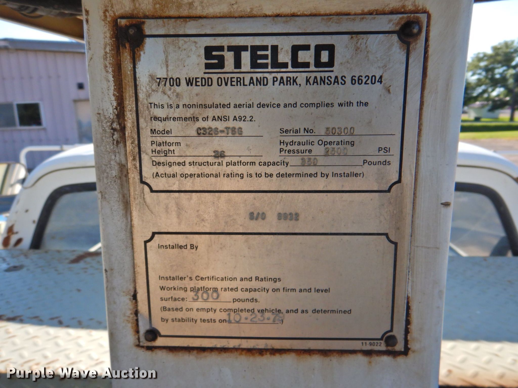 1979 Dodge D40 bucket truck. Miles: 61,989 on odometer, VIN: D41CT9S226885. Engine Displacement: 360 C.I.D., Cylinders: 8, Fuel type: Gas. Transmission Manual, Speed: 4. Chassis Axles: Single, Suspension: Spring, Brakes: Hydraulic, GVWR: 10,500 lbs. Interior Heat. Features Bed Steelweld SLC-96, 96' L x 91" W, Engine Predator, Displacement: 420 cc, Cylinders: 1, Fuel: Gas, Boom Stelco C326-TSG, Serial: 50300, Maximum lift capacity: 300 lbs, Maximum lift height: 26', Boom type: Telescopic, Man basket, Boom controls Ground, Platform/ basket.. Tires Size: 7.50-16. Notes Fuel line leak, Recoil start rope broken. Kansas title. City of Lyndon. 230 Topeka Avenue. Lyndon, KS 66451