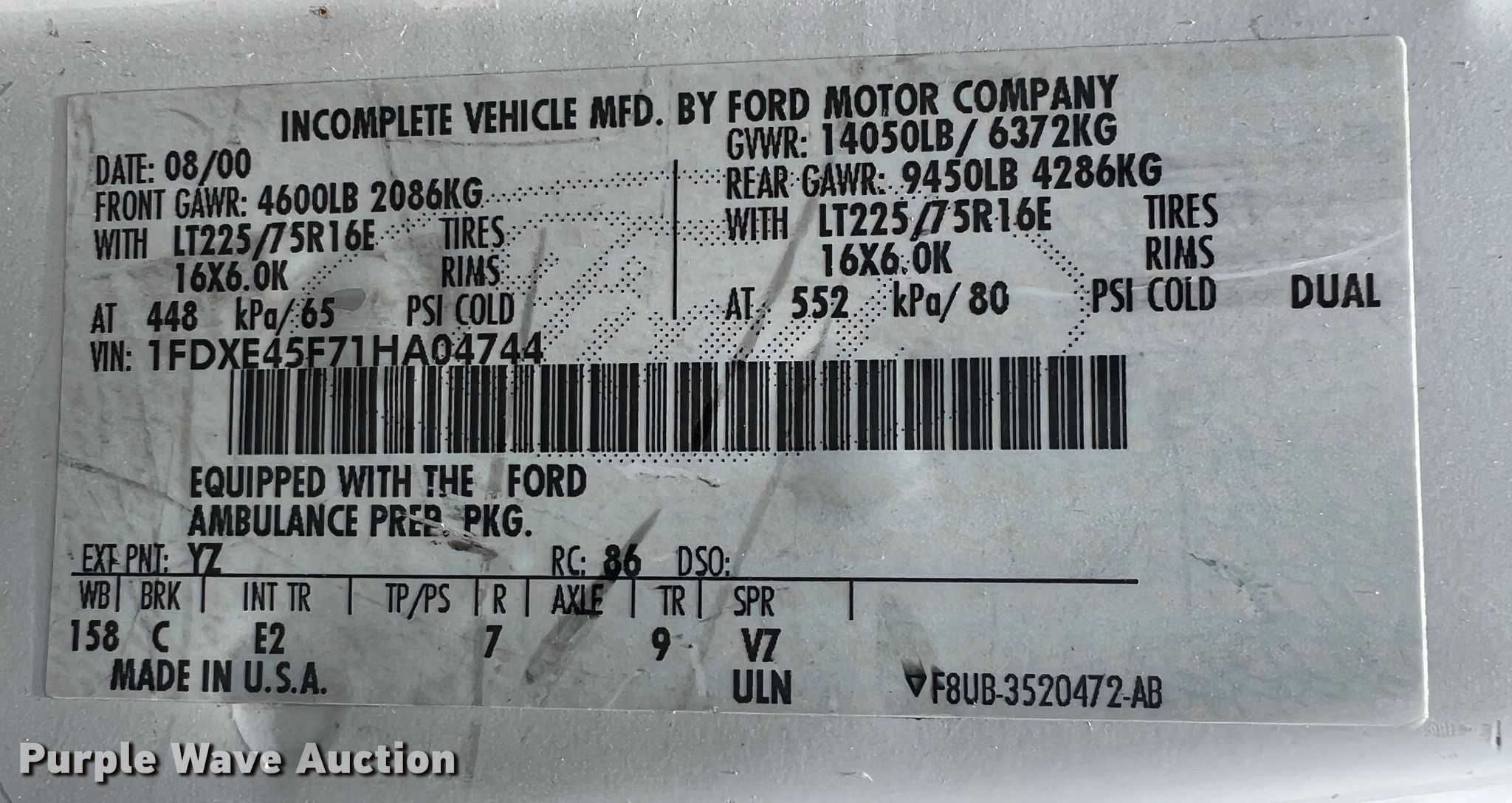 Take a look at this used 2001 Ford E450 Super Duty ambulance being sold on August 16th, 2022 in the SOLD! August 16 Government Auction made by Ford. Take a look at all of the item information below or take a look at similar auctions for Trucks.