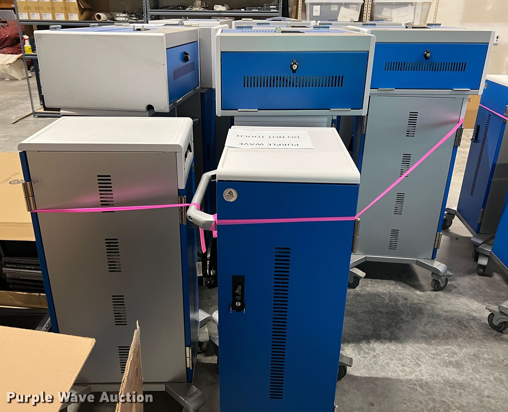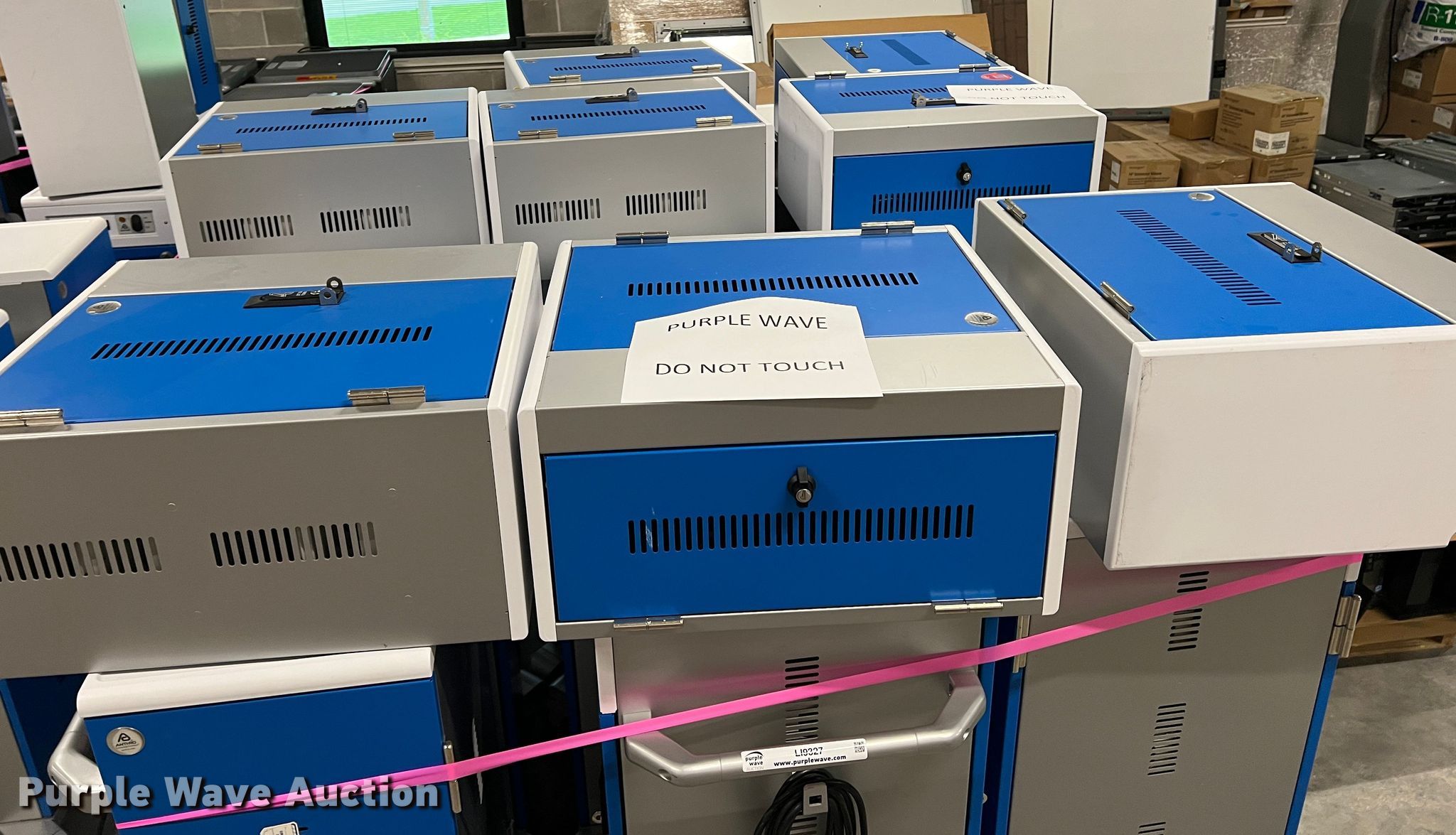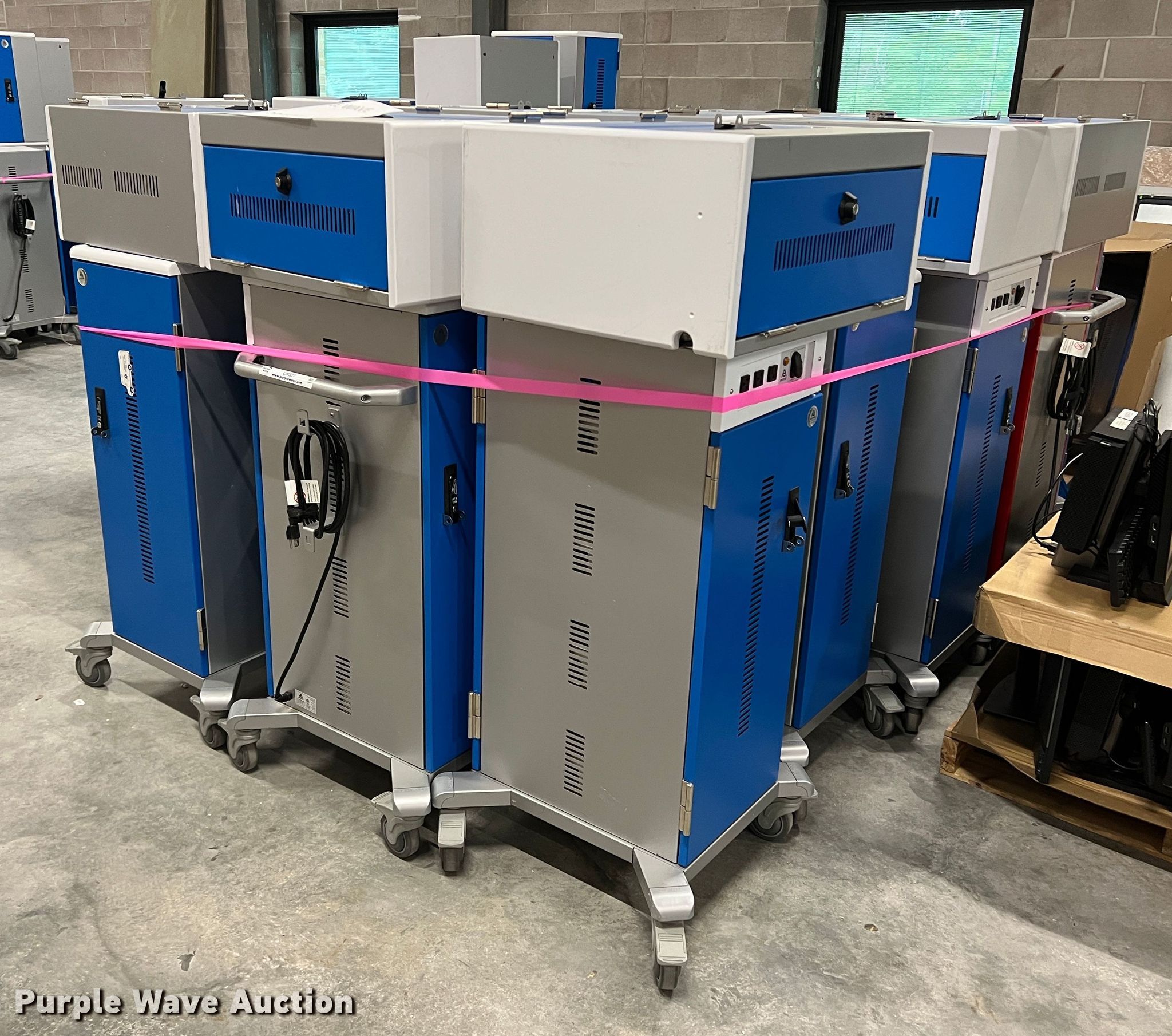 Purple Wave is selling a used Office Supplies and Equip. in Kansas. This item is a Electronics charging equipment with the following: (13) carts, (8) cabinets