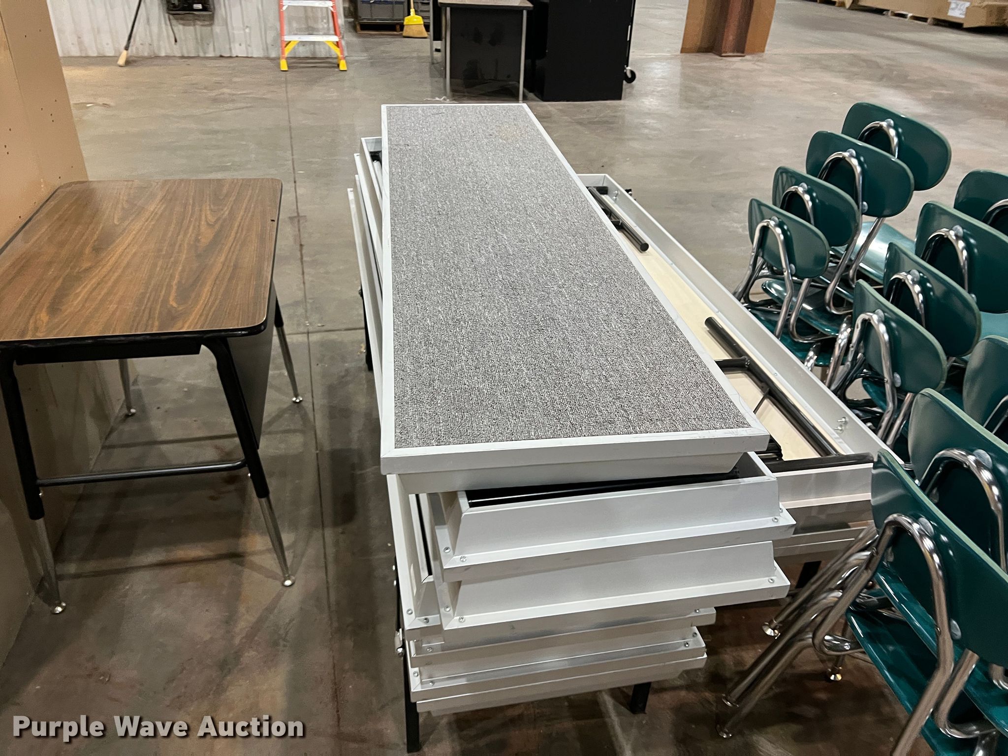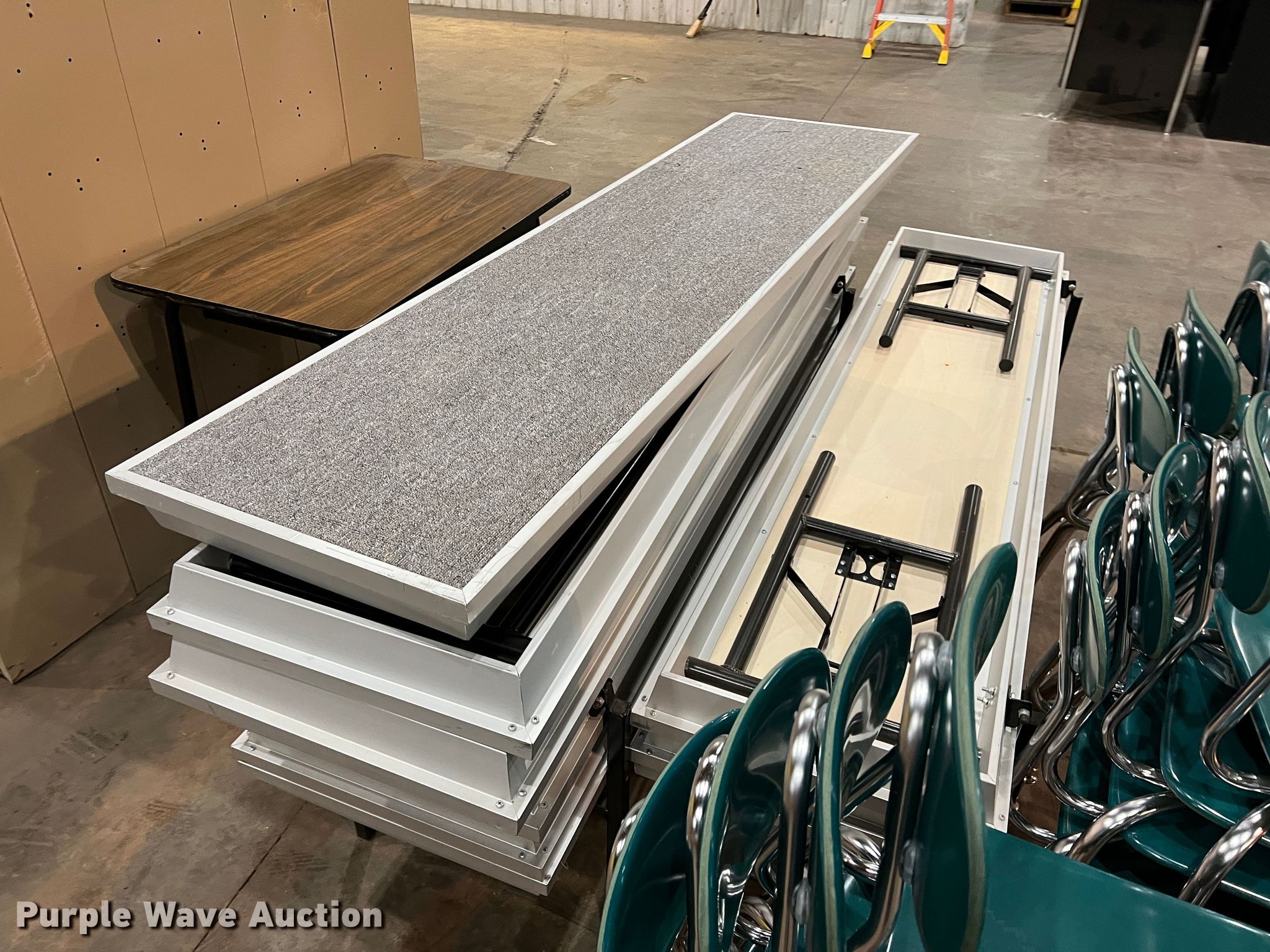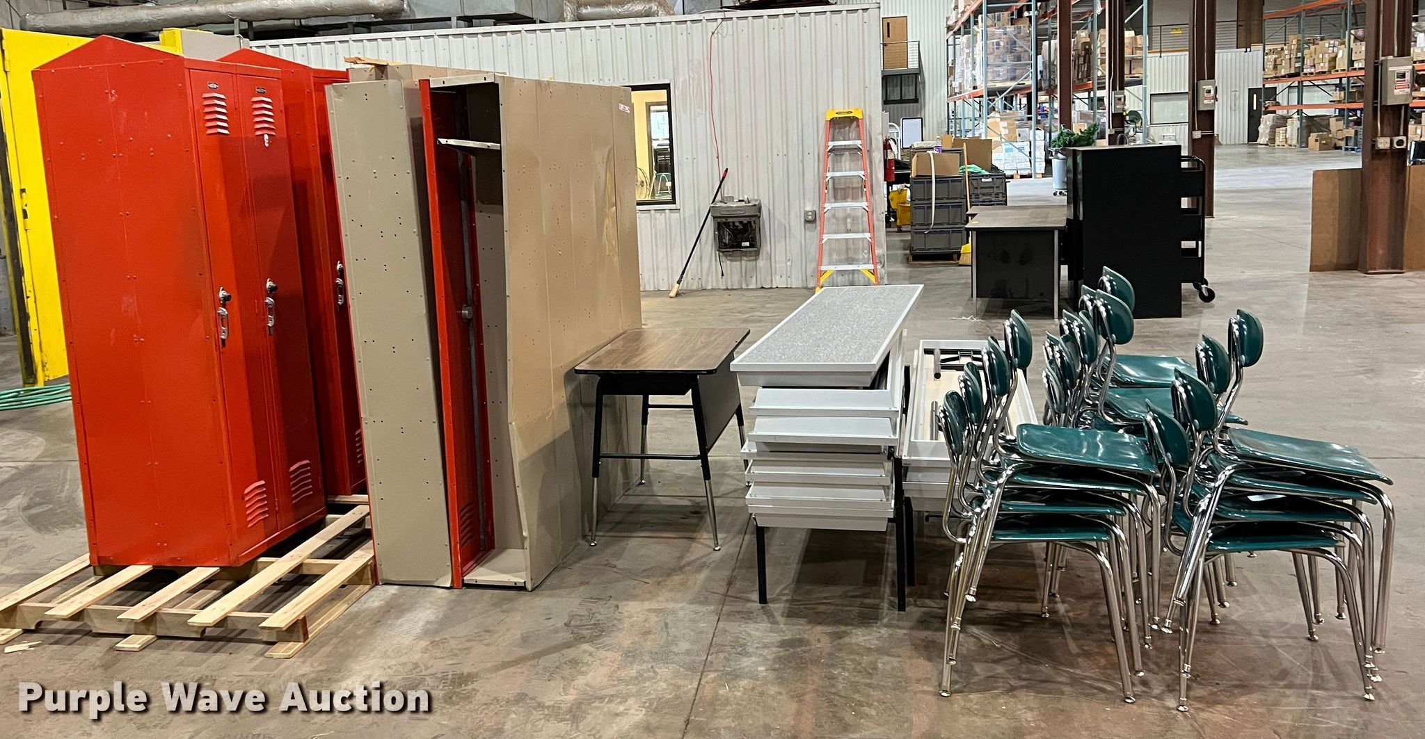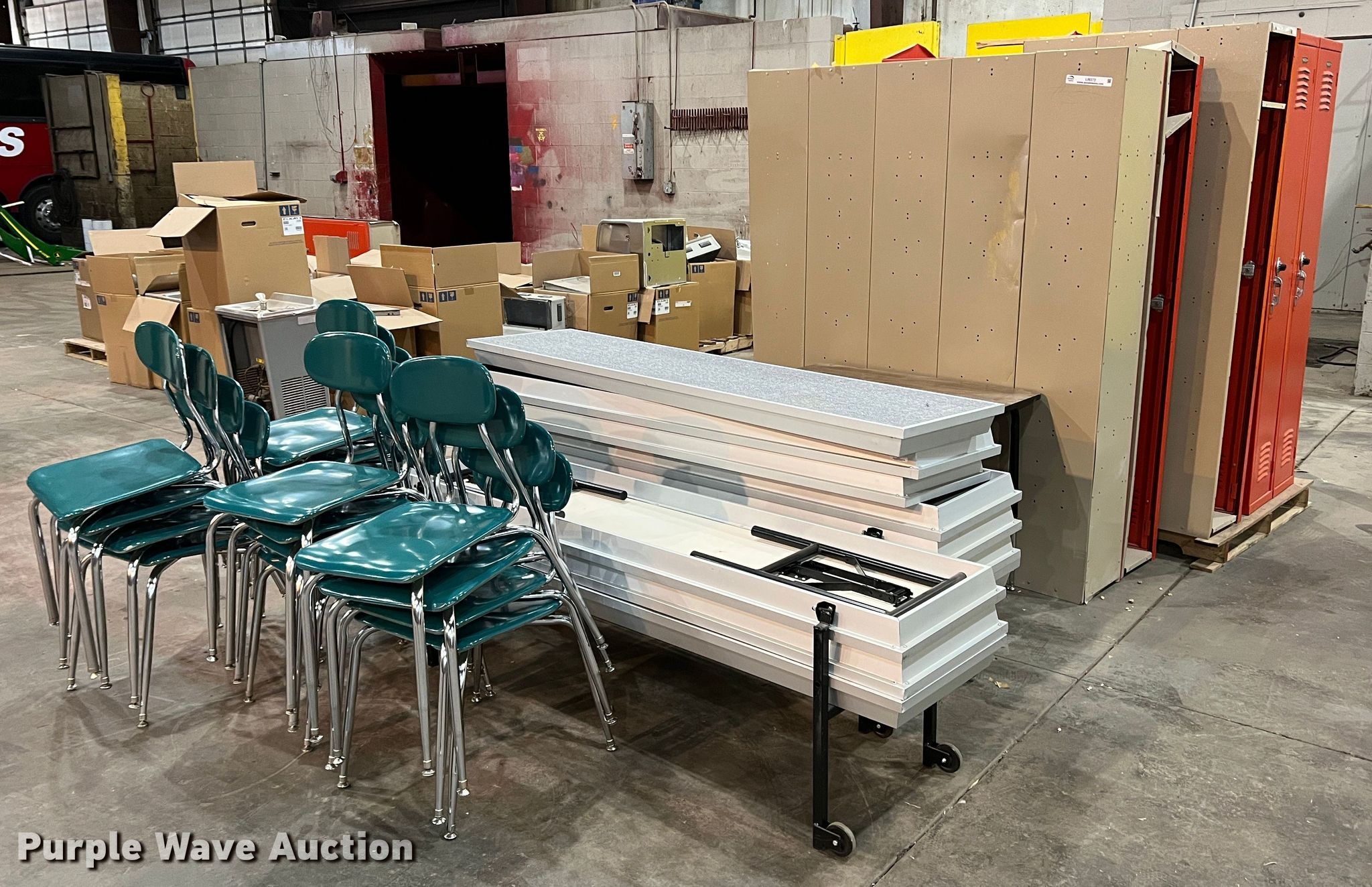 Purple Wave is selling a used Furniture in Kansas. This item is a Furniture with the following: Approx. 16 chairs, (2) band risers, 6' L, Approx. 6 lockers