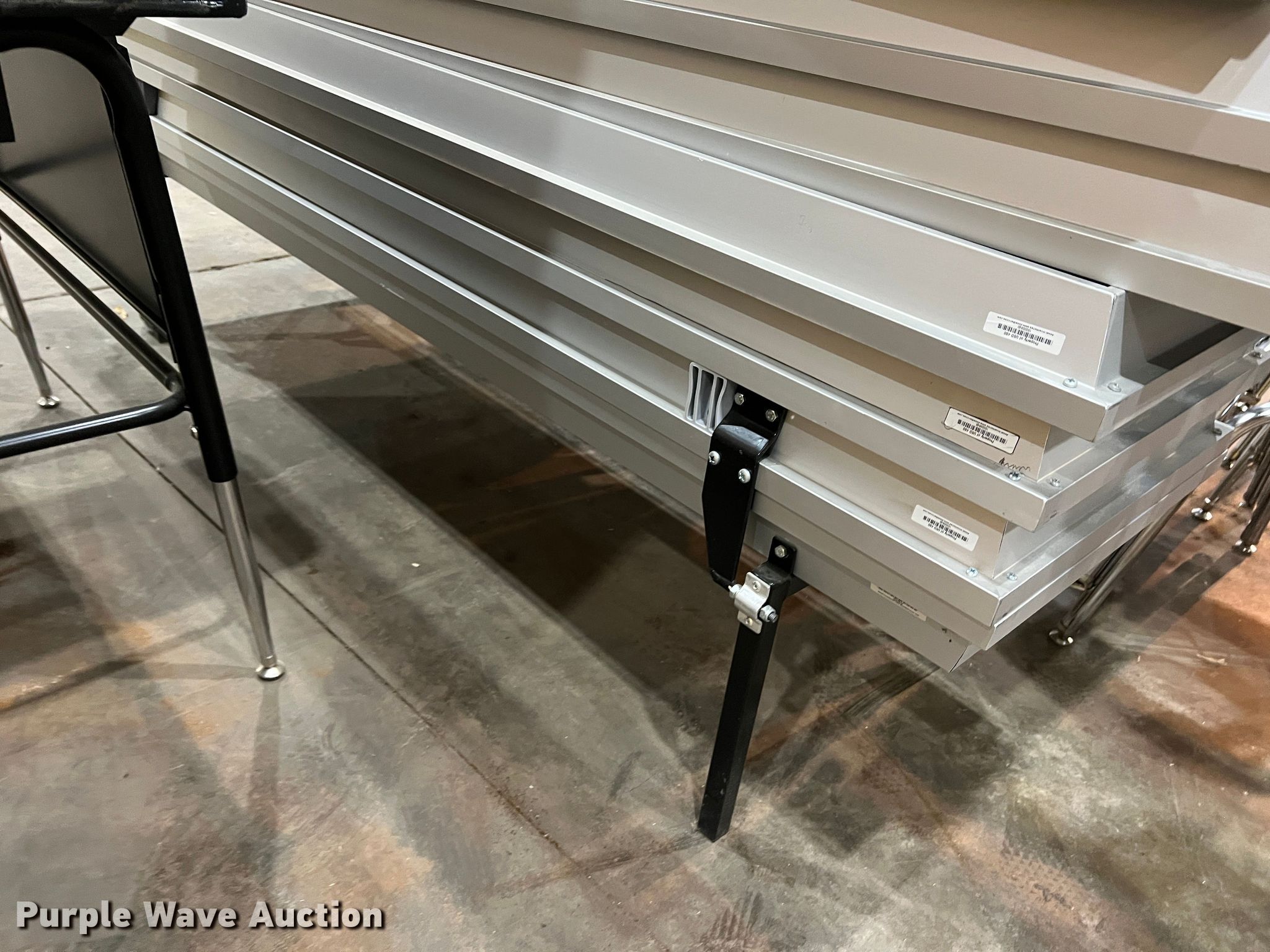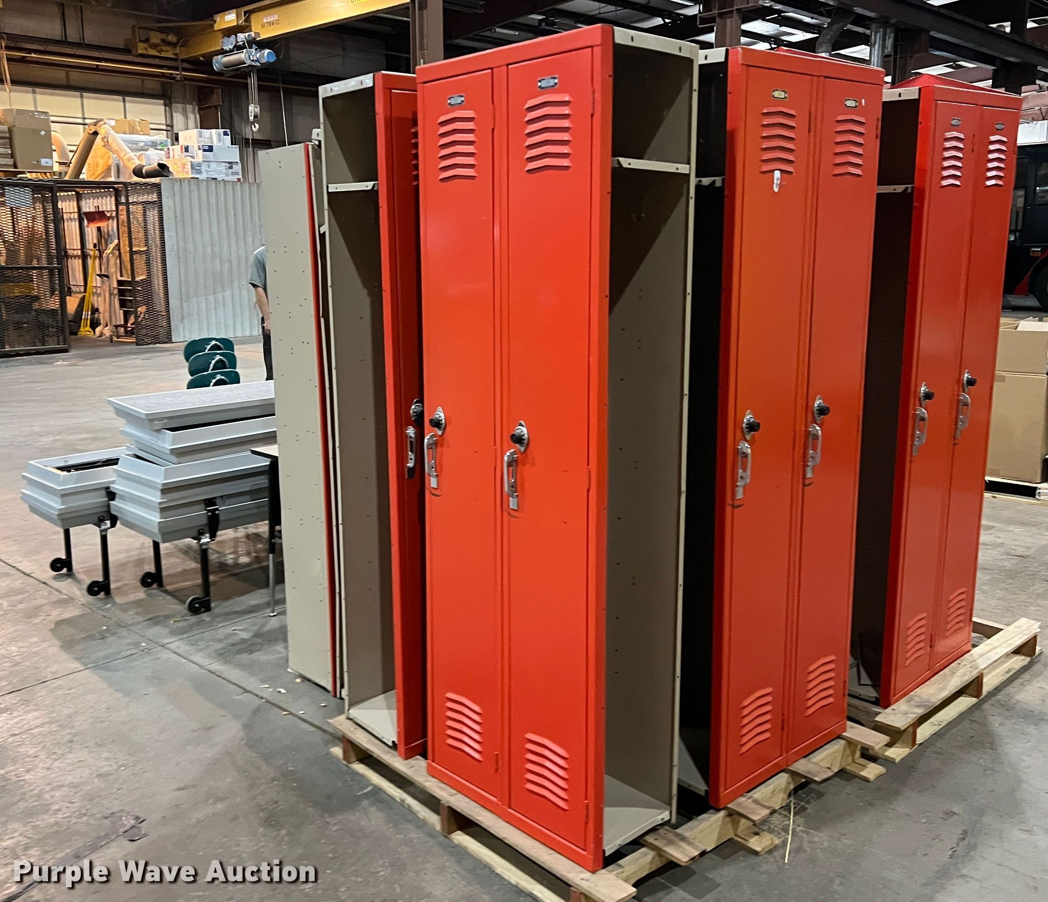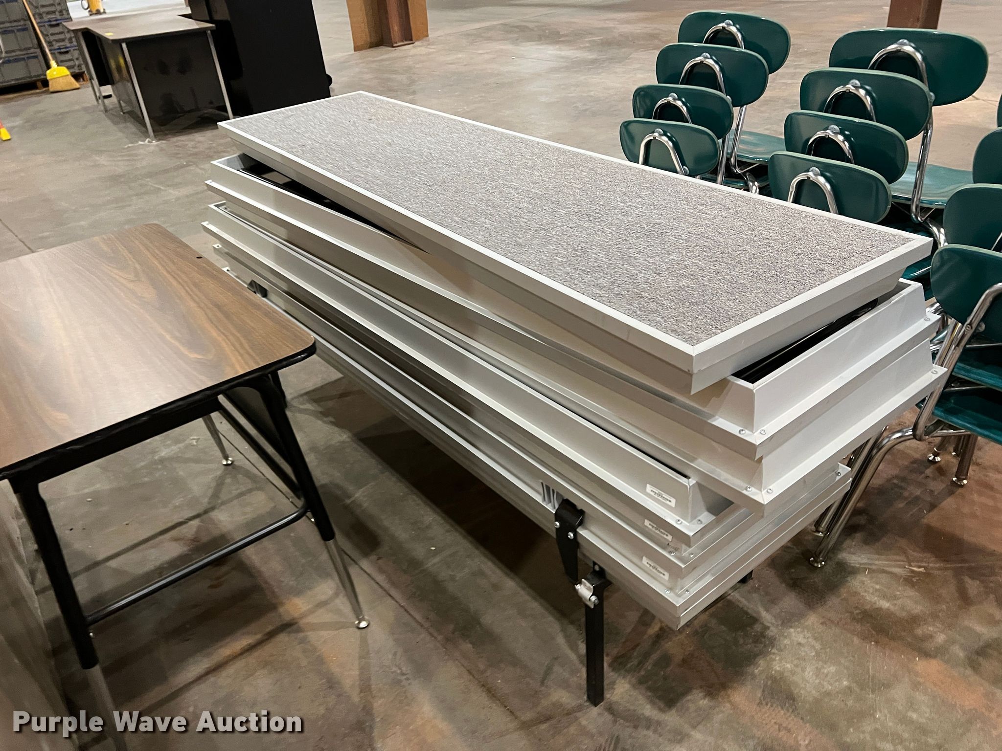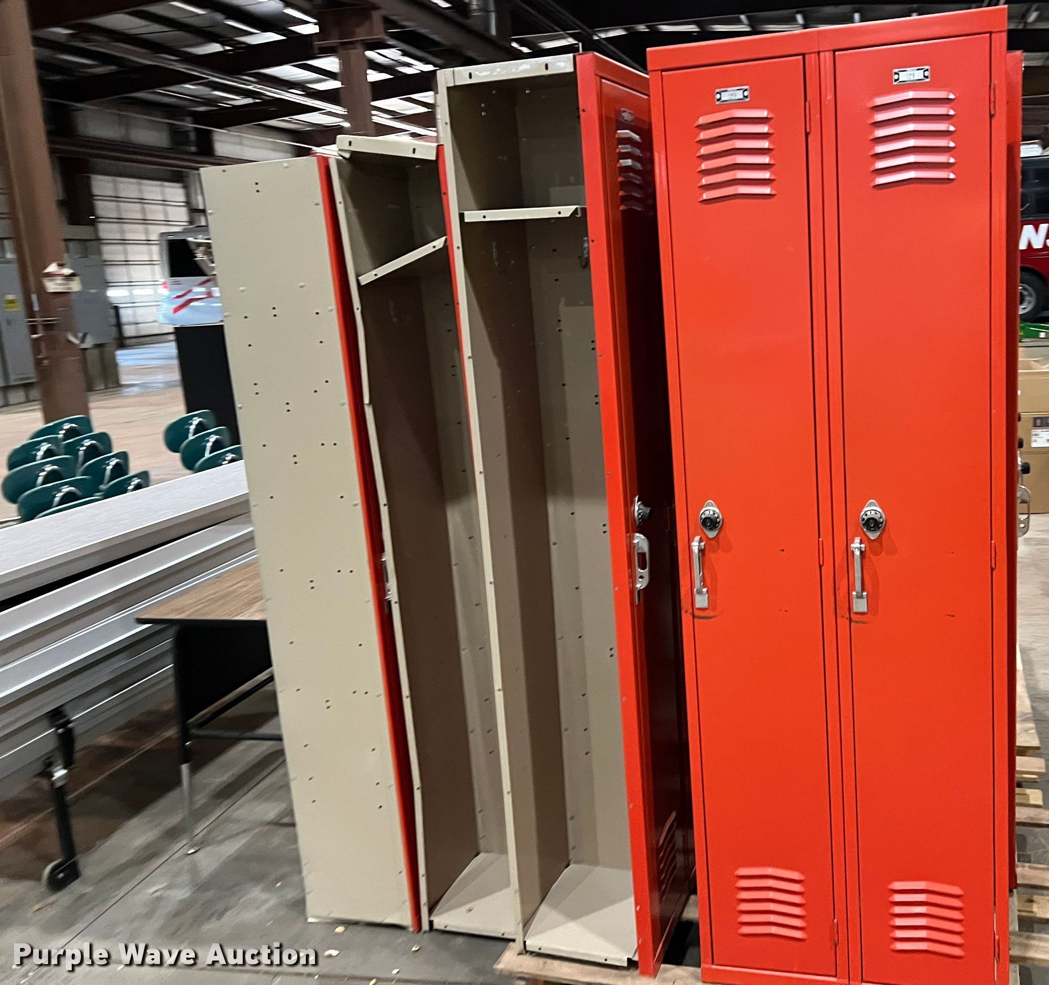 Purple Wave is selling a used Furniture in Kansas. This item is a Furniture with the following: Approx. 16 chairs, (2) band risers, 6' L, Approx. 6 lockers