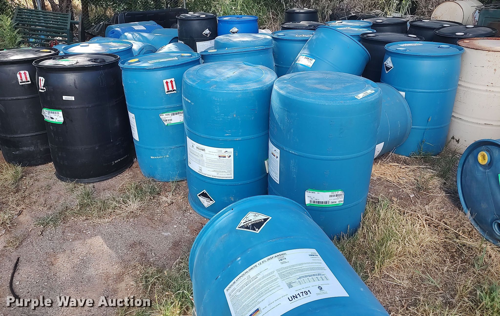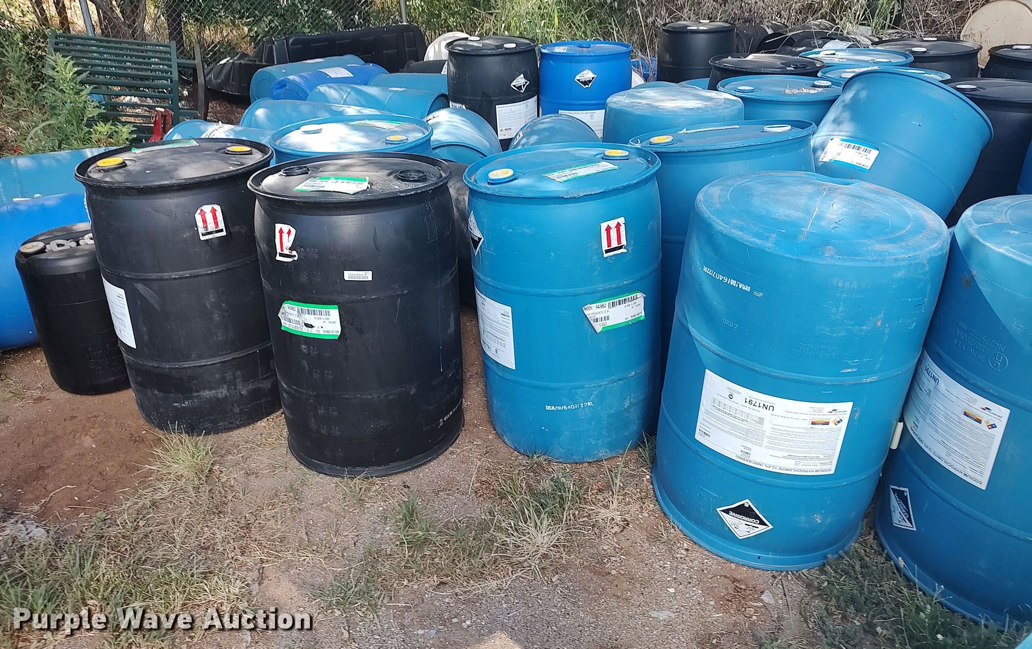 Purple Wave is selling a used Tools in Oklahoma. This item is a Approximately 35 plastic drums with the following: 55 gallon capacity