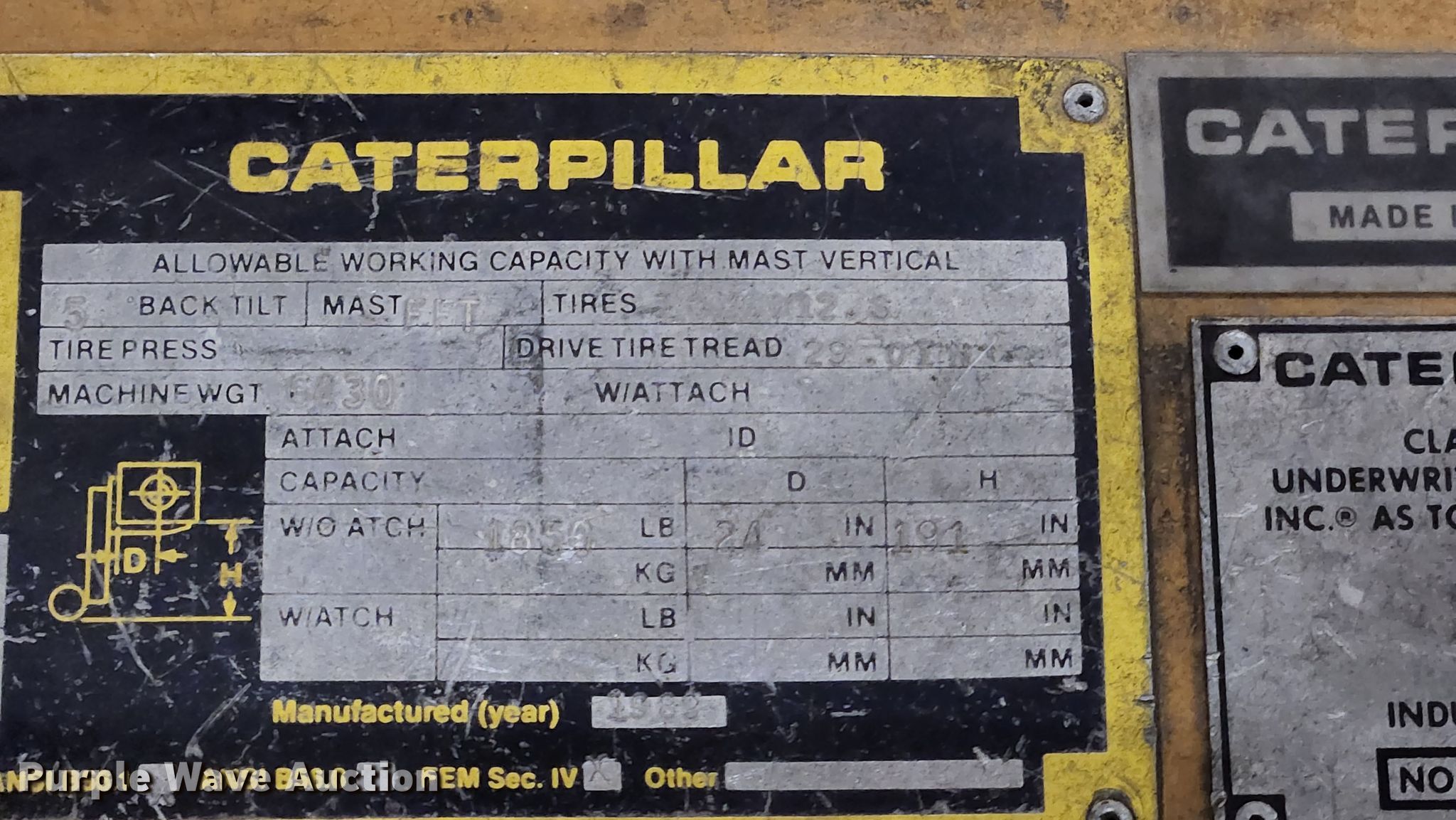 Purple Wave is selling a used Warehouse Forklift in Missouri. This item is a 1989 Caterpillar T30D forklift with the following: Hours: 6,604 on meter, Serial: 5GB5691