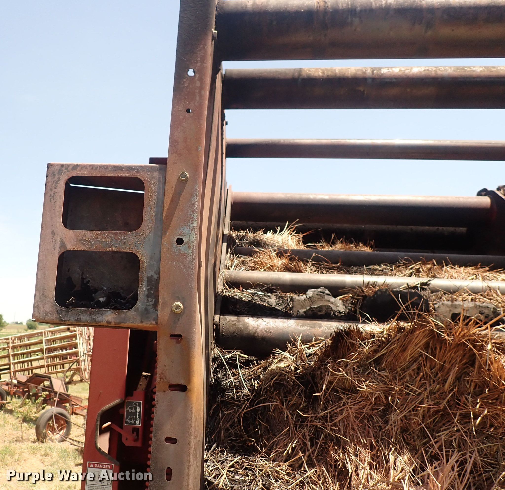 2003 New Holland BR750 round baler. Serial: 34543. Features PTO: 540, Monitor New Holland, Gauge wheels, Pickup width: 60", Hydraulic pickup lift, Bale size: 4'x6', Twine tie, Bale ramp. Tires Size: 31x13.50-15. Notes Fire damage, Non-operational unit. 17200 West 95th Street South. Clearwater, KS 67026