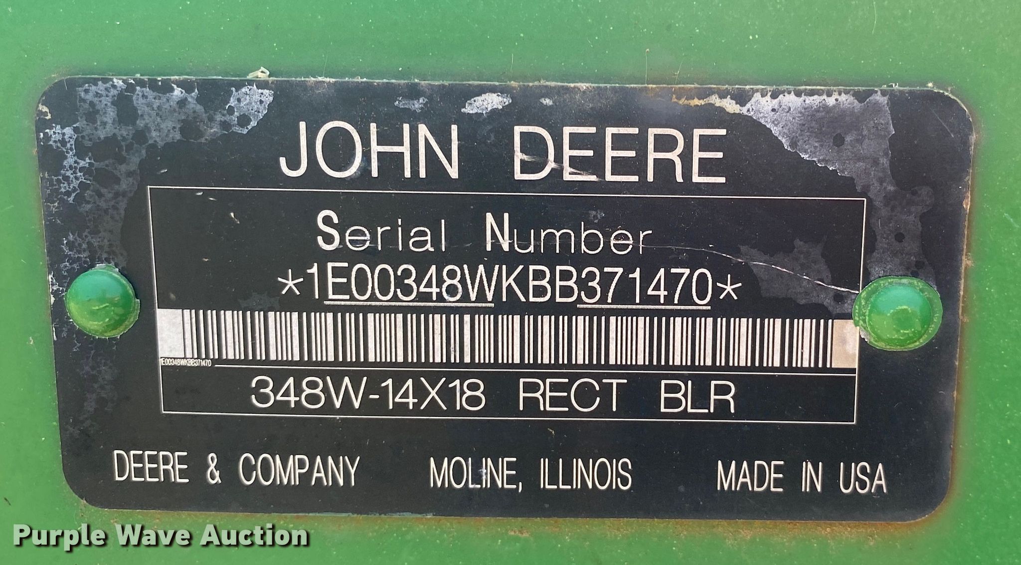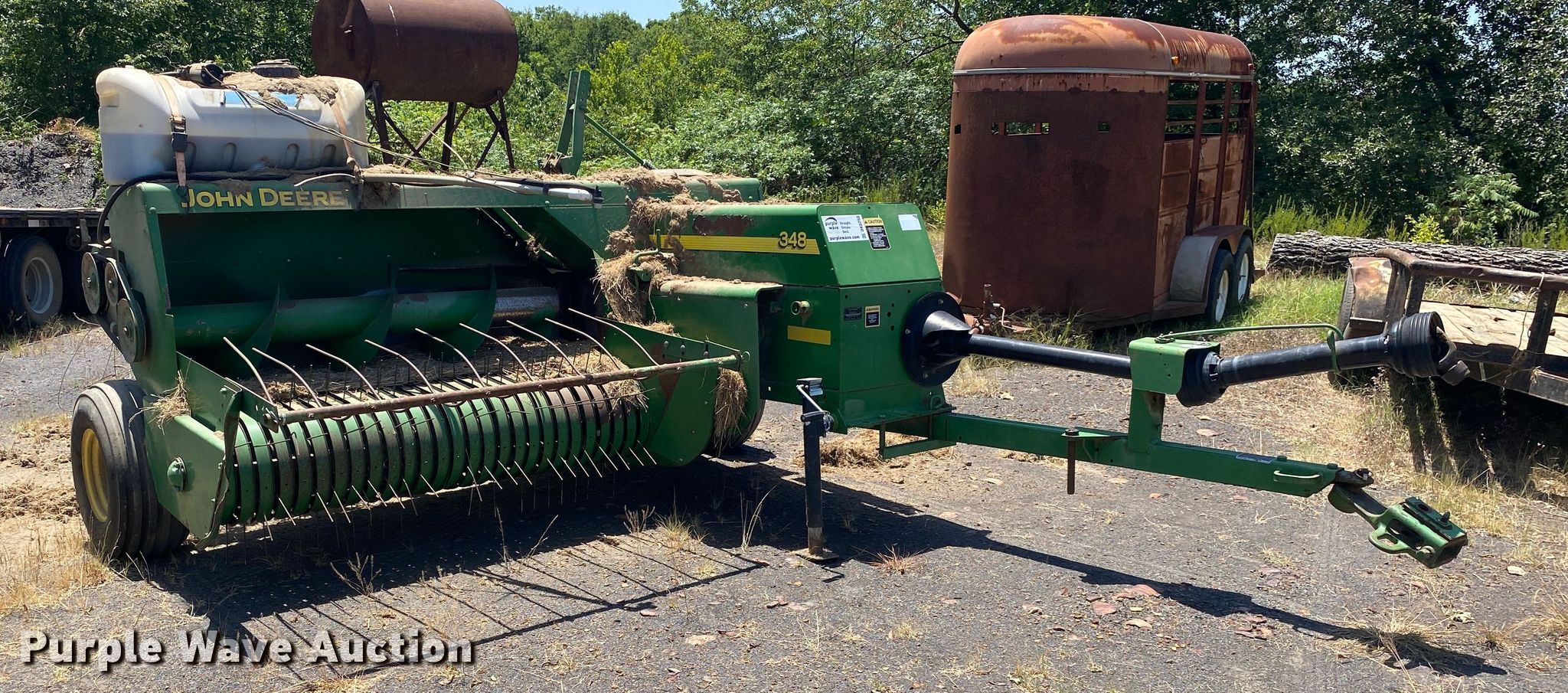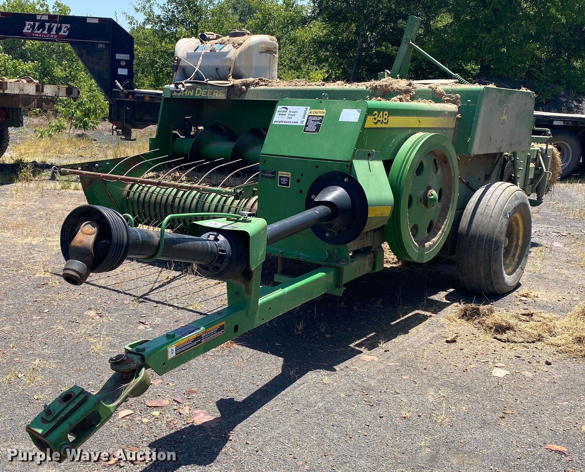 Purple Wave is selling a used Square Baler in Oklahoma. This item is a 2011 John Deere 348 small square baler with the following: Serial: 1E00348WKBB371470