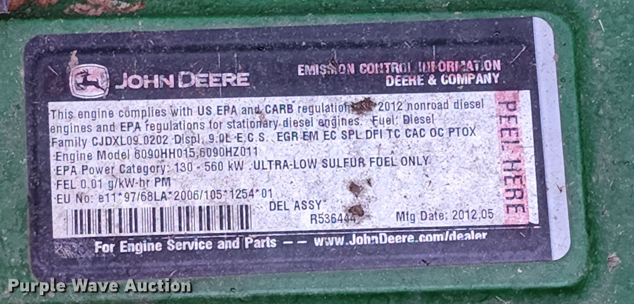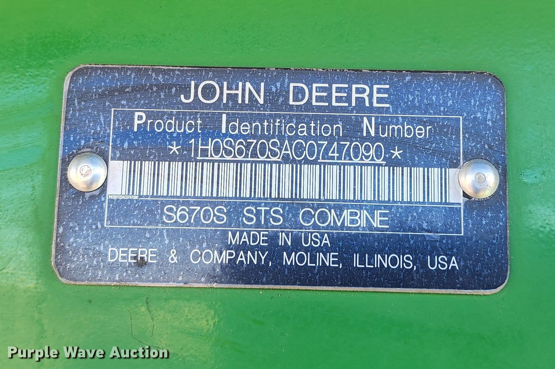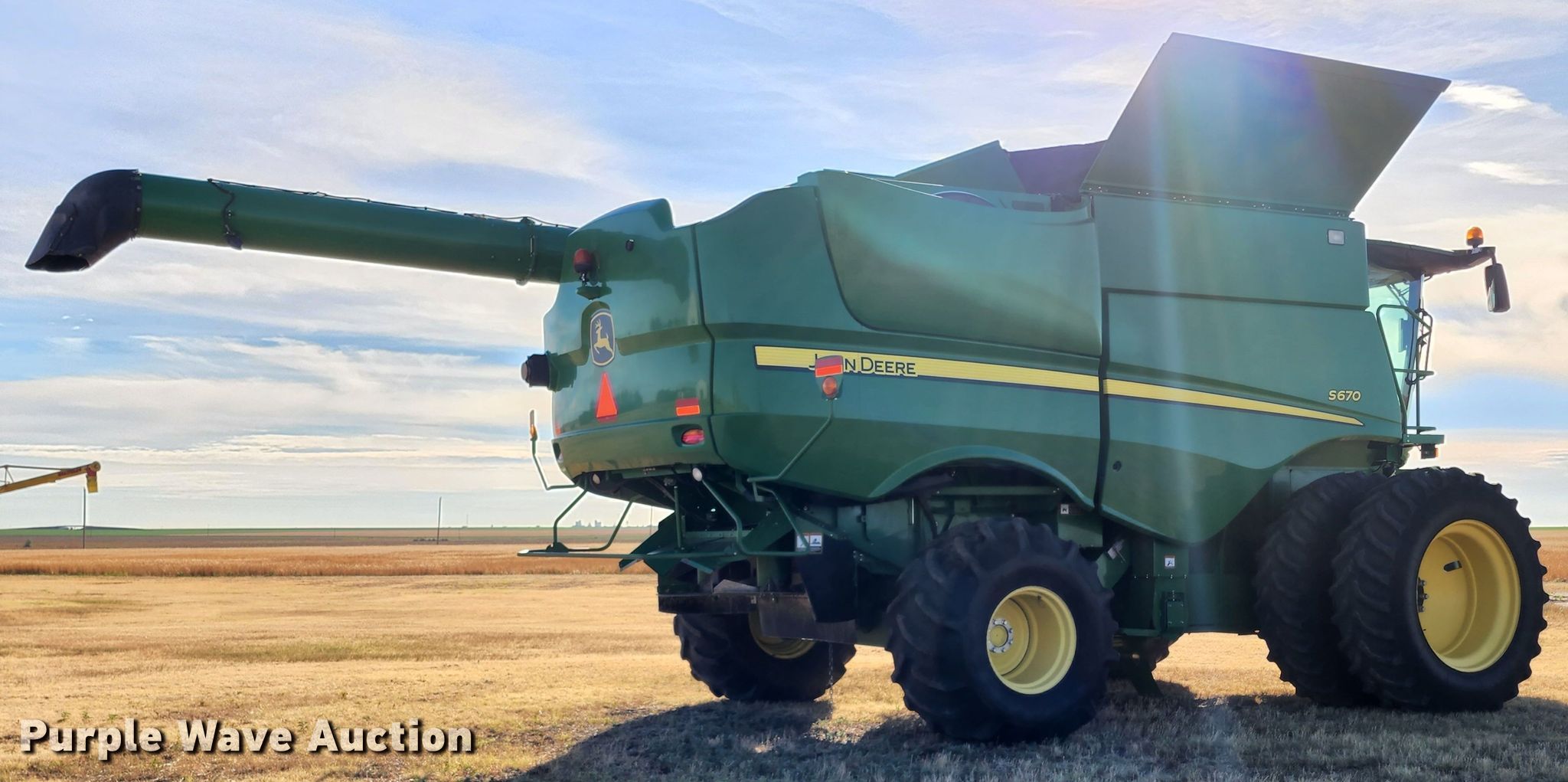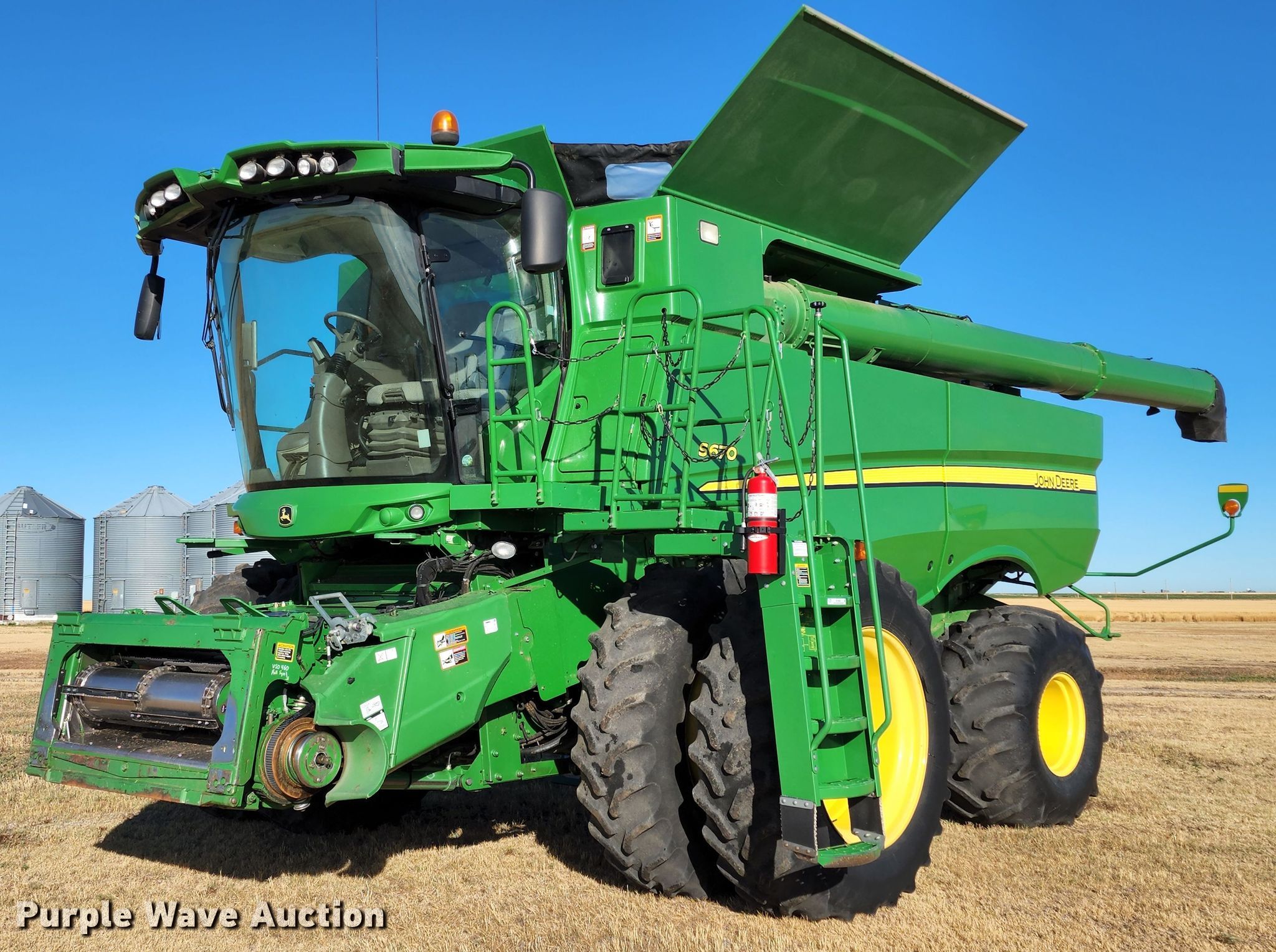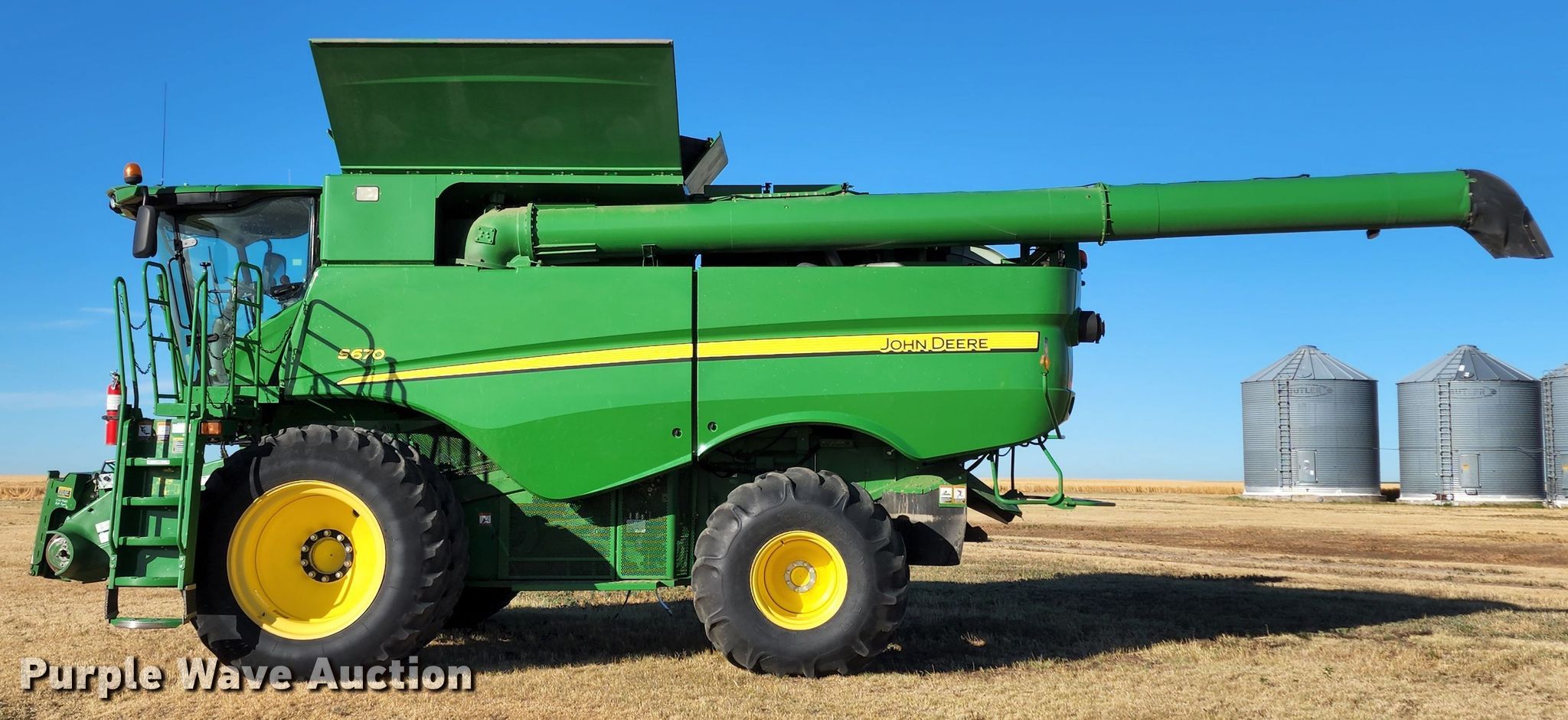 Purple Wave is selling a used Combine in Kansas. This item is a 2012 John Deere S670 combine with the following: Engine hours: 3,382 on meter, Separator hours: 2,557 on meter, Serial: 1H0S670SAC0747090