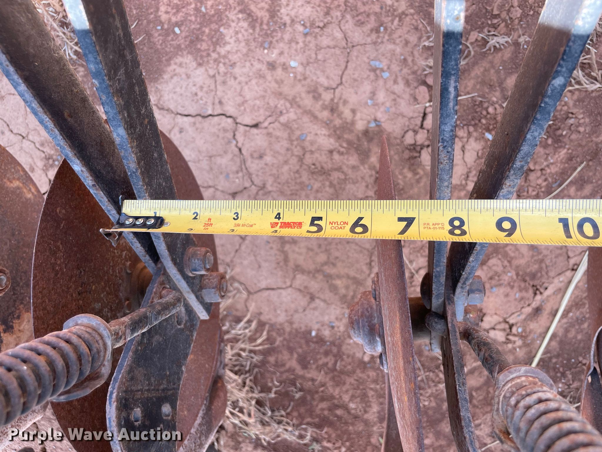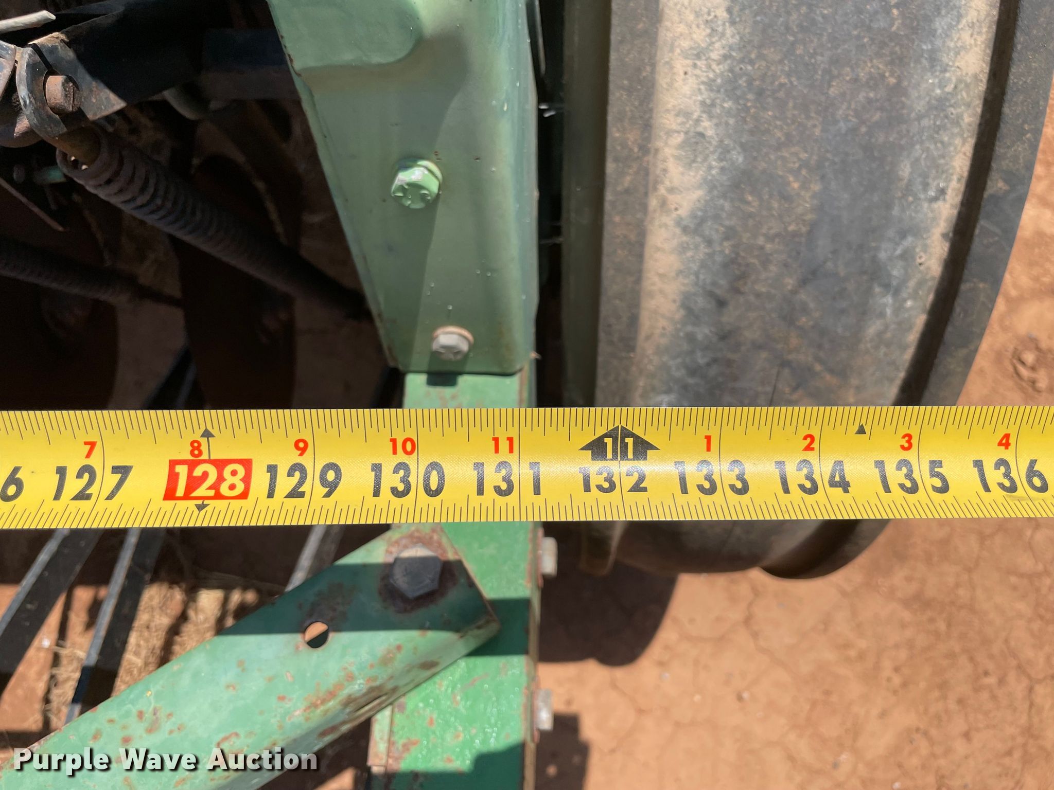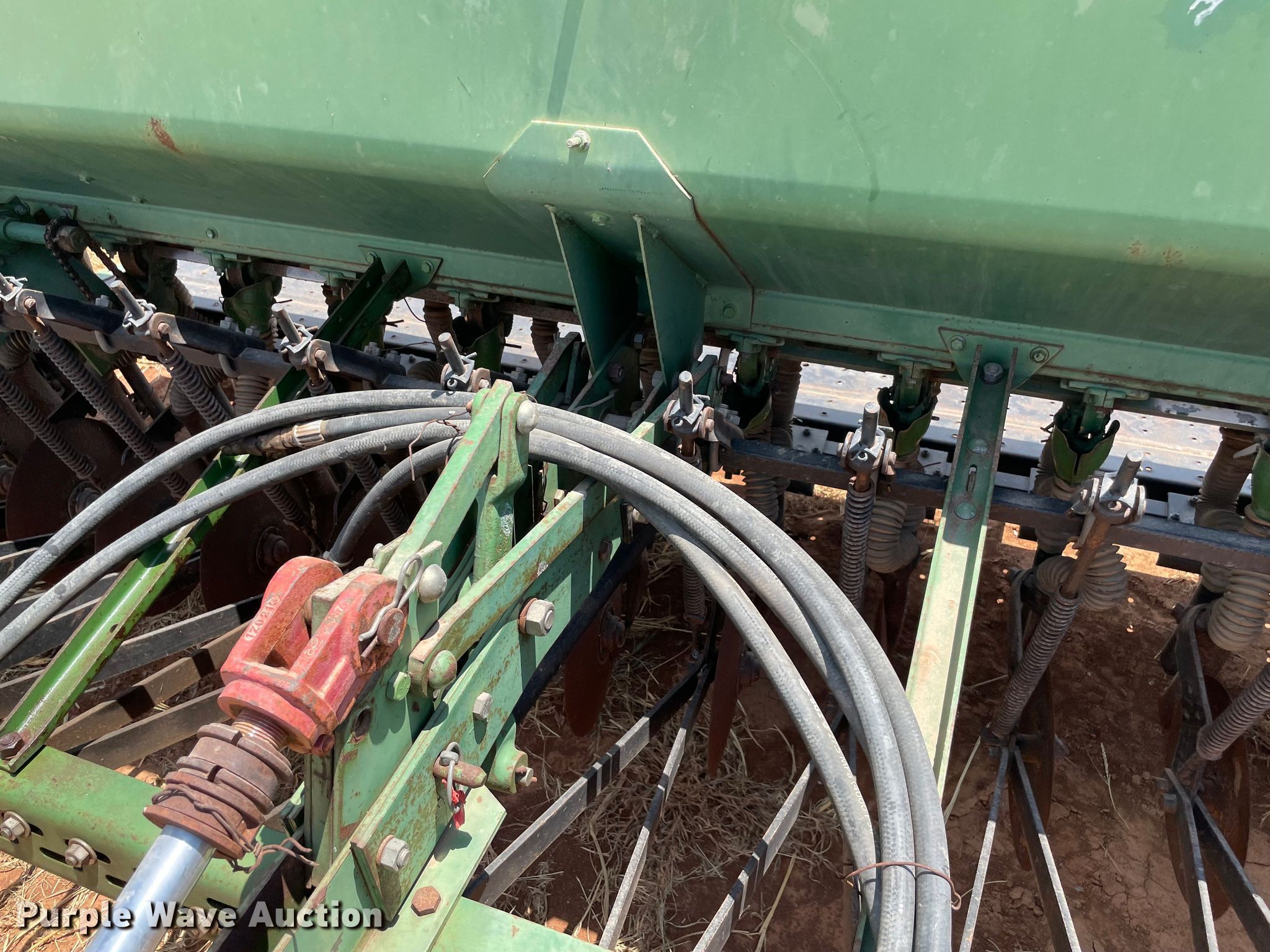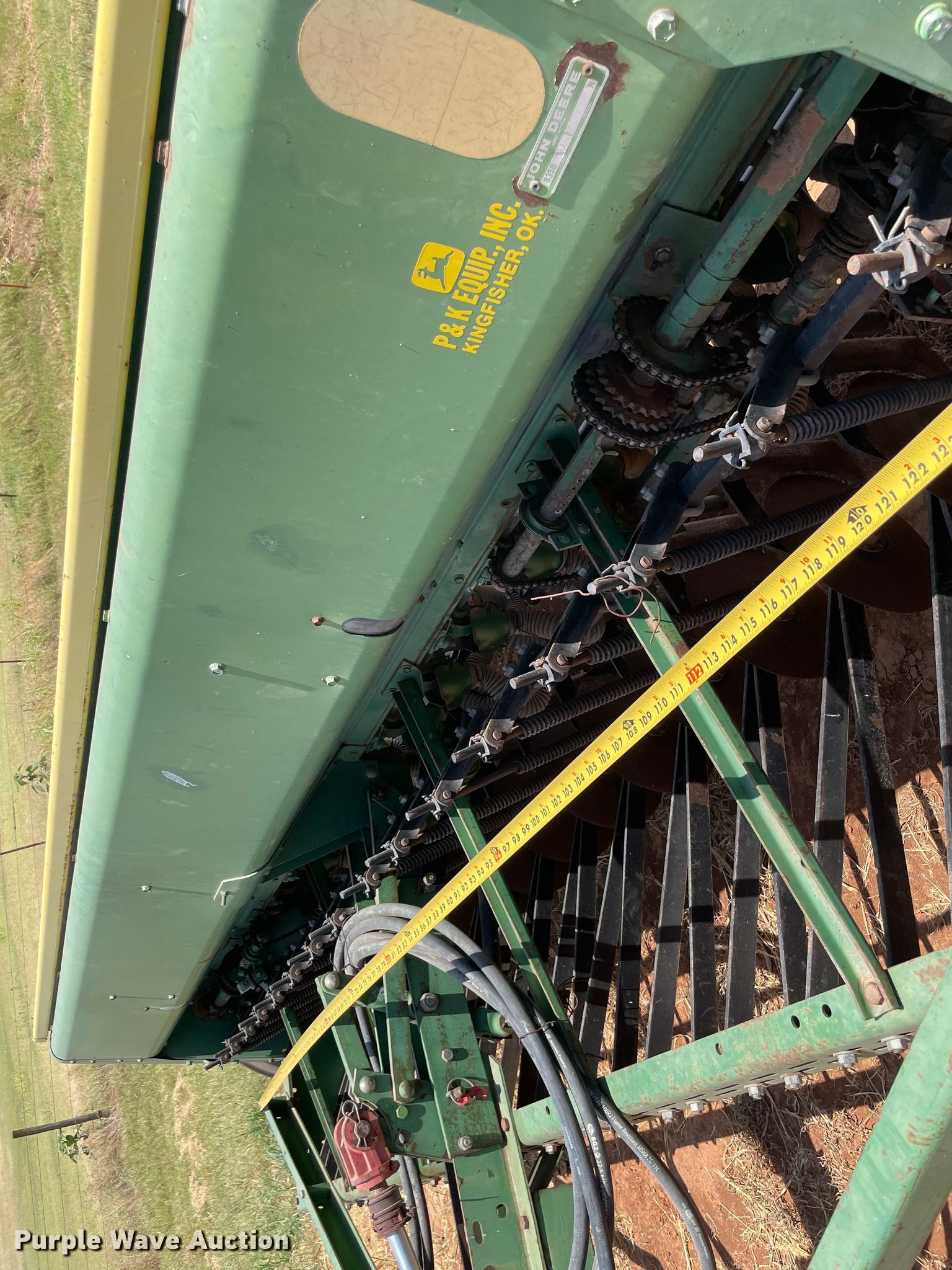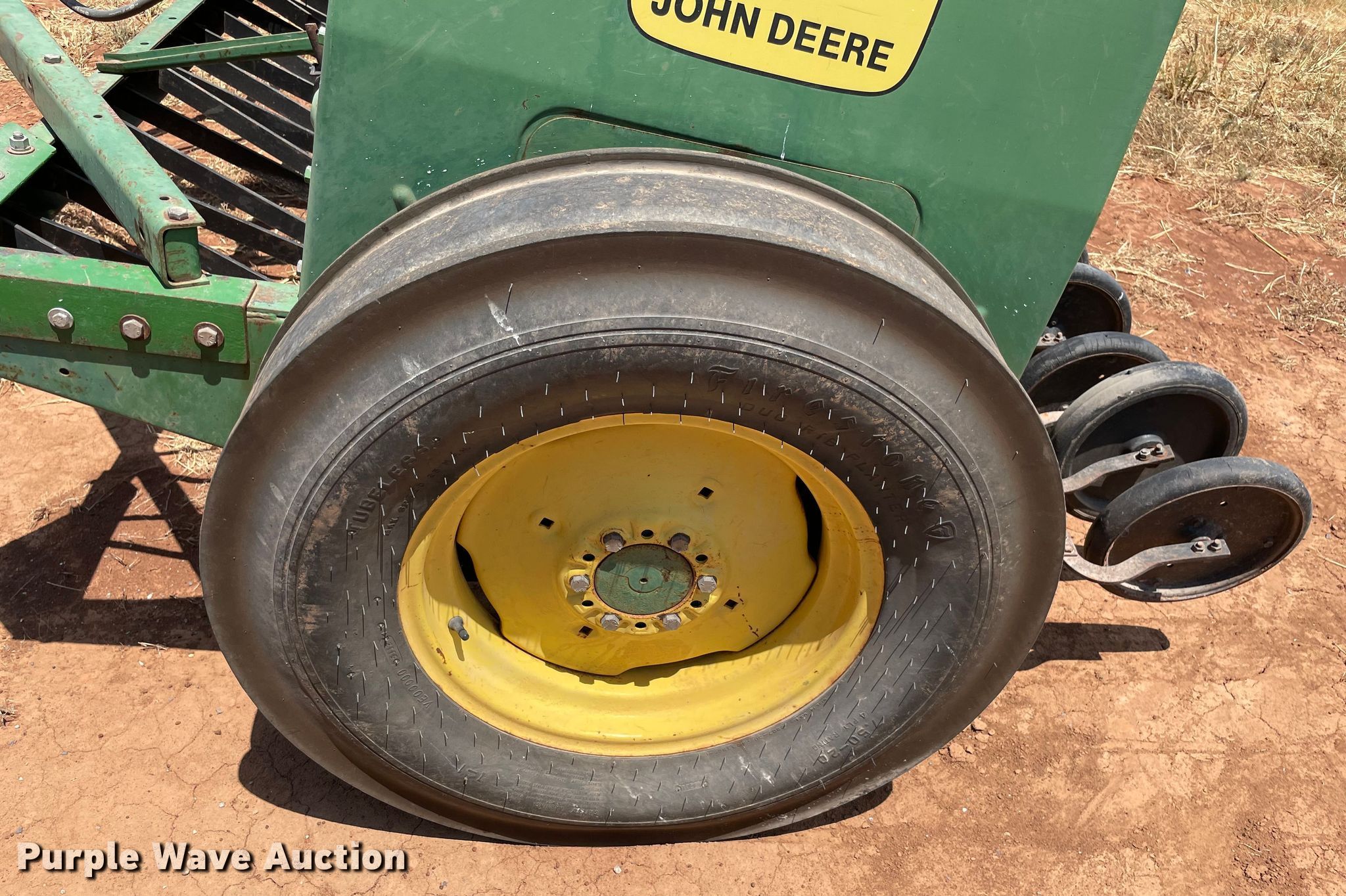 John Deere 8350 grain drill. Width: 11', Row units: 16, Row spacing: 8", Serial: 001749N. Features Seed delivery Bulk fill system, Row units Meter drive: Ground, Down pressure: Spring, Disk openers: Single , Gauge wheels: Single, Closing system: Single Type: Rubber.. Tires Transport tire size: 7.50-20 Quantity: 2. Apache Seed & Supply, LLC. 17022 County Road 1450. Apache, OK 73006