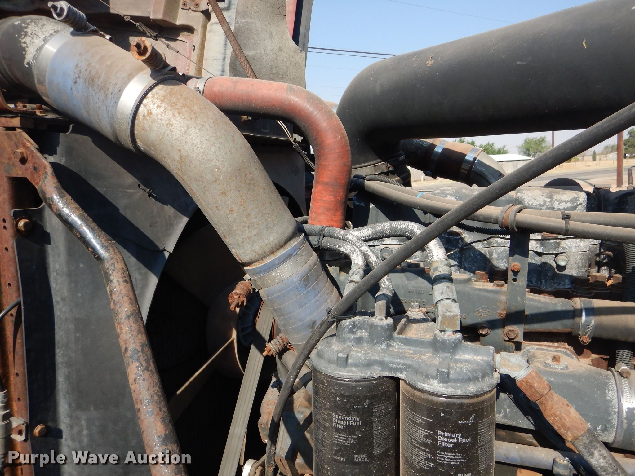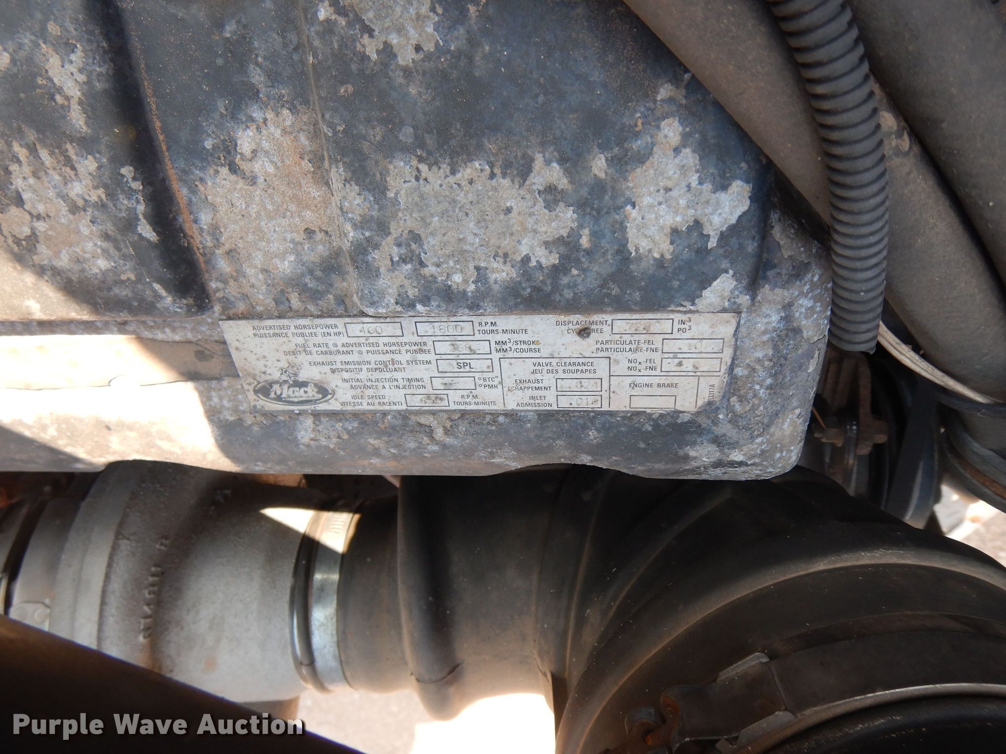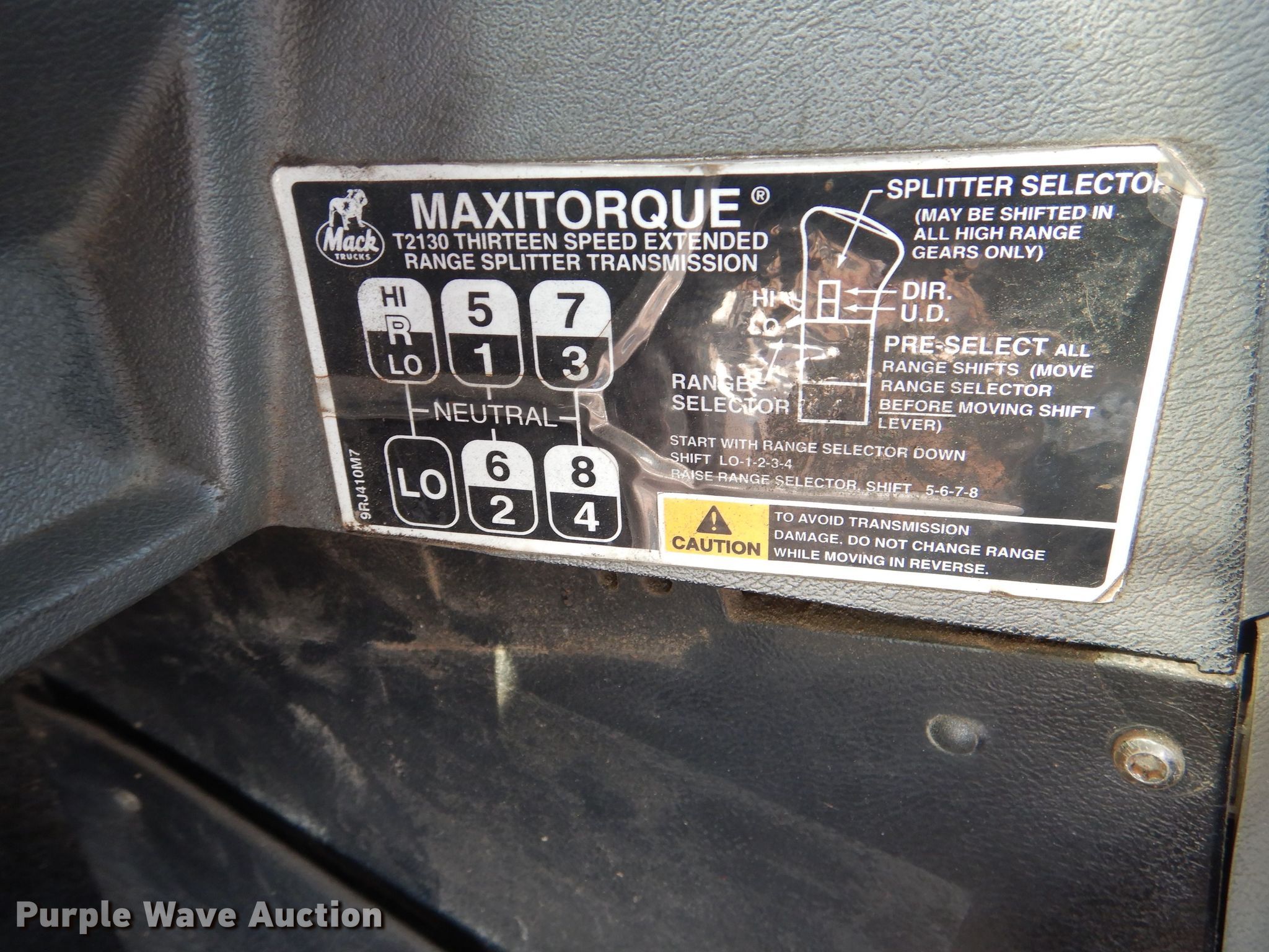 2001 Mack CL713 semi truck. Miles: 104,603 on odometer, Hours: 24,220 on meter, VIN: 1M1AD62Y71M010940. Engine Mack, Displacement: 12.0L, Cylinders: 6, Fuel type: Diesel, HP: 460. Transmission Mack T2130 Maxitorque, Manual, Speed: 13. Chassis Axles: Tandem, Differential lock: Inter-axle, Suspension: Air, Brakes: Air, PTO, GVWR: 60,000 lbs FAWR: 20,000 lbs, IAWR: 20,000 lbs, RAWR: 20,000 lbs, Wheelbase: 168". Interior AC, Heat, Cruise control. Features Deck plate: Steel, Fifth wheel type: Air operated, Sliding, Fuel tank: Dual. Tires Front: 385/65R22.5, Rear: 11R22.5. Texas title. Title has a lien that will be released following the close of the auction. Title distribution may be delayed up to 30 days from verification of funds. Slaton, TX 79364