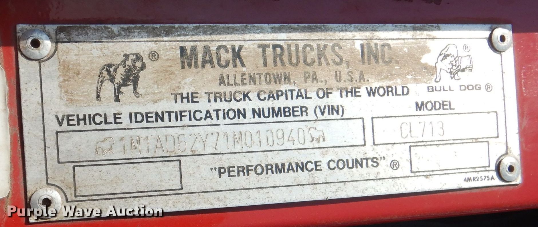 Purple Wave is selling a used Truck Tractor in Texas. This item is a 2001 Mack CL713 semi truck with the following: Miles: 104,603 on odometer, Hours: 24,220 on meter, VIN: 1M1AD62Y71M010940