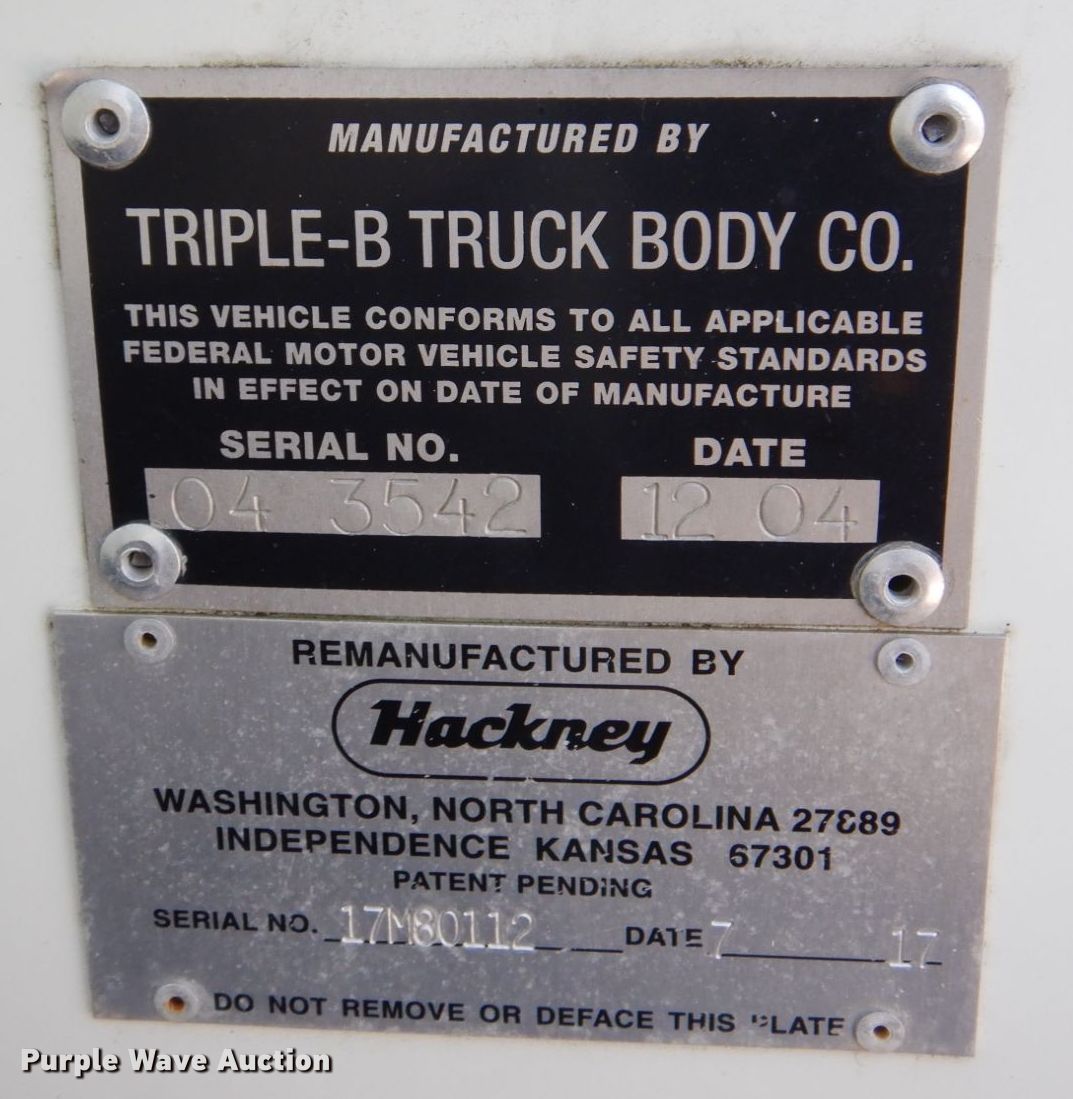2005 Freightliner Business Class M2 delivery truck. Miles: 238,037 on odometer, Hours: 10,505 on meter, VIN: 1FVACYDJX5HU28619. Engine Mercedes Benz OM926 LA, Displacement: 7.2L, Cylinders: 6, Fuel type: Diesel. Transmission Automatic. Chassis Axles: Single, Suspension: Spring, Brakes: Air, GVWR: 35,600 lbs. Interior AC, Heat, Heated mirrors, Power windows, Power locks. Features Delivery bed Triple B Truck Body, Serial: 04 3542, 24'4" L x 99" W x 96" H, Floor: Aluminum. Tires Front: 285/75R24.5, Rear: 11R22.5. Notes Windshield chipped or cracked, Non-operational engine, Unit must be towed or hauled, Non-operational unit. Illinois title. 410 West Maple Avenue. Manlius, IL 61338
