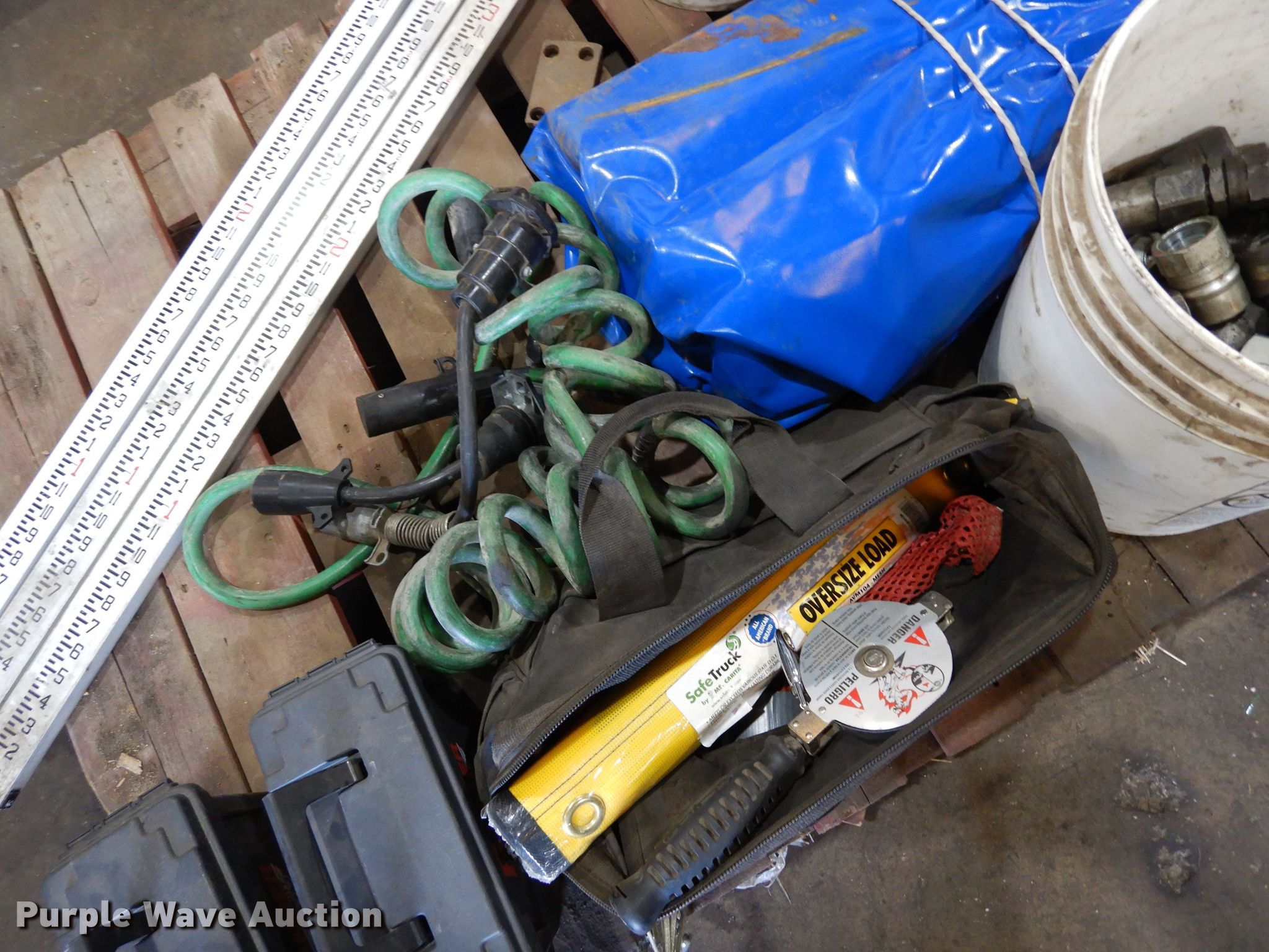 Purple Wave is selling a used Trailer Other in Colorado. This item is a Trailer parts with the following: Hydraulic fittings, Tarp, Flags, Oversized load markers, (3) CST Berger measuring sticks, (2) Light Ranger Mutt trailer testers