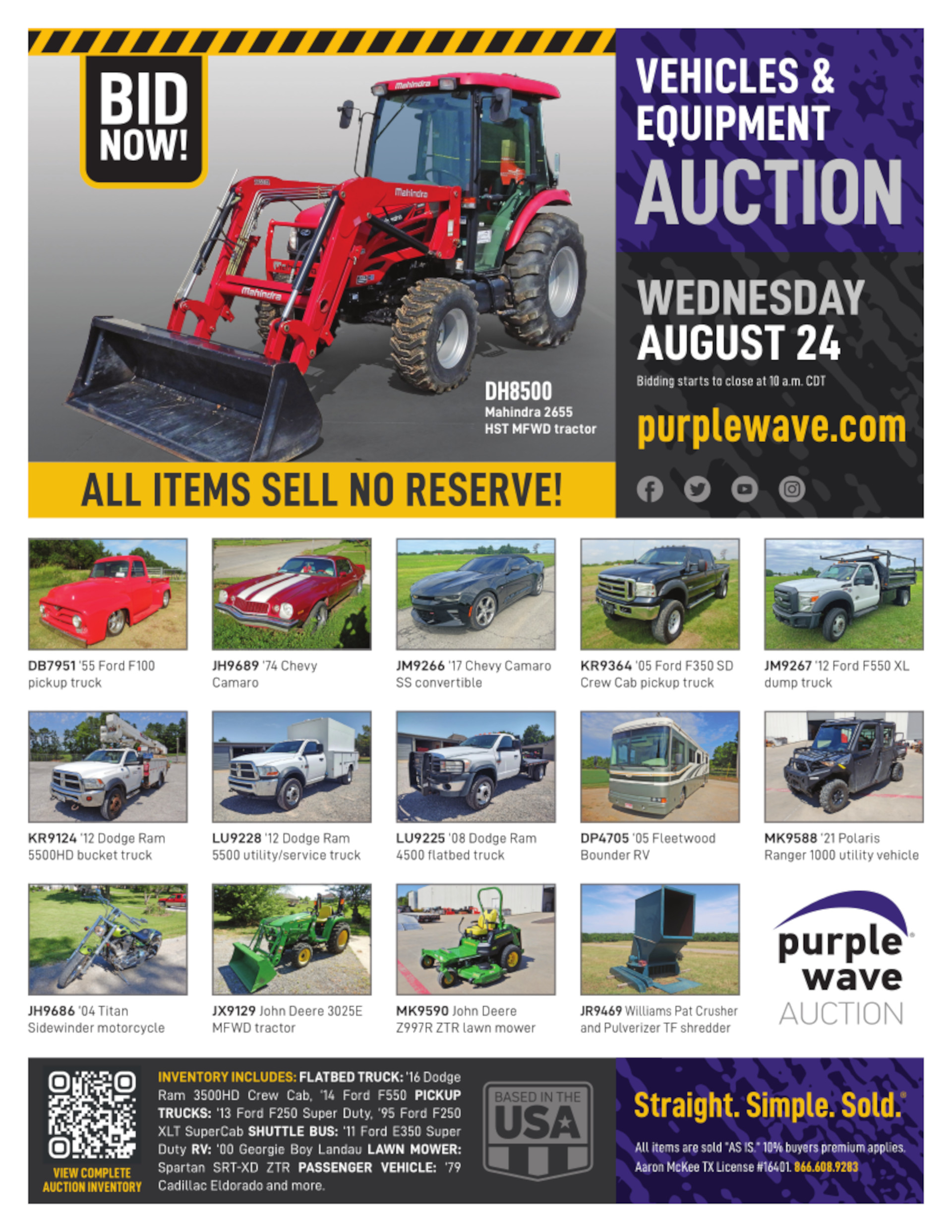 This auction is conducted by Purple Wave, Inc., whose home office is 825 Levee Drive, Manhattan, Kansas. Aaron McKee, Texas auctioneer license # 16401, operates Purple Wave, Inc. Complaints against us may be directed to the Texas Department of Licensing and Regulation, P.O. Box 12157, Austin, Texas 78711, (512) 463-6599. For additional required information, see the attached document.