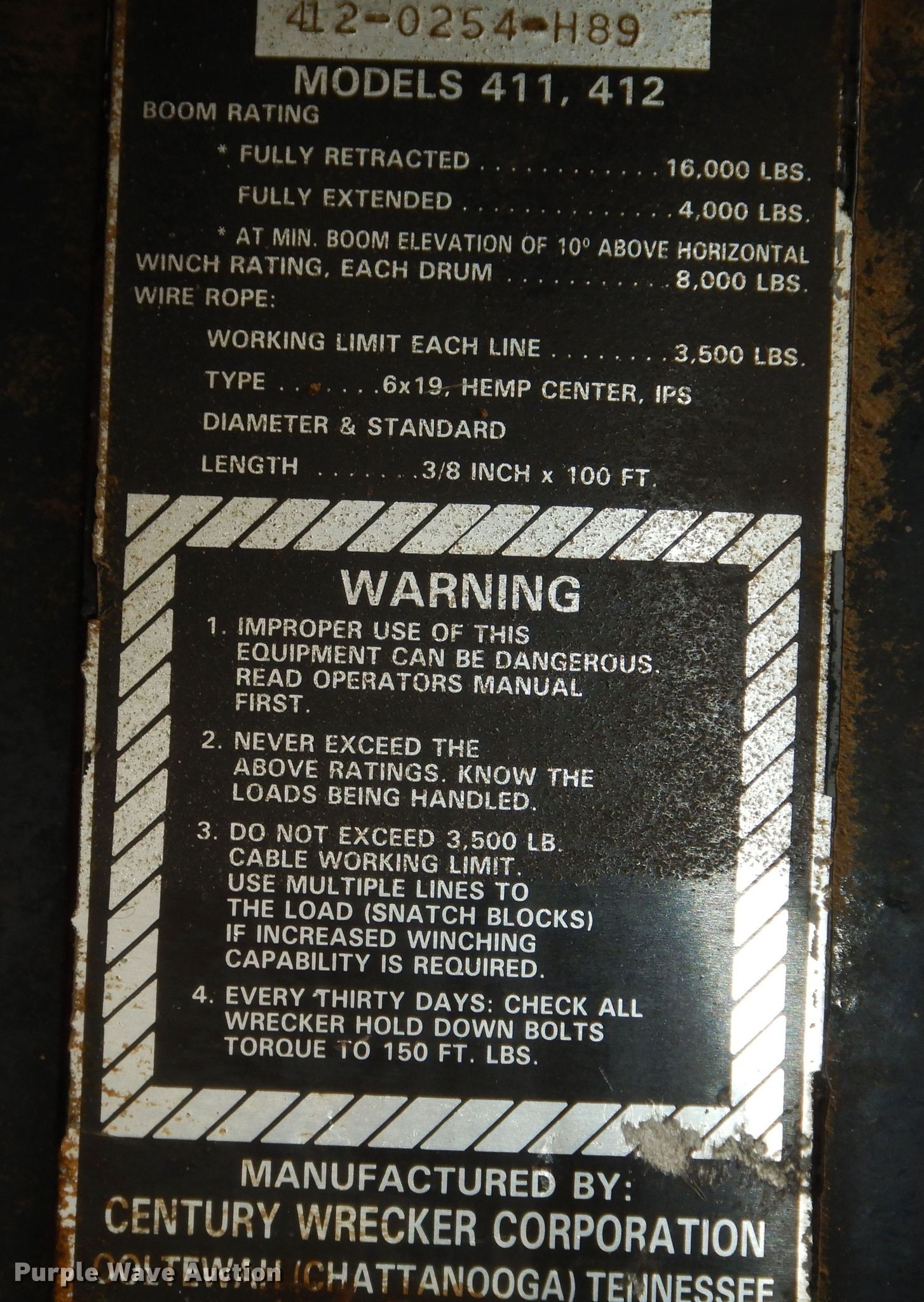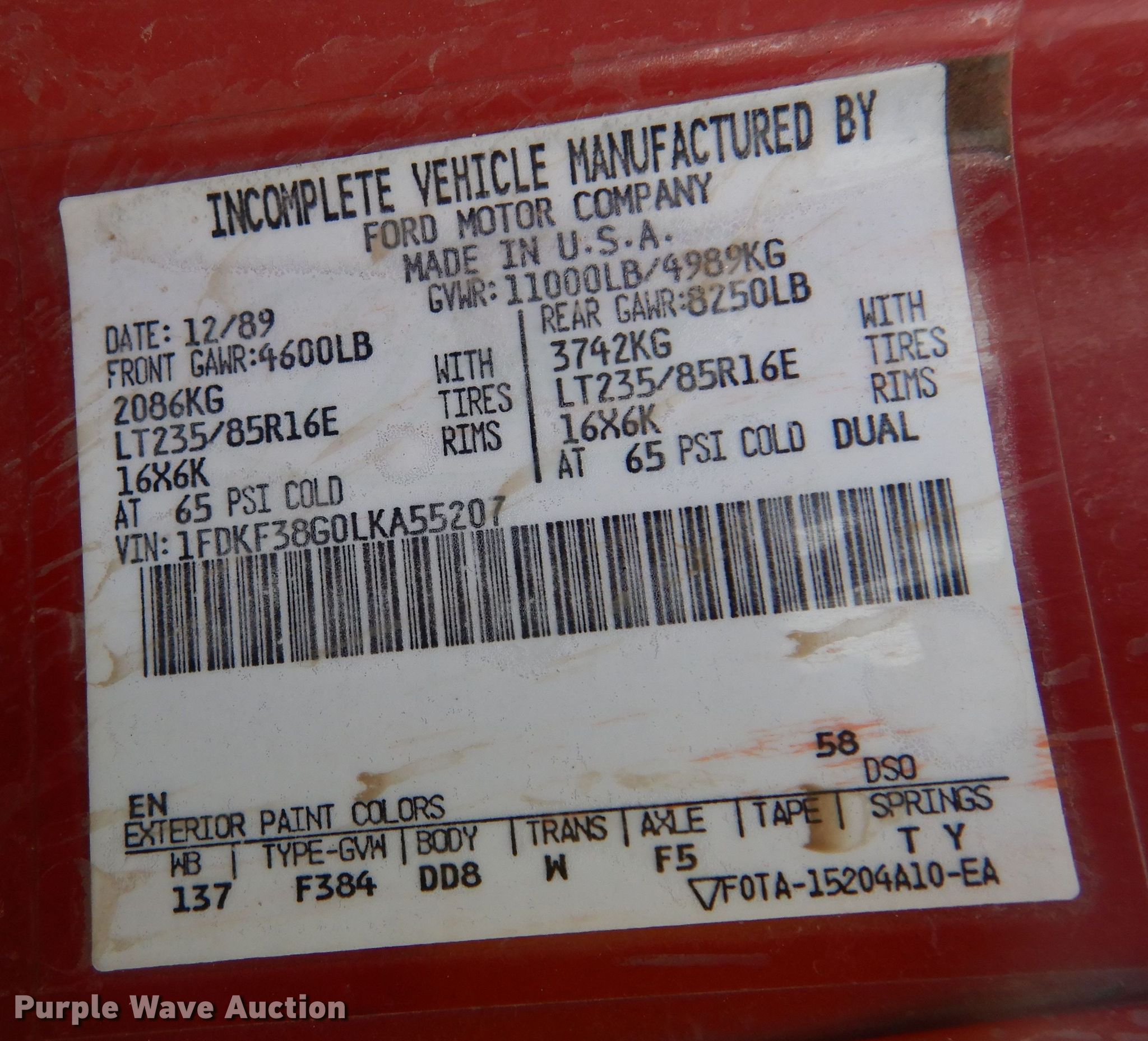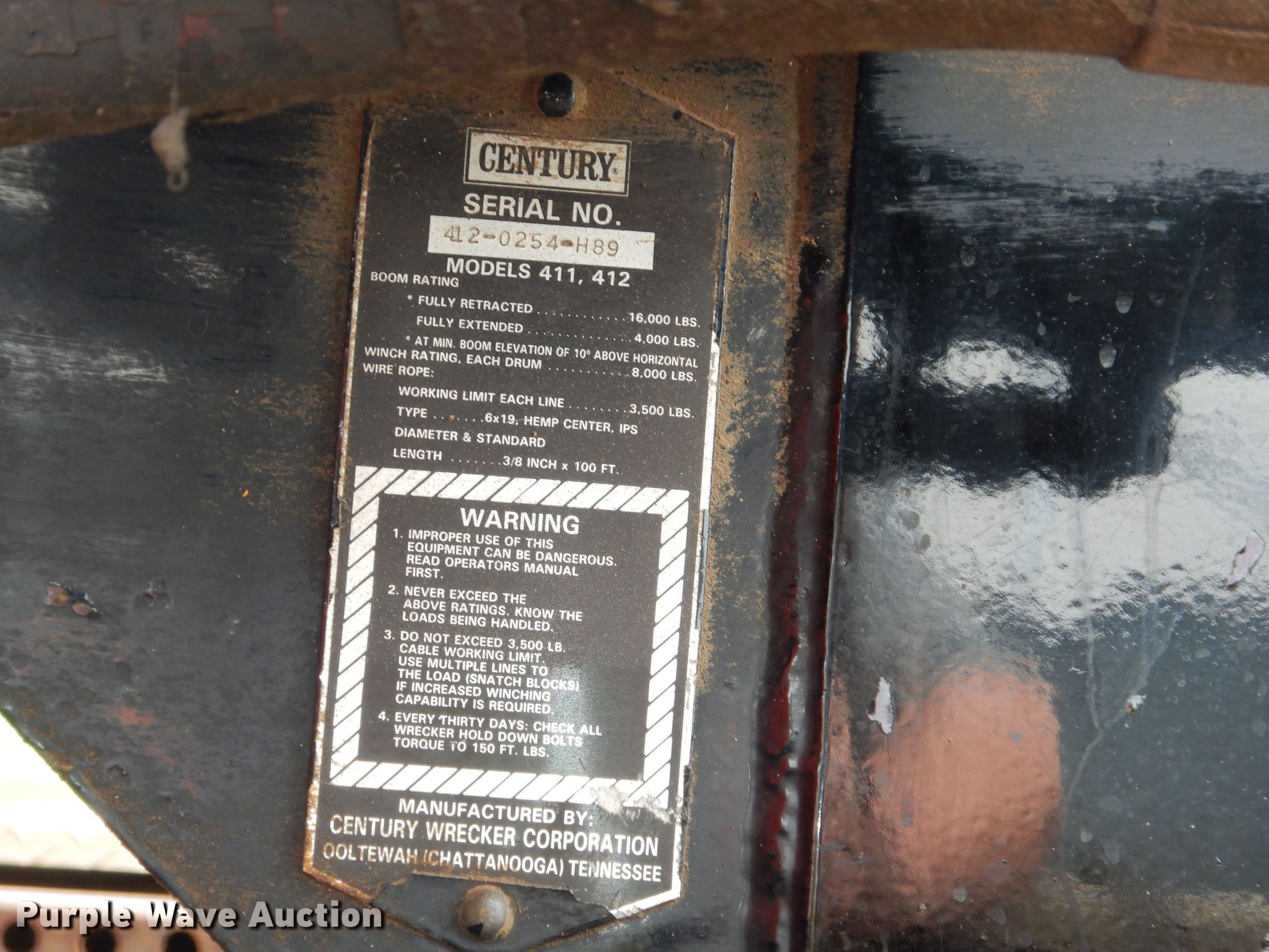 1990 Ford F350 XLT Lariat tow truck. Miles: 2,197 on odometer, VIN: 1FDKF38G0LKA55207. Engine Displacement: 460 C.I.D., Cylinders: 8, Fuel type: Gas. Transmission Manual, Speed: 5. Chassis Four wheel drive, Axles: Single, Suspension: Spring, Brakes: Hydraulic, GVWR: 11,000 lbs, Wheelbase: 139". Interior AC, Heat, Power windows, Power locks, Cruise control. Features Wrecker bed Century, 8' x 7' W x 3" W, Wrecker boom: Hydraulic extendable Capacity: 16,000 lbs, Winch Dual, Capacity: 8,000 lbs, Underlift. Tires Size: 7.50-16, Brand: Power king. Notes Decals will be removed prior to auction, Non-operational glovebox, Non-operational AC. Kansas title. Renegade Towing & Recovery. 1882 190th Rd. Belleville, KS 66935