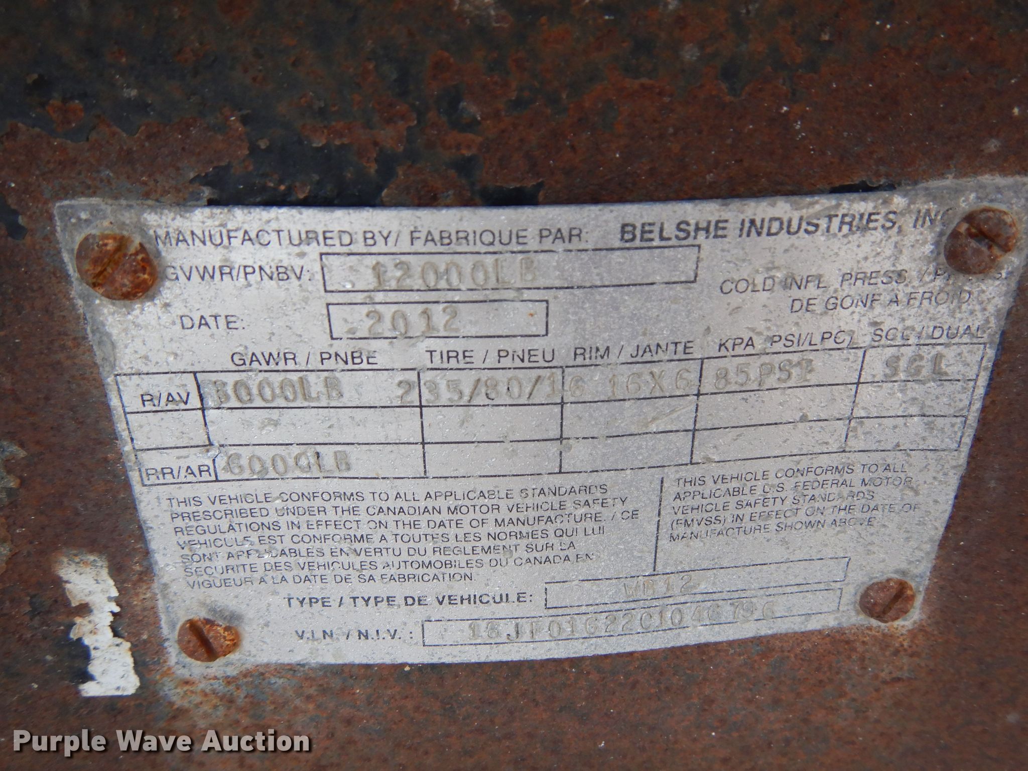 Purple Wave is selling a used Equip. Trailer in Kansas. This item is a 2012 Belshe WB12 equipment trailer with the following: VIN: 16JF01622C1046796