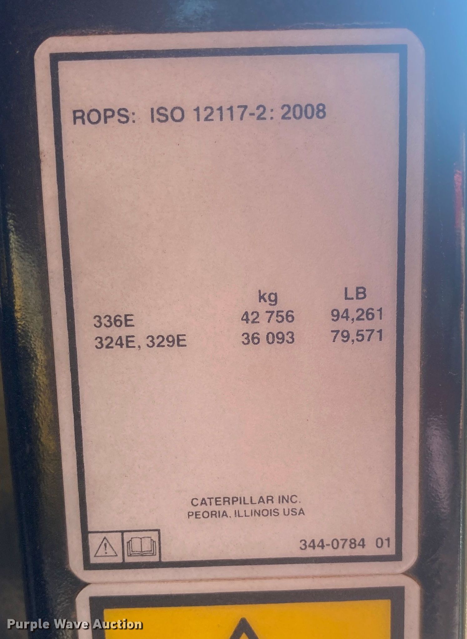 2012 Caterpillar 329E L excavator. Hours: 6,413 on meter, Serial: CAT0329EKPLW00981. Engine Caterpillar C7.1 Acert, Displacement: 7.0L, Cylinders: 6, Fuel type: Diesel. Transmission Hydrostatic, Two speed travel. Operators station Enclosed cab, AC, Heat. Features Boom Standard, Stick Stick length: 18' 5", Bucket Caterpillar, Width: 50", Teeth: 6. Tracks Width: 31", Steel, Grouser pads: Triple. Notes Glass cracked. Ross Construction. 3500 North York Street. Muskogee, OK 74403