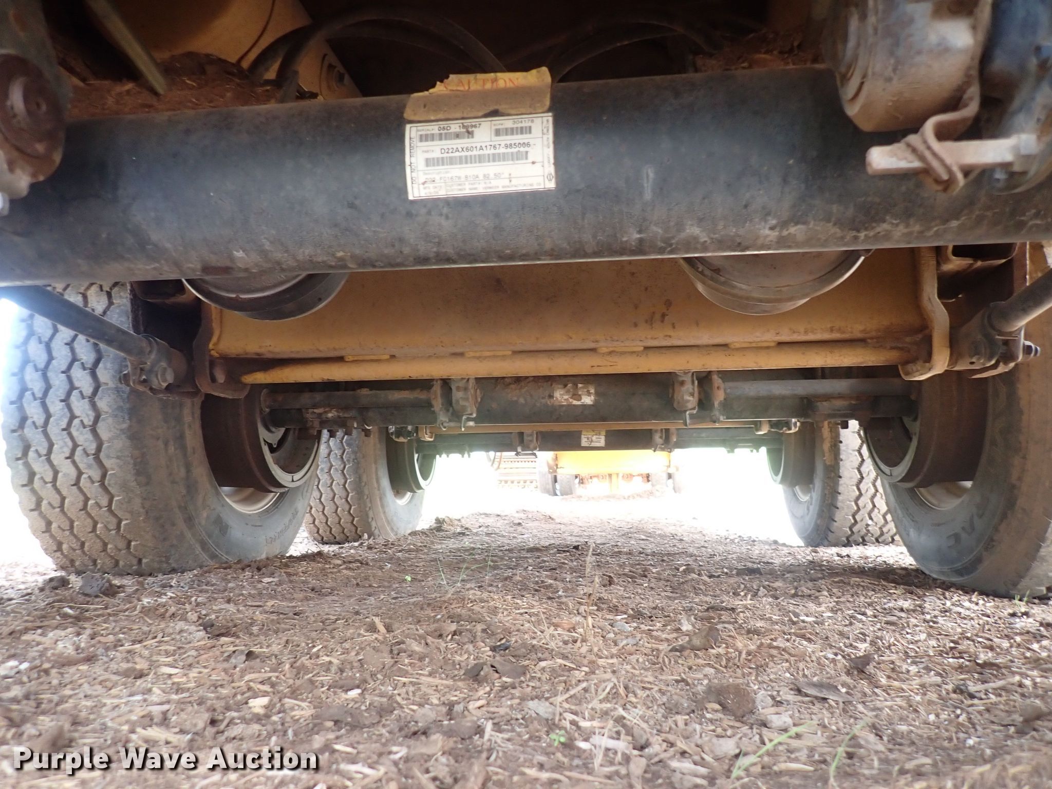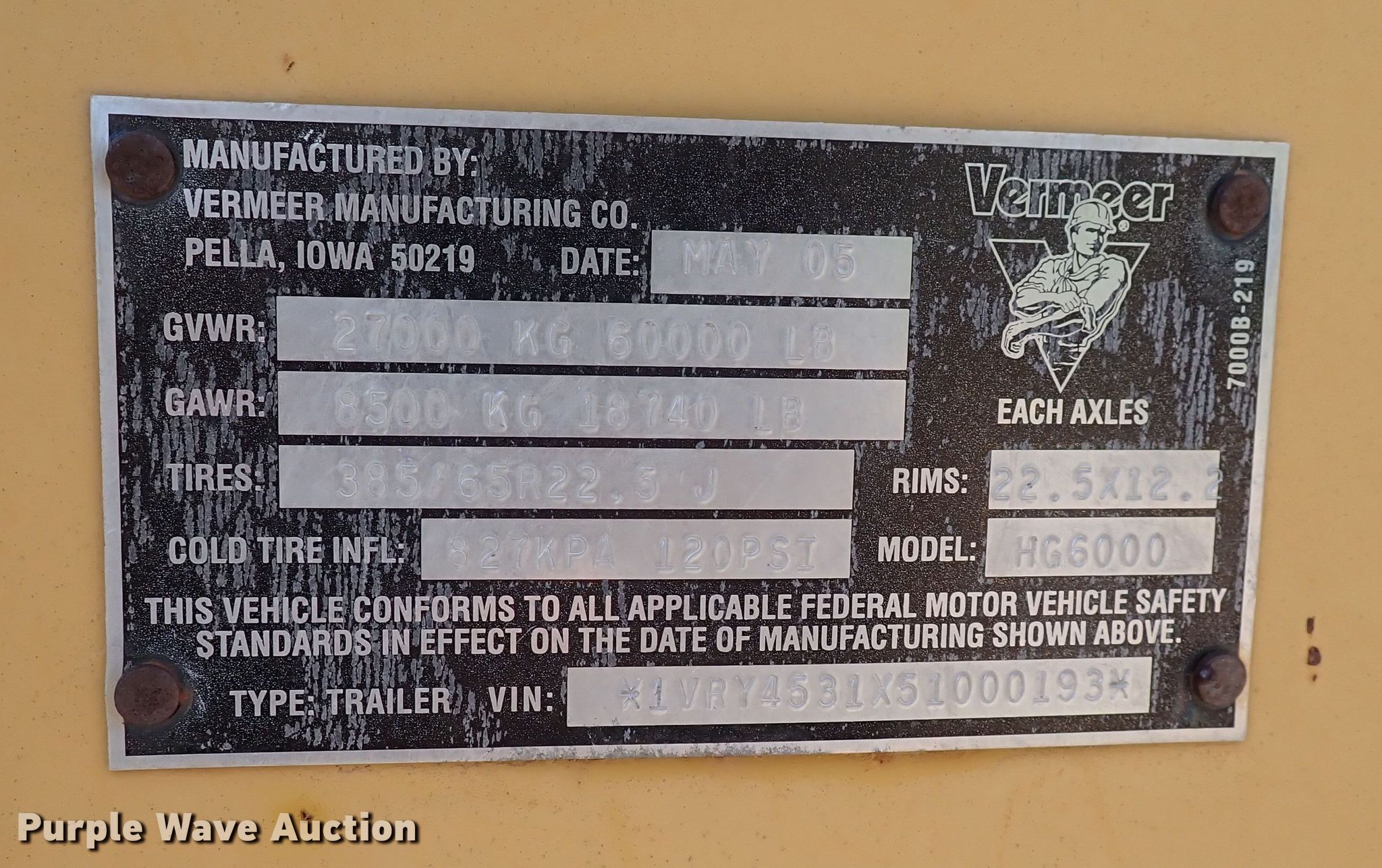 2005 Vermeer HG6000 horizontal grinder. VIN: 1VRY4531X51000193. Engine Caterpillar, Cylinders: 6, Fuel type: Diesel. Features Overall dimensions: 38' L x 98" W, Feed table width: 60", Feed roller length: 47", Infeed roller diameter: 36", Max feed height: 33", (13) bar teeth. Trailer Neck type: Detachable, Suspension: Spring, Brakes: Air, Axles: Triple, GVWR: 60,000 lbs, GAWR: 18,740 lbs, Tire size: 385/65R22.5, Dolly tires: 11R22.5. This is worksite support equipment and will not come with a title. Transfer of ownership documentation will be a bill of sale. Quality Timber Products Inc. 200 South Goddard Road. Goddard, KS 67052